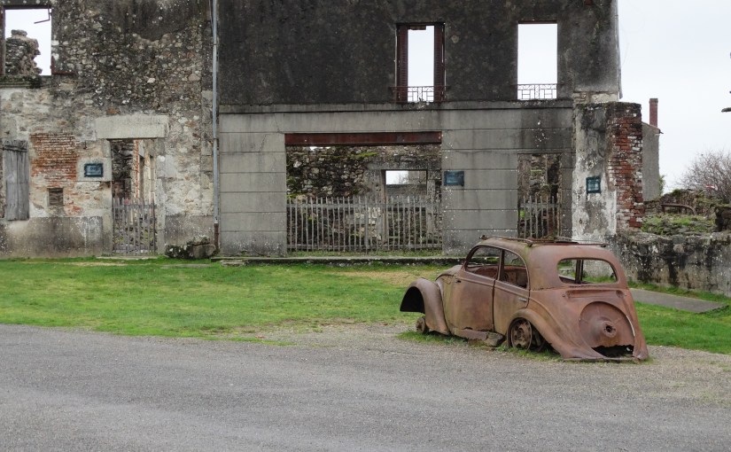 We left Dampierre on the morning of December 28 with much sadness that our time there had ended. With a fair wind we set sail to Limoges in the Central Massif. On the way however we called into Oradour sur Glane. It was a bitterly cold (below zero with some snow flecks) and misty day. The memorial was closed but the gate to the remains of the WW2 village lay open and beckoning. To me it looked like a village where a devastating fire had rushed through catching its inhabitants unprepared. In fact the fire was War and the result one of the all too familiar atrocities of War – the massacre of non-combatants. I have given the web link to the official site and the opening paragraph from the site. I have also added a few photos of what I saw.