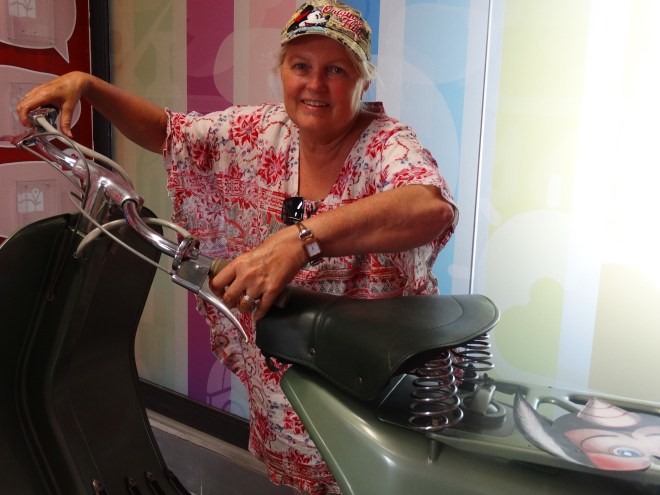 After completing the bus ride (the bus seemed to develop a fault so we got off too hot to go on) we split up as Veronica had found some shops. Kerry and I took a slow walk back to the car via the tourist information centre where we cooled off in the air-conditioning. There was a display of scooters in relation to an old Cary Grant movie (cannot recall which one) and so Mrs Young had to pose for the camera.