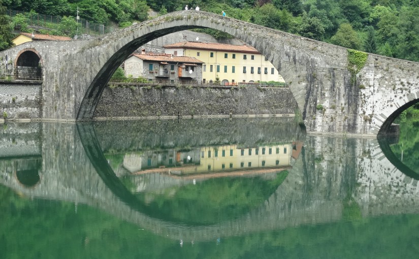 Today we set out to see some of the smaller villages around Lucca. First port of call was Borgo a Mozzano which is best known for Ponte della Maddalena also called “del Diavolo” (Devil’s Bridge). The Devil’s Bridge is located about one kilometre north of the town. According to the historical notices beside the bridge it was first built to provide the Lombards with safe passage through their territories avoiding conflict with other tribes of the area. Then the present day bridge with its extraordinary engineering was commissioned by Countess Mathilde di Canossa in or around 1500. The bridge’s majestic structure attracts thousands of tourists every year.
