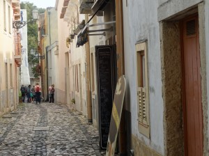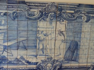 We head back down into the old city through the tables of restaurants with the view which epitomises Lisbon to the first “Jingjinha” outlet in Lisbon. It is a sour cherry liquor first sold as a medicine but at 25% proof it soon became too popular to be a medicine. Our last port of call was a restaurant epitomising the cuisine of southern Portugal and having the most fabulous ambience – tiled walls and Moroccan styled court in the centre of the building, they served bbq choriso with salted mushrooms and a scrambled egg. I don’t think the egg was all that special but the other two dishes and the red wine was great.