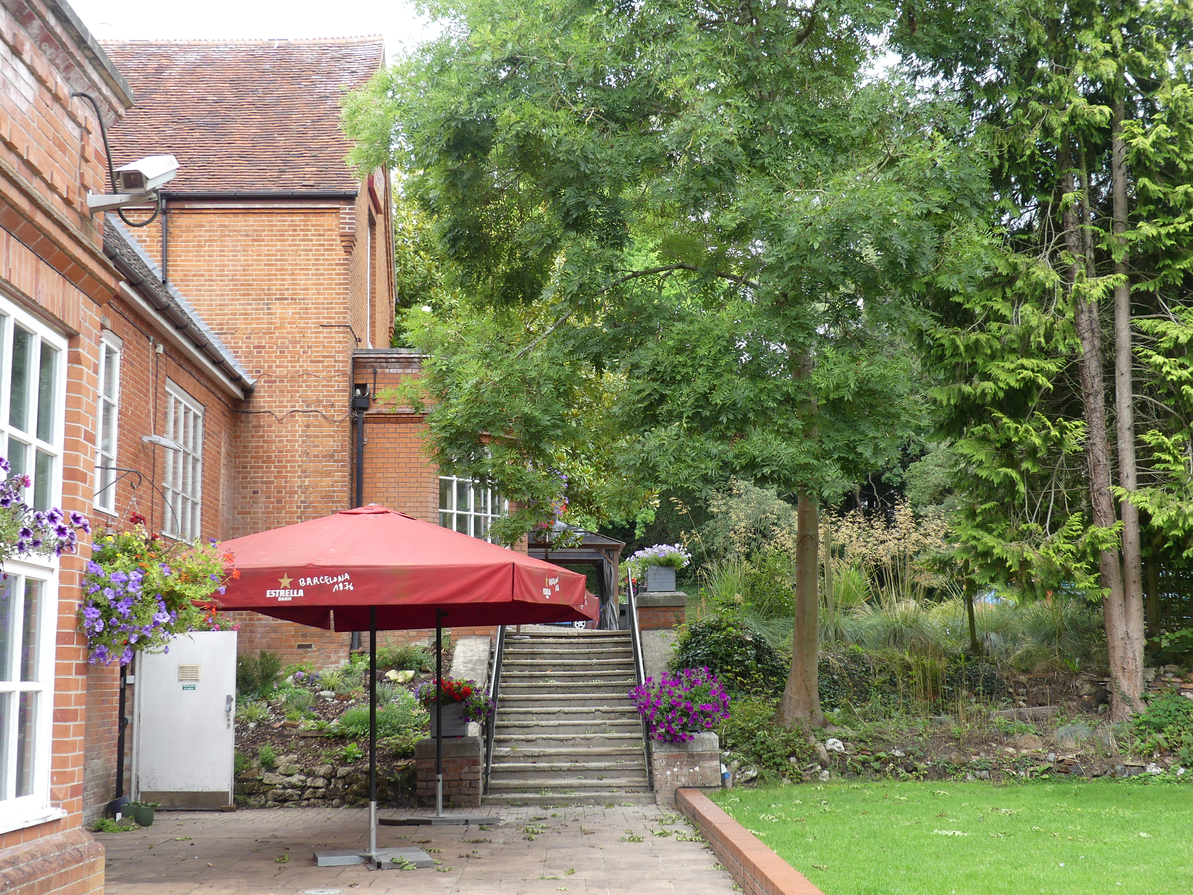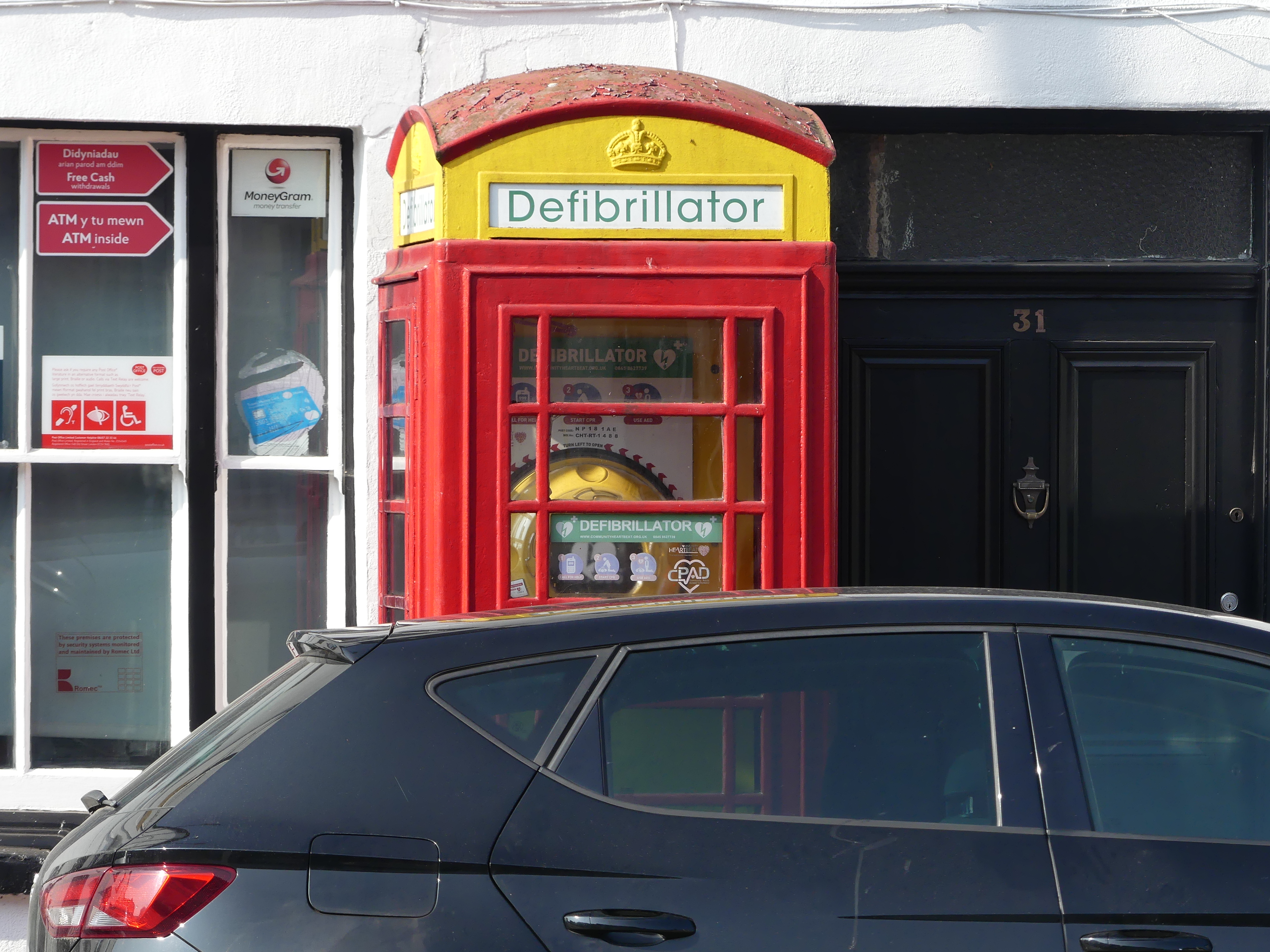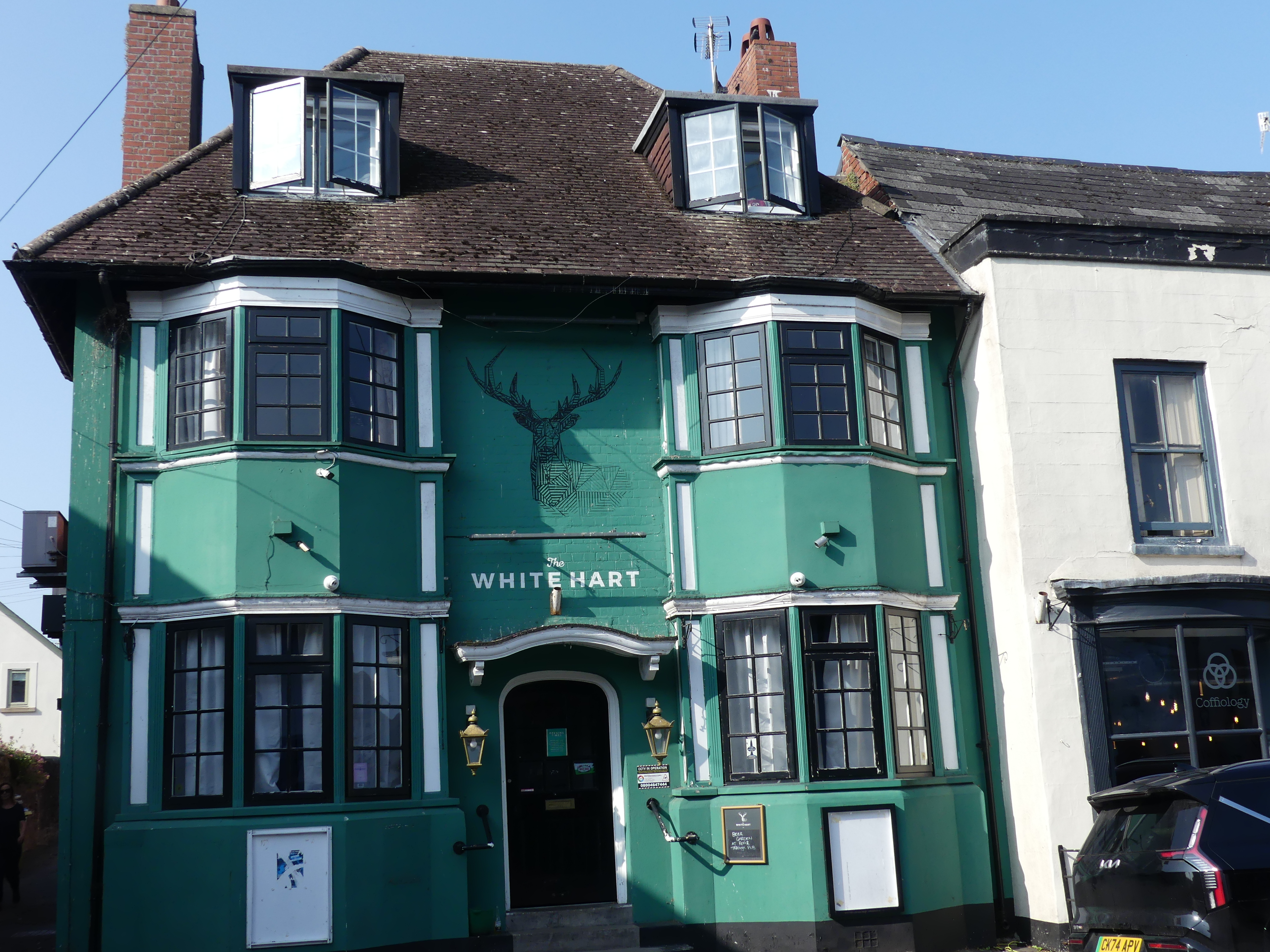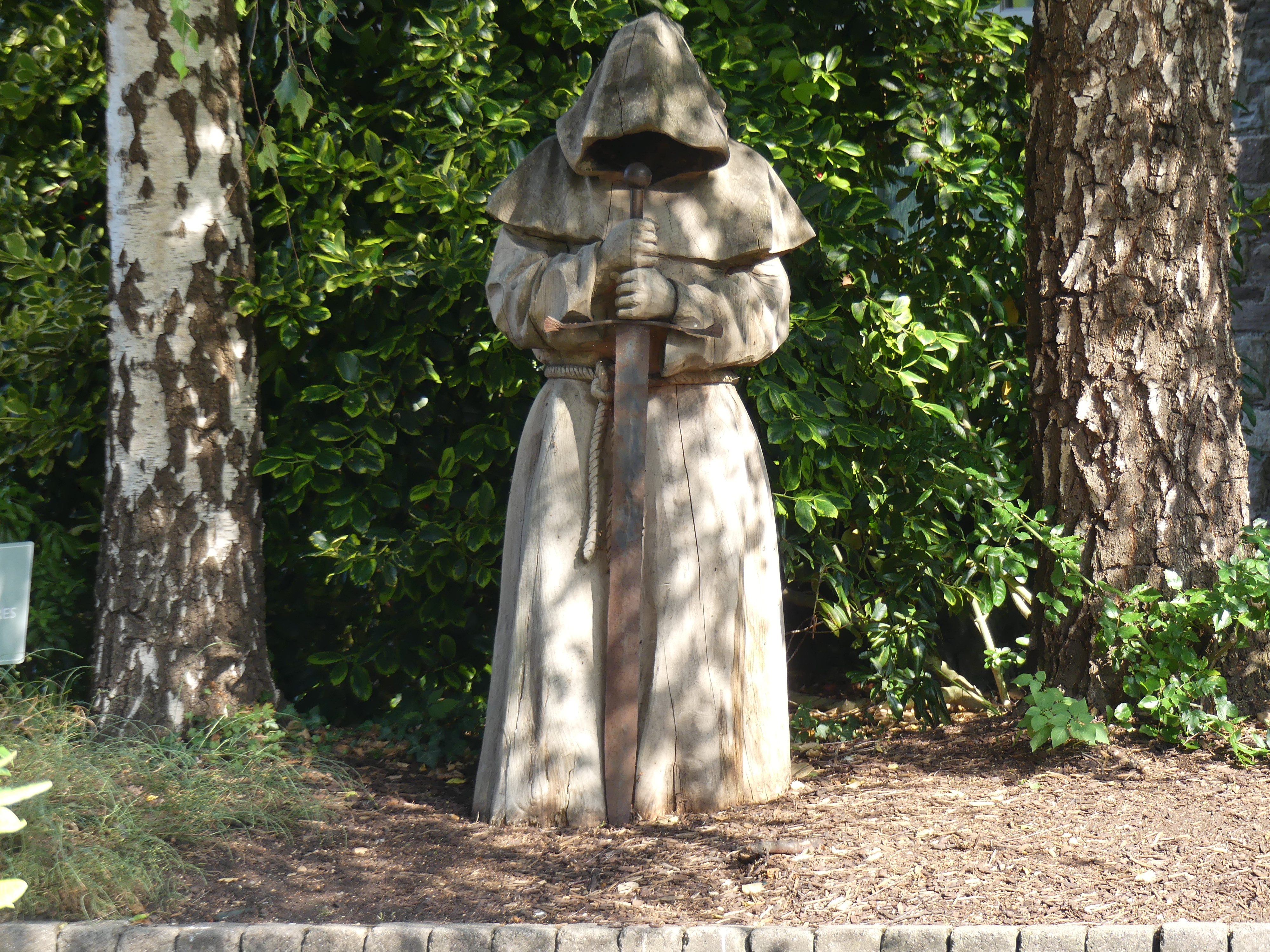 The pictures below take you on that stroll. First is the Priory – now an accommodation hotel but retaining the features of the former Priory with a pair of hares in the back yard. There are some interest wood carvings of a forest gnome, a priory student in cloche and priory guardian. Then there is the pub, a reused telephone box to house a defibrillator, a pretty pub, and the museum entrance.
