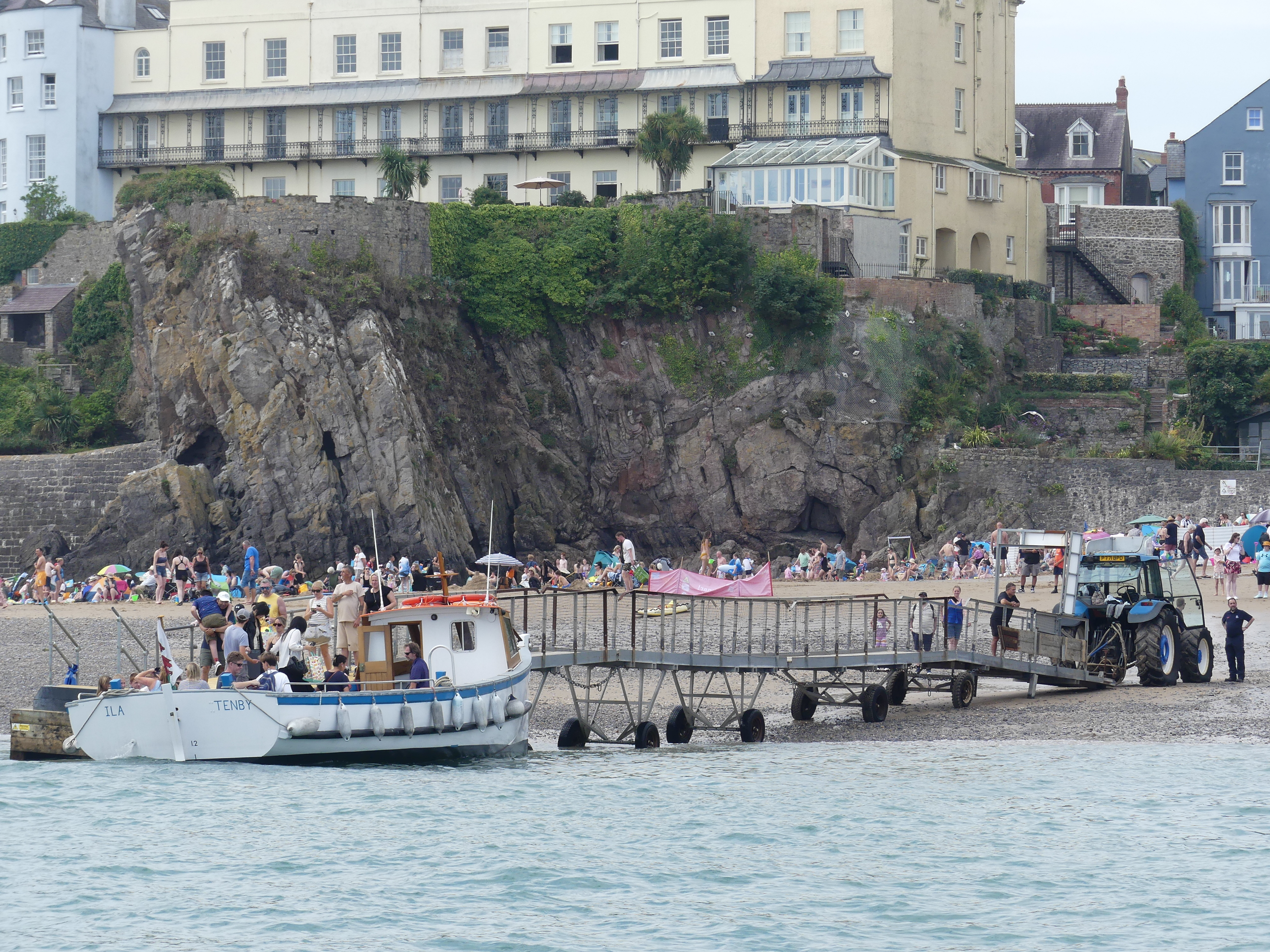 We spent a few hours on the island by which time the tide had turned. Although we had seen a tractor at the island ferry jetty it did not appear to be in operation. On the ride to the island, we had passed an island with ruins which appeared to be part of the castle ruins. On our return the tide had receded such that the island was now accessible on foot with people scaling all over the island and ruins, and the Boat Rescue volunteers boat shed was now on stilts. A tractor had pulled a portable landing down to the water and now we knew what it meant when they say, “the tractor will be in operation”. Our launch tied up to this mobile pier and all passengers clambered off onto the pier then the beach. There was a considerable stretch of beach to walk across to get to hard land. We followed the crowd across the beach up to the High Street in the town and there found a pub “Coach and Horses” with great ambiance and enjoyed lunch and a drink watching the beach goers and the shoppers going by.