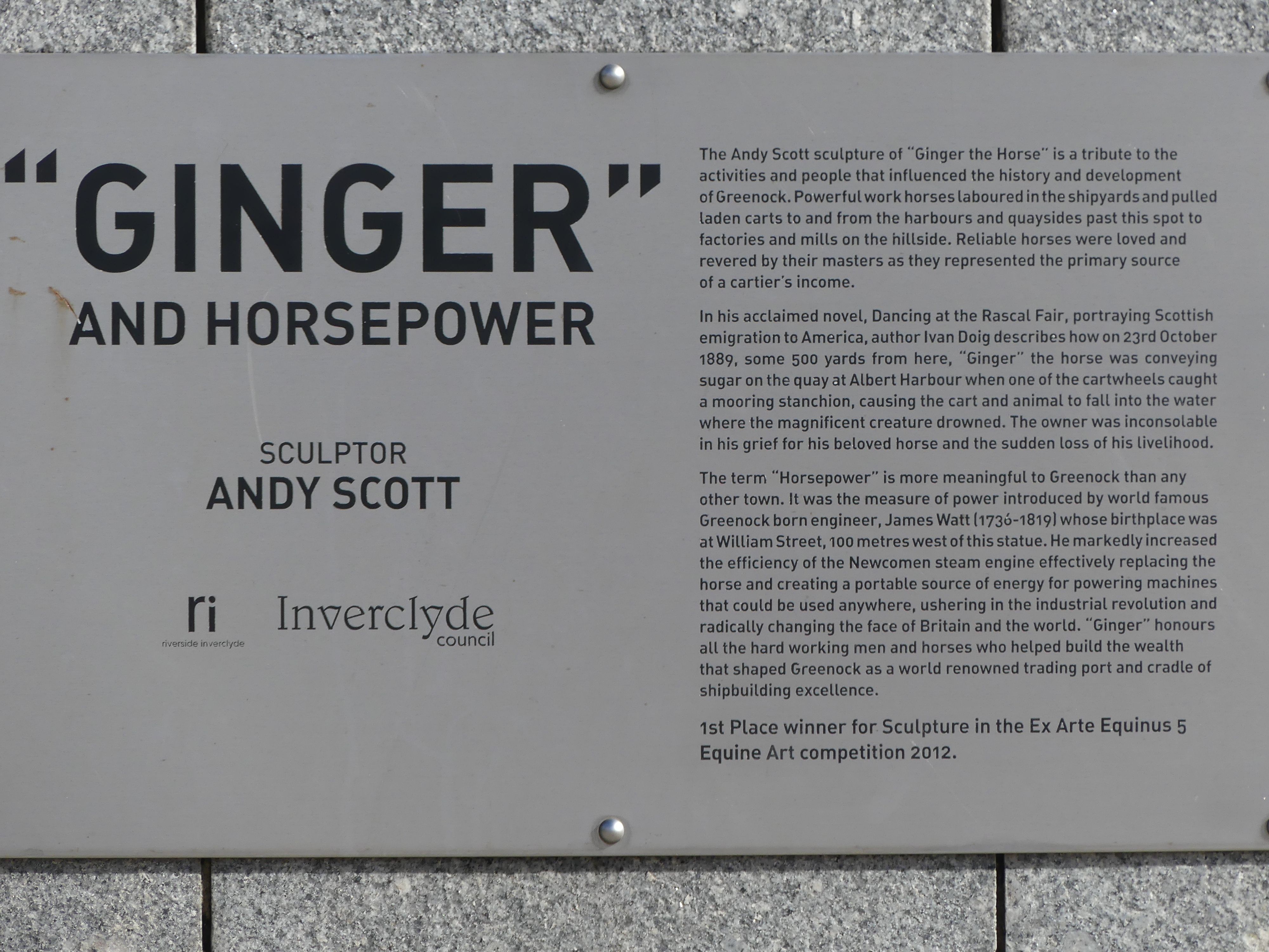 We walked from the ship toward the central business district. We passed a car missing its front wheel but didn’t know if it was well equipped thieves or someone without a spare tyre. After passing an Aldi supermarket we came to a major road crossing with an imposing statue on the other side of the road. It was “Ginger” a sculpture by Andy Scott designed to represent all the cart horses which pulled carts during the area’s great shipbuilding and maritime history. Inverclyde was once one of the most important shipbuilding ports in the world. When Greenock engineer James Watt wanted to describe the measure of power, he invented the term “horsepower” which is still used to this day. The name Ginger comes from an actual horse which drowned while transporting sugar on the quay at Albert Harbour in Greenock. A very emotive monument to the industry of Greenock.