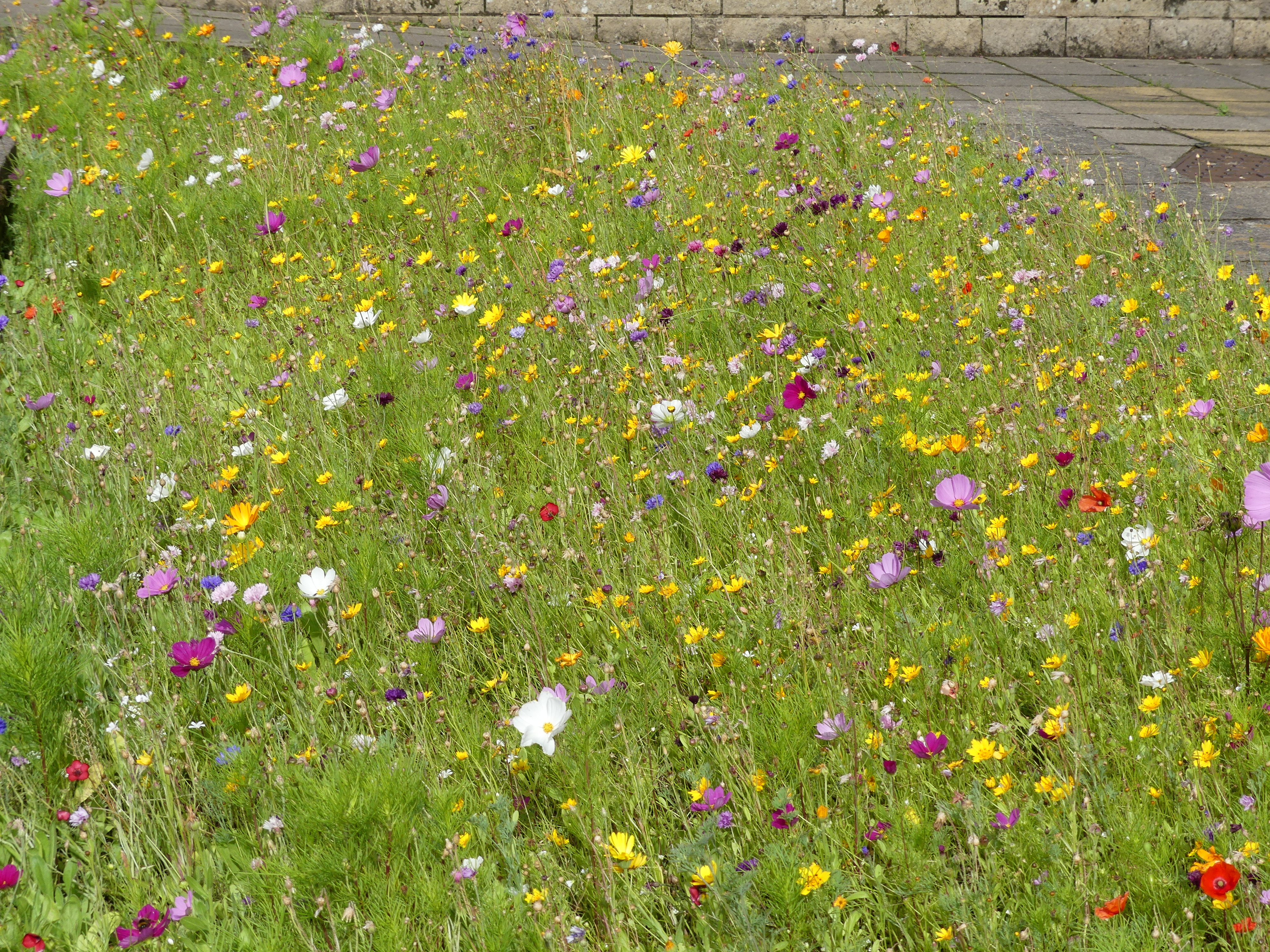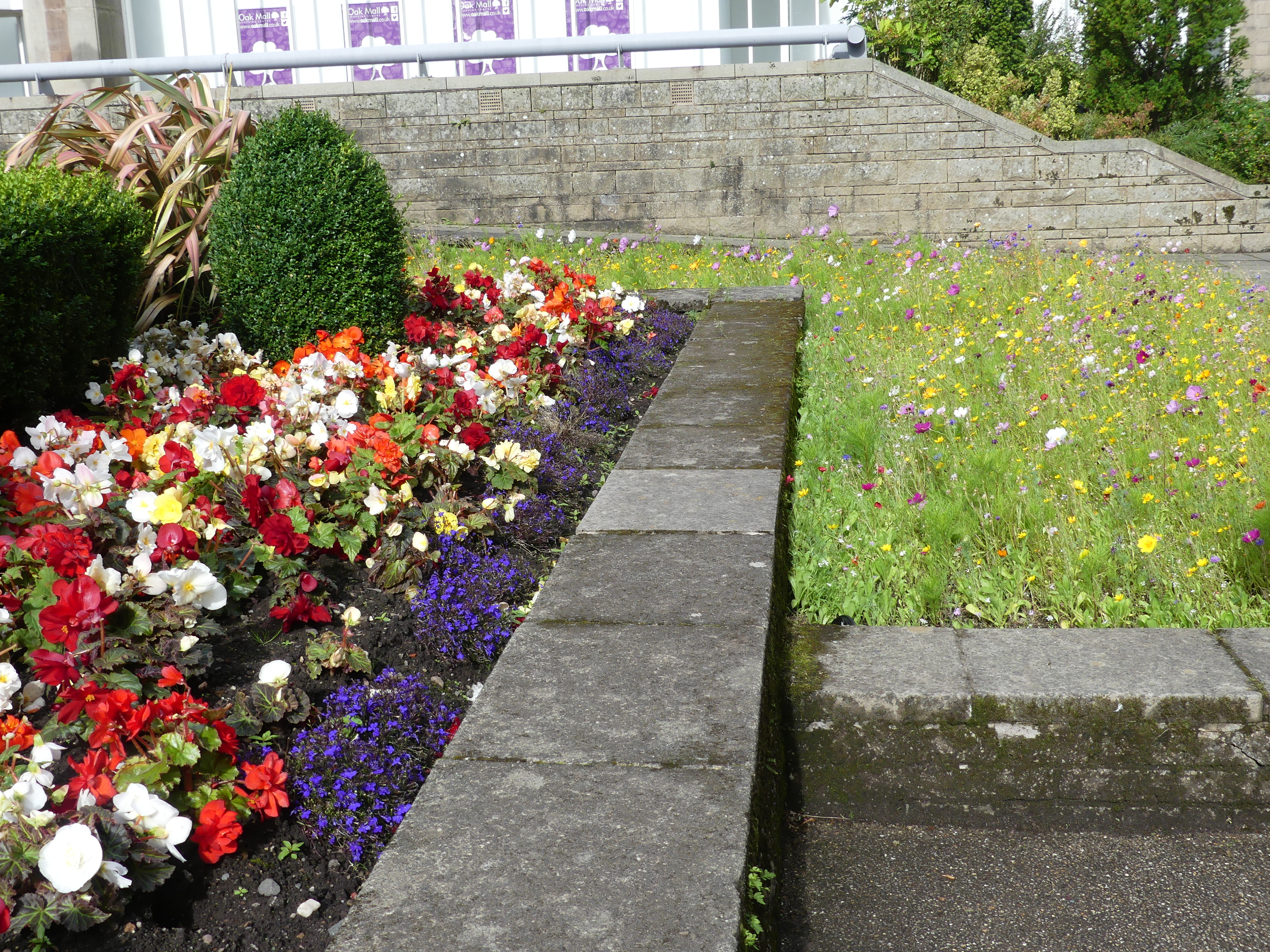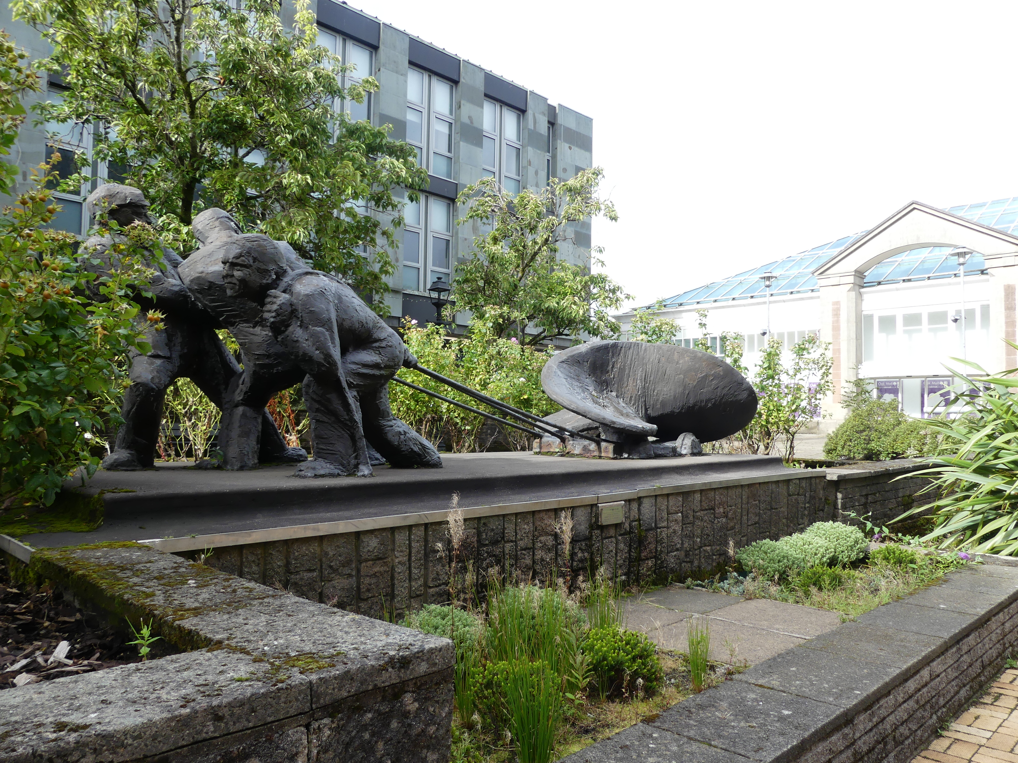 We continued our exploration following the road to the CBD passing some very impressive buildings of the nineteenth century including one converted to a Weatherspoons Pub named “the James Watt Building”, the Town Hall and the square in front of the hall. The sculpture of workmen dragging a newly forged propeller again references the industrial history of the town. The harshness of the stone and mortar is softened by the wild flowers and grasses in the garden.