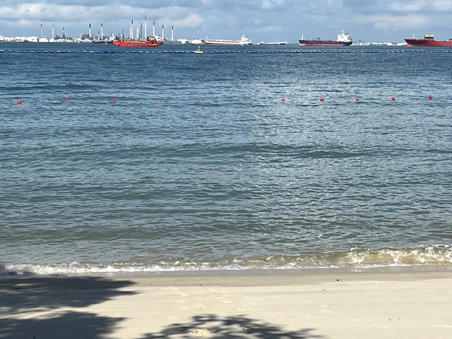 Interestingly the underground train and the monorail both reminded me of Beijing and Hong Kong – struggling against the tide of people trying to get into the rail car. Despite the throng when we arrived the place looked deserted. There were 5 to 6 stops on the monorail and maybe they all got off at earlier stations than the terminus. On arriving the directional signs took us to the beach where the only other people there was a family under a red umbrella. No waves to be found but the bay was cluttered with ships at anchor. Not much excitement there so we followed the signs to the ski lifts – yes we are on the equator and they are using ski lifts. The reason is that under the ski lift there is a raceway so you can hire the car to ride down the hill and you dragged your car up the hill by dragging it from your lift. I could not work out if the nets were to catch falling passengers or falling cars.
