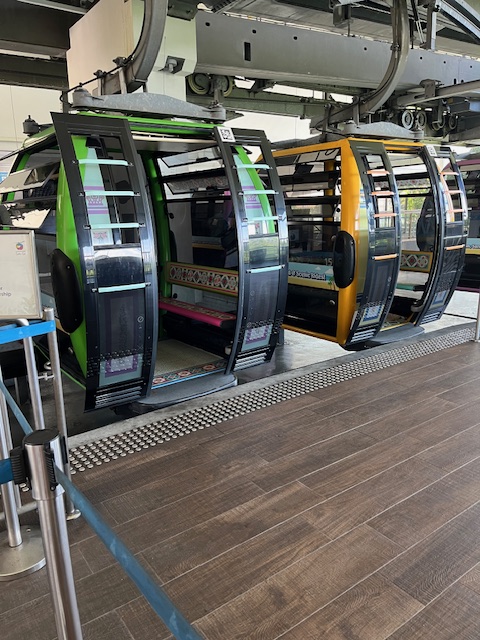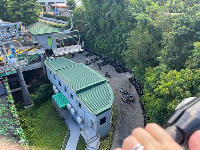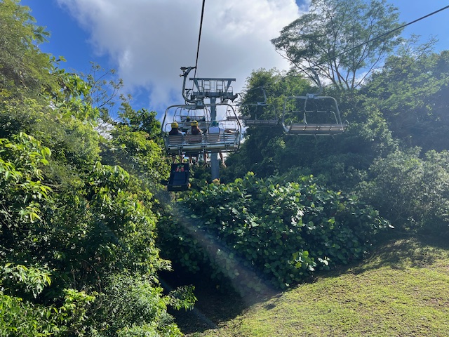 We weren’t ready for the race so we left the ski lift at the top station and walked around to the cable car which we thought was not operating. Yes it was operating but not the connections to the mainland. Still we thought we ought to catch the cable car to see more of the island. The cable car terminated at the treetop walk. Now the temperature was bloody warm, my disposition was cranky due to my various ailments and there was no lift to take us to the treetop climb. We stayed aboard and went back to the ski lift as we had spotted an air conditioned ice cream shop with tables and chairs.