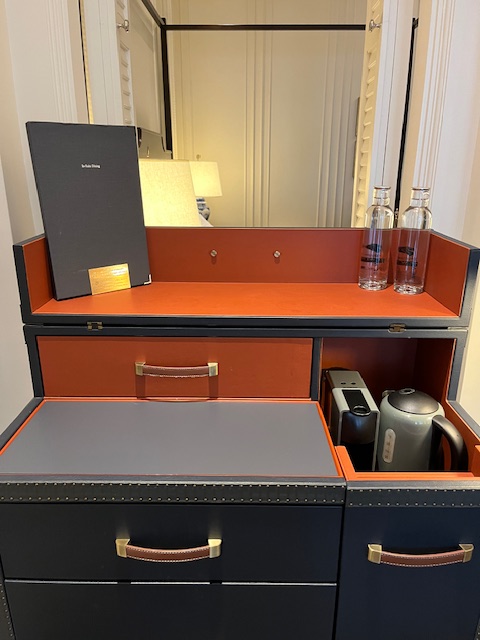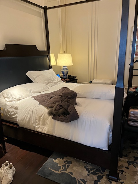 Finally our room was available and we were guided to the room (formerly part of the stables of the original hotel) where we met our butler who guided us through the use of the tablet to operate the room. I will mention an incident that happened on the 2nd day of our stay. Kerry was certain we had to catch our flight so rather than check we packed and got ready to go by limo to the airport. We said good bye to the hotel and I have included her picture with the Doorman. We drove to the airport only to be told our flight was the following day so we cabbed it back to the hotel and asked for our keys back for 1 more night. They assured us we were not the first to make that mistake.