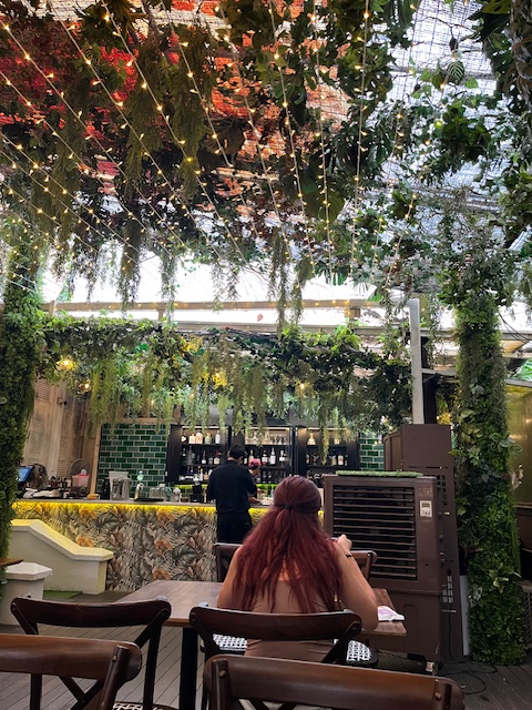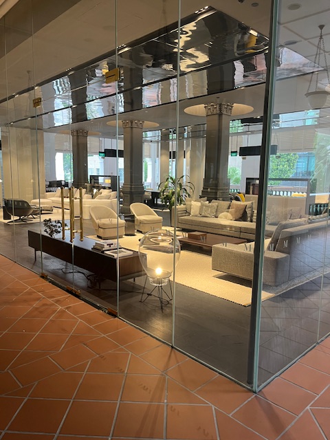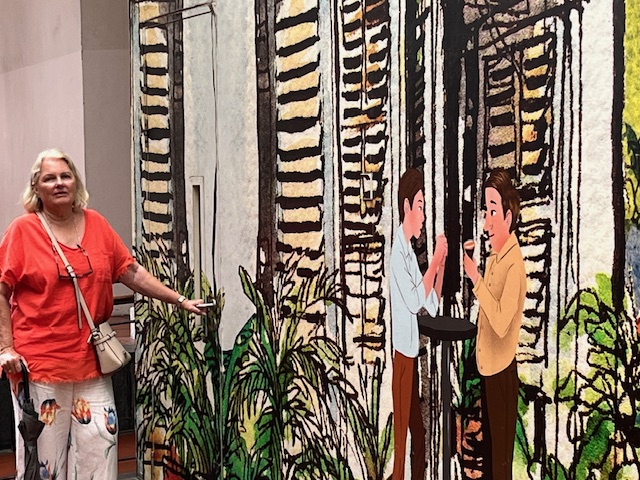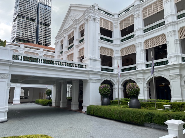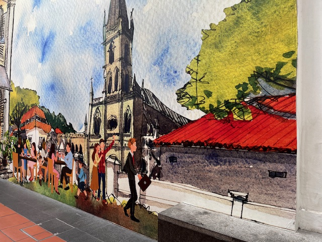 Raffles Singapore began as a private beach house in the 1830s, leased by the Sarkies Brothers in 1887 and reopened as a grand hotel named after Sir Stamford Raffles, quickly becoming a legendary landmark for wealthy travelers with its colonial elegance. It expanded significantly through the early 1900s, hosted famous guests like Rudyard Kipling, faced challenges including bankruptcy and Japanese occupation, was declared a National Monument in 1987, and underwent major restorations to preserve its historic grandeur for modern luxury, reopening in 1991. It was impeccably presented and continues to provide grandure and luxury to its guests. There is a hall that has been turned into a hall of fame with pictures of all the wealthy and important people who have stayed in the hotel. There is a roof top pool, dining spaces, bars and other luxurious retail spaces. It has a shopping arcade with 40 speciality boutiques including the high end brands of course. We made a visit to the Long Bar and the gift shop but took a look at everything else. One thing the hotel does not have is a simple cafe serving coffee but outside in the arcade across the road we discovered just that, a simple cafe. The arcade wall had been decorated with street art of the life style of Singapore. Two of the paintings are pictured below.