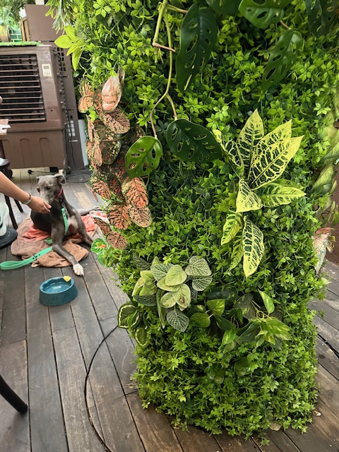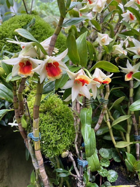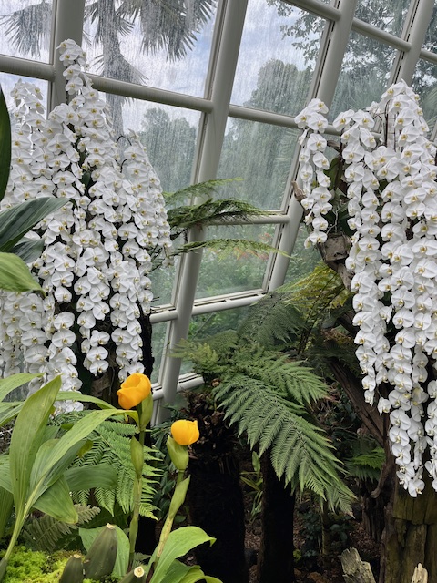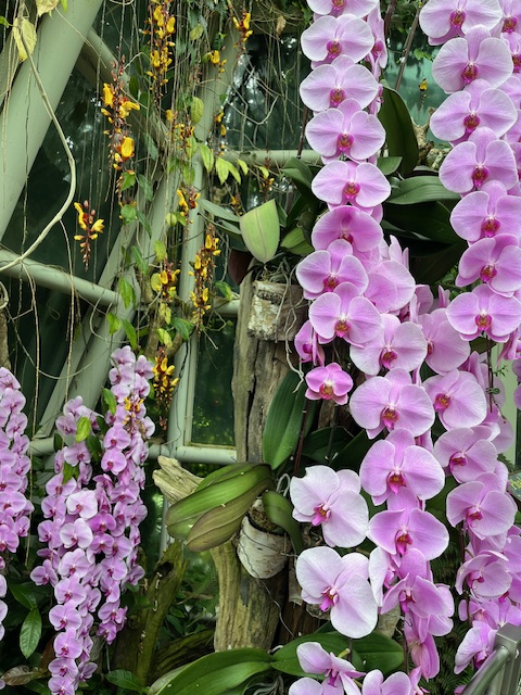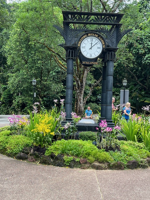 After the fiasco concerning the limo drive to the airport, we decided to visit the Botanic Gardens and in particular the National Orchid Garden. Again the temperature was equatorial and humid so our walk of 1 klm to the orchid gardens was draining. At the 800m mark we found a coffee shop and took a break. The fellow traveller sitting in front of us had brought her greyhound who also looked hot and bothered like us. After a recovery coffee we battled on arriving at the entrance with its clock. After paying the entrance fee we stepped into a wonderland of colour.