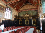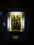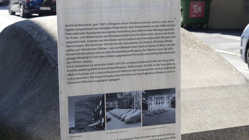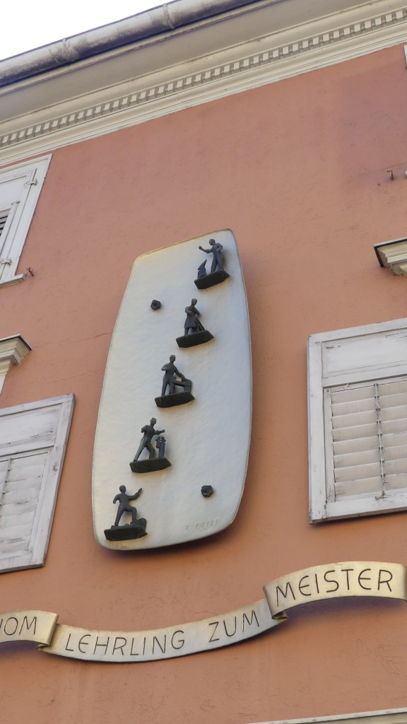 After the excitement of the boat trip, we decided to follow the self-guided tour provided by the Tourist Information Centre. Now the first stop was a shop selling various forms of alcohol. See the first photo below. Here I was persuaded to sample a Swedish single malt whisky (or do you spell it the Irish way “Whiskey”) and purchase 500ml of the brew – many of my friends will be clamouring for this. The next few photos depict some of the older buildings in the narrow streets of the old town. But number 5 is the front door of a residence which is little more than 1 metre wide at its entry – Bregenz’s smallest residence. Next is the adjoining building which appears to have been a type of craftsman’s lodge judging by the figurines displayed on the exterior. By the time we had climbed to the oldest part of the town we came across what might have been a moat around a fortified residence which proved to be a former monastery. The parish church although not connected was on the outside of the former moat but separated from surrounding land by its own moat. Inside was a clean and fresh-looking church and of course it had a confessional (you know whom I am referring to VC). After leaving the church we found a set of stairs which now allows movement between church and monastery which has been separated from the residences constructed where once monks would have toiled. The old castle gate remains with it an open portcullis and the track down to the town. In the town we found this strange feature on one block of residences – it looks like someone was buried but manage to stick their arm out of the coffin.