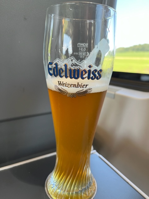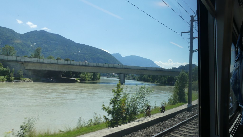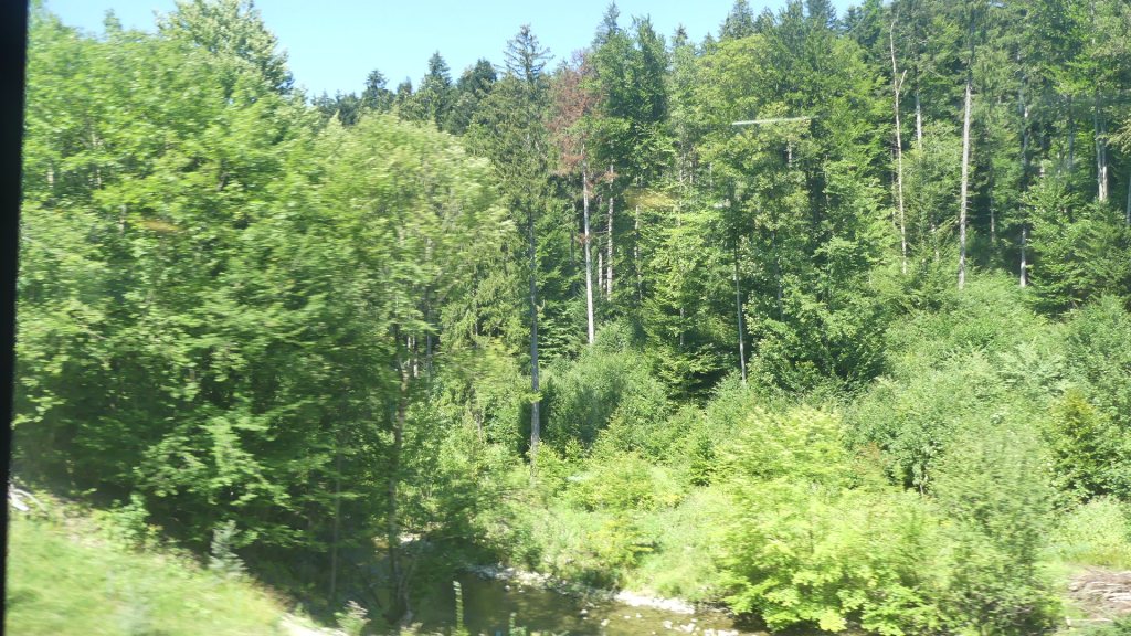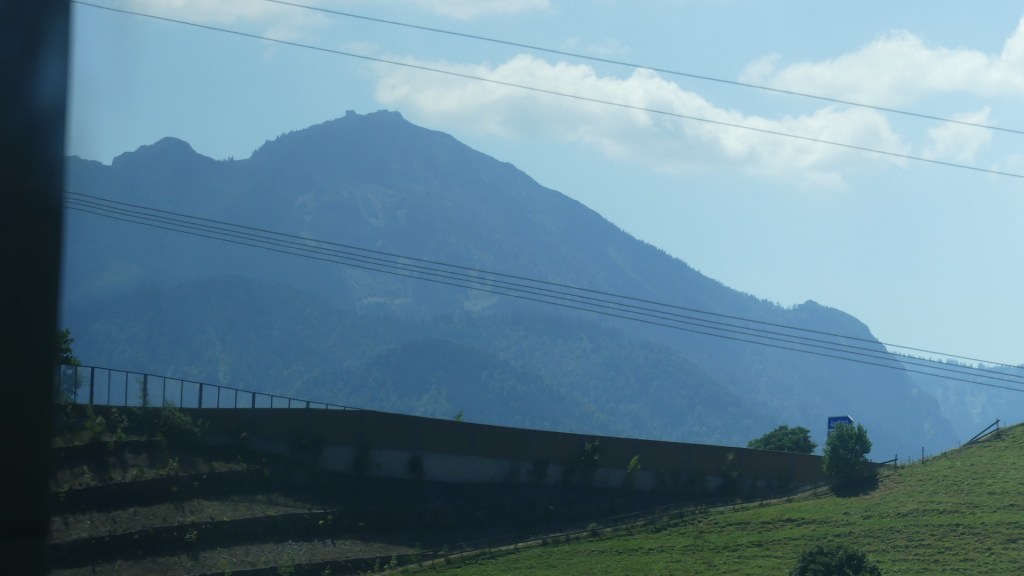 Goodbye Vienna. Our preplanning worked well and we might have caught the train on time if Kerry had not left her handbag in the train station waiting room. Literally she was stepping into the train when she realised it was not there. She ran back to the waiting room, but we knew we had missed our train. However, unlike aeroplanes we could catch the next one with our luggage and the EUrail pass gave us that flexibility. We had chosen first class seats because this is a 7 hour journey with no stops. There is a dining car, and we could order from the menu and get in seat service. The train reached speeds of 221kph and taking photos was often difficult, but we managed to capture some of the pleasant Austrian countryside and Austrian Alps. The following photos trace our journey from outside Vienna to Bregenz and you may notice the progression from plain to Alps in the west.