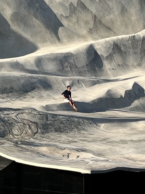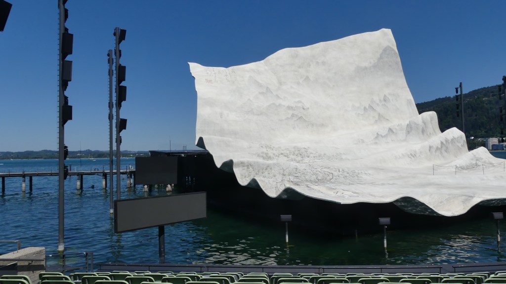 We are here for our wedding anniversary. Kerry promised herself to return and see a show at the Bregenz Theatre in the Lake after we had stumbled across it in 2015. In 2015 the Opera was “Turandot” and the stage was the Great Wall of China and the Terracotta Army. This year it was Puccini’s opera “Madame Butterfly”. The stage is a deceptively simple white background with hidden stairs doorways and a hole for an enormous flagpole. Under the stage (rows F, G & H) banners advertising the show and pictures of the previous stages hence the photo of the stage which we saw being constructed. This magnificent stage is built at the western end of the lakeside walkway with Bregenz Bahnhof (train station) behind it. There is no orchestra pit but rather the orchestra plays on a sound stage inside the auditorium behind the patrons seating. This outdoor seating is erected leaving space between seating and stage for boats containing parts of the stage scenery to sail past during the performance.