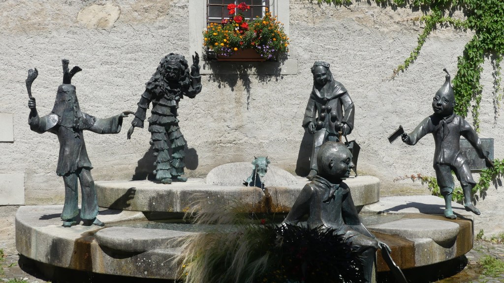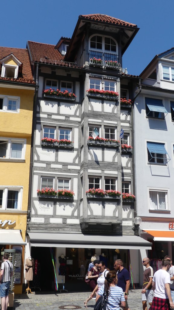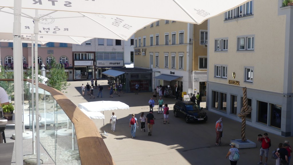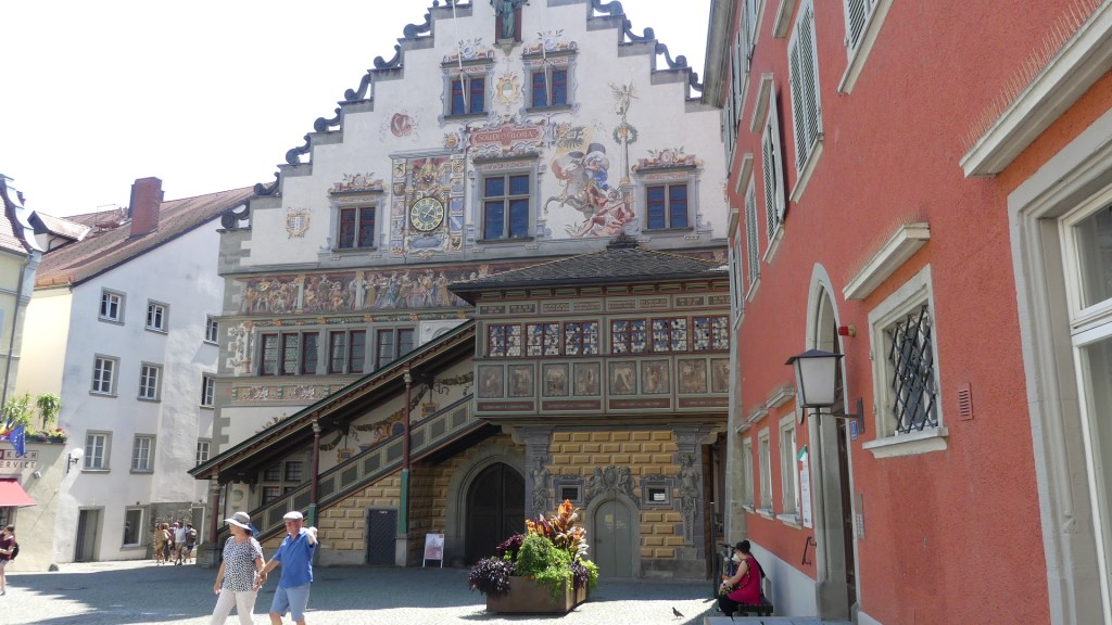 Several of the old town buildings are decorated with art works some portraying the first use of the building. In the main square stands the local parish church constructed with the eastern Christian church “onion” dome. Bregenz Summer Festival is on, so the streets are decorated with flags declaring that to be the case. In the case of these photos, they were taken when we had coffee at a restaurant above the square in one of the modern buildings which looks abhorrent and out of place. Like the monument to Indian Snake Charmers – the knotted rope statuary. No photo of the abhorrent building.