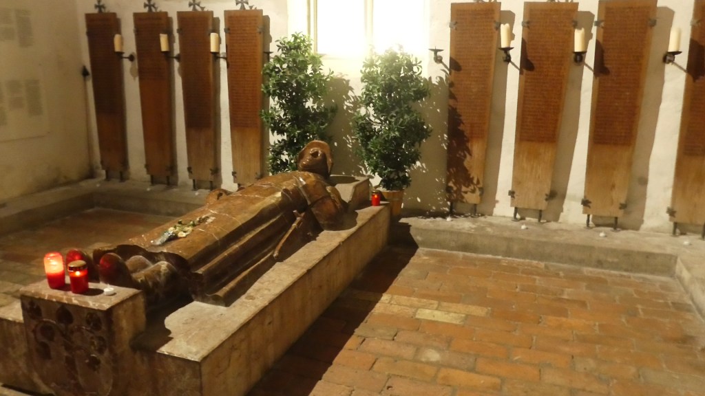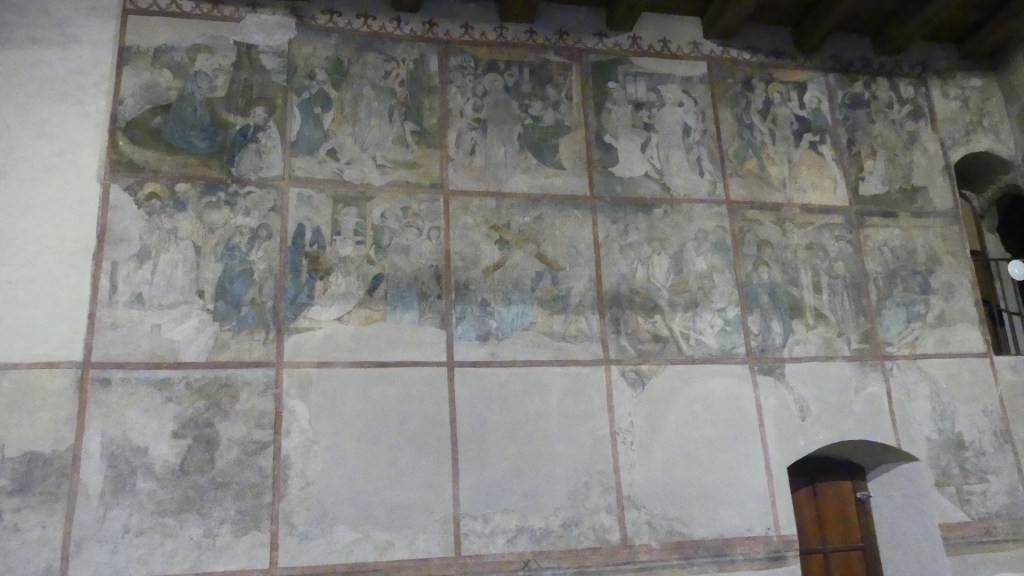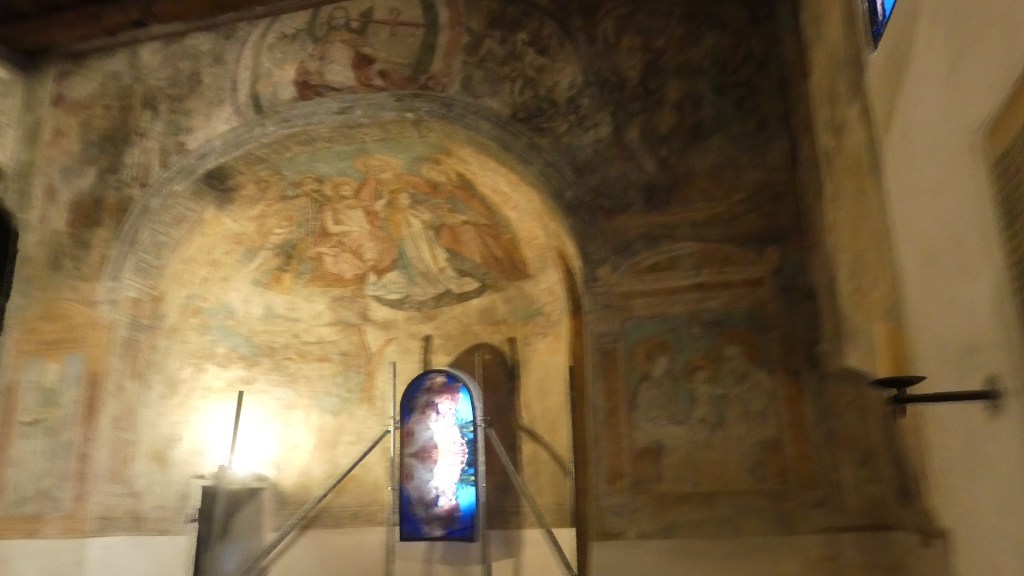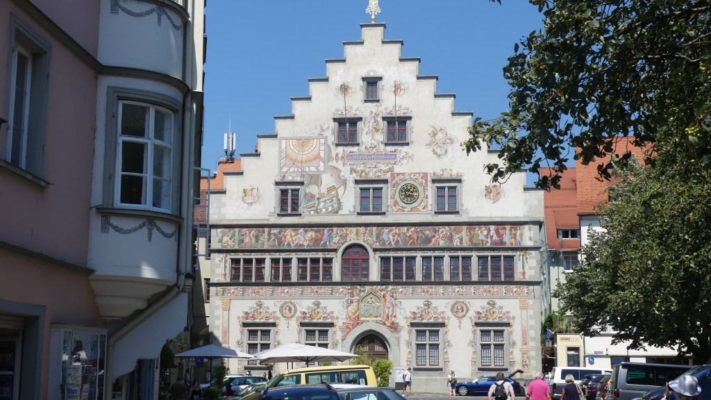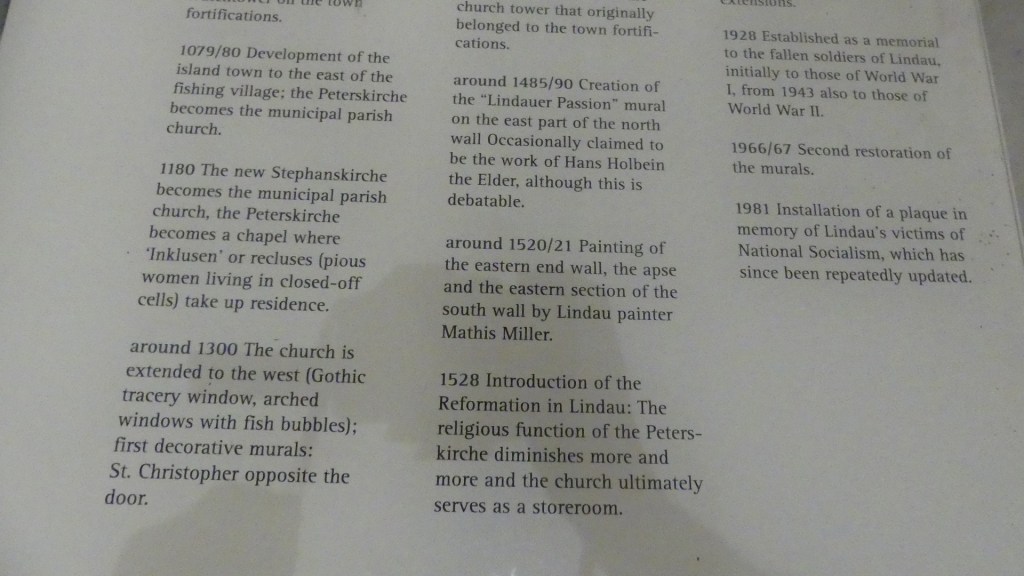 We had not been impressed with the boat tour so the following day we tried direct travel to selected places; Lindau Isel (Lindau Island) and Fredrickschafen in the Bavarian-Swabian part of Germany. By ferry Bregenz to Lindau Isel takes 1 hour and 2 hours to Friedrichshafen and we were to find out only 20 minutes by train to Lindau. We purchased a return journey on the ferry to Lindau and on the trip, we spotted a modern Zepplin (Dirigible balloon). Arriving at Lindau Is. visitors are greeted by a resting lion and lighthouse from the early days of trading between villages. A tower which formed part of the defences of the harbour also remains. The foreshore is hotels and restaurants, and everyone had the same idea as us to visit the island. The pictured building is the Rathaus or Local Government Hall. The other photos are general street scenes. This is an island, and it is connected by a causeway to the mainland. Near that causeway bridge we found the remnants of a church predating the 11th century. The Peterskirche is the oldest sacred building in the city of Lindau. The essentially Romanesque church goes back to the 11th century and is of supraregional importance due to late Gothic wall paintings often attributed to Hans Holbein the Elder. It stands on the western outskirts of the old town and has housed a war memorial in the form of a WW1 German soldier since the 1920s.
