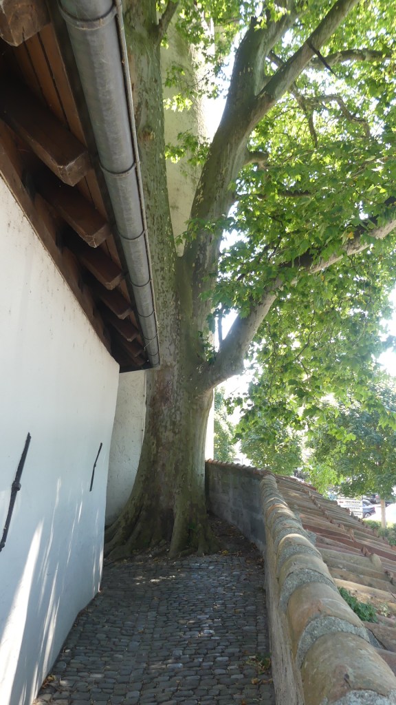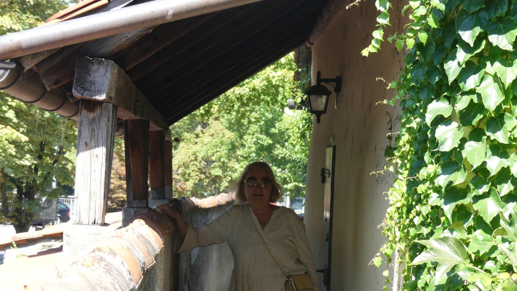 After returning to the town level, we walked along one of the streets bounding the old town so there was a mixture of old and new. Amongst the houses we encountered a parked car with a car cover over it clearly been there for years: so long in fact the town has declared it street art and posted a sign about the “artist”. It is all in German with no English note but our enquires lead us to understand that some local “artist” bought himself a new Porsche and was disappointed with it, so he put the cover over it and walked away. This was in 1947. His studio is beside it and an eclectic bunch of stuff sits in the yard of the studio.