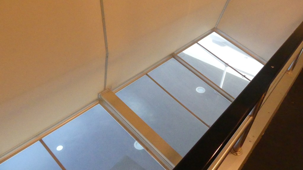 After the impressive overview of the partial model from the outside, the folded-down retractable aluminium stepladder invites visitors to go on board. It leads into the lower deck, the B-deck, which has a bar, a smokers’ lounge, and toilets. The passenger cabins are arranged on two decks, stacked one on top of the other. In the cabins, visitors can experience the special inside ambience of a 1930s airship and get to know the technical aspects of this aircraft. The beds inside the cabins are made of aluminium. Every cabin has a wall-hung wash basin (with running hot and cold water from a tap), a curtained wardrobe niche, a folding table, a stool, and a ladder for climbing into the upper bunk. The cabins also have electrical lighting and are ventilated and heated.