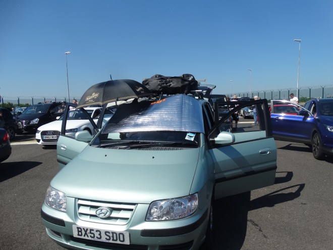 We sat in our car with screen shade and umbrellas raised – the temperate was approaching 40C and no one knew how long we would be there. Motor Bike riders appeared to be pushing to the front of the line and some pretty hostile car travellers confronted them. The Austin Healy Club had returned from a tour on the continent and one in particular was having considerable trouble controlling the temperature of the car. David would end up pushing the car through the immigration gate. We also made acquaintance with a couple in a Ferarri which with its V12 motor found it hard to idle waiting for the booking gates to be opened. Then like pulling a plug in a bath everything started to move. We made it through relatively quickly only to find that with the luggage on the roof we were over the height limit for the double decker cars. So we lined up with the vans etc.