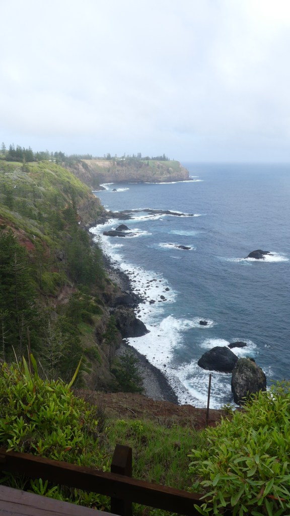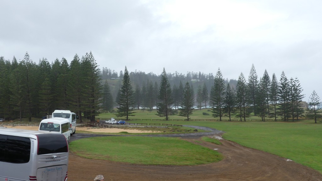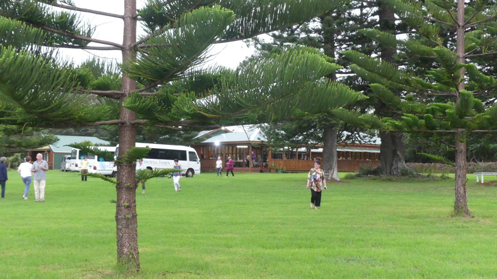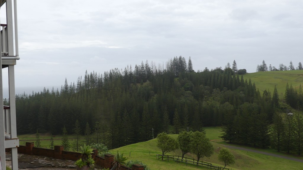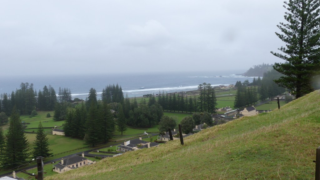 We landed at Norfolk Is/Burnt Pine international Airport. The airport was built by Australia and New Zealand during WWII as a base for the NZ “N” force but abandoned when they realised it was too far from the action. Fortuitous for Norfolk Island. After walking across the tarmac and collecting our luggage we boarded our ride to the apartment. It was at this time that we experienced the weather that would continue until the afternoon of Wednesday week – windy overcast and occasional drizzle. The Norfolkers were not unhappy as they have been through a dry spell.