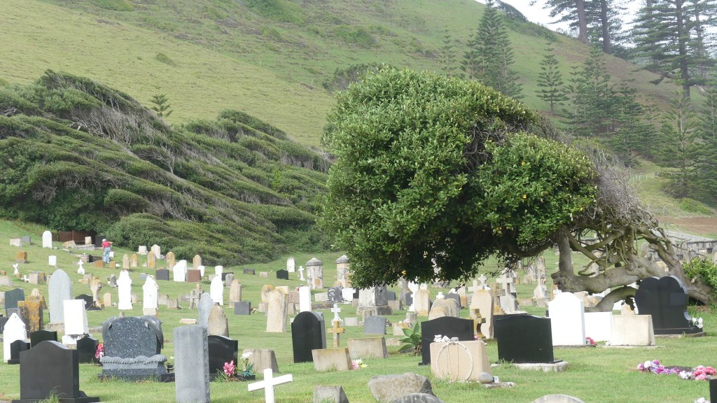 The cemetery contains headstones of military officers, convicts, Pitcairners and Norfolkers the unknown and the famous like Colleen McCullough. Battered by the south easterly winds to the sounds of the crashing of the waves, headstones from 1793 to the present can be found. Many are defaced by the wind so who knows the earliest date on the oldest headstone. I have uploaded my photos so that you can read the headstones for yourself. Here is the history of the island. Note the trees bowed to the wind or are they reading the headstones for themselves?