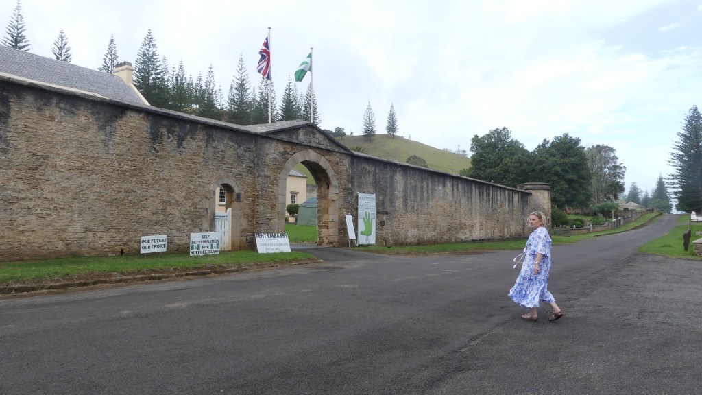 There is opposition to the reforms, led by Norfolk Island People for Democracy Inc., an association appealing to the United Nations to include the island on its list of “non-self-governing territories”. There has also been movement to join New Zealand since the autonomy reforms. Bindi is one of them. Note my photos show the UK flag flies over the gate of the garrison just above the protest sign for independence.