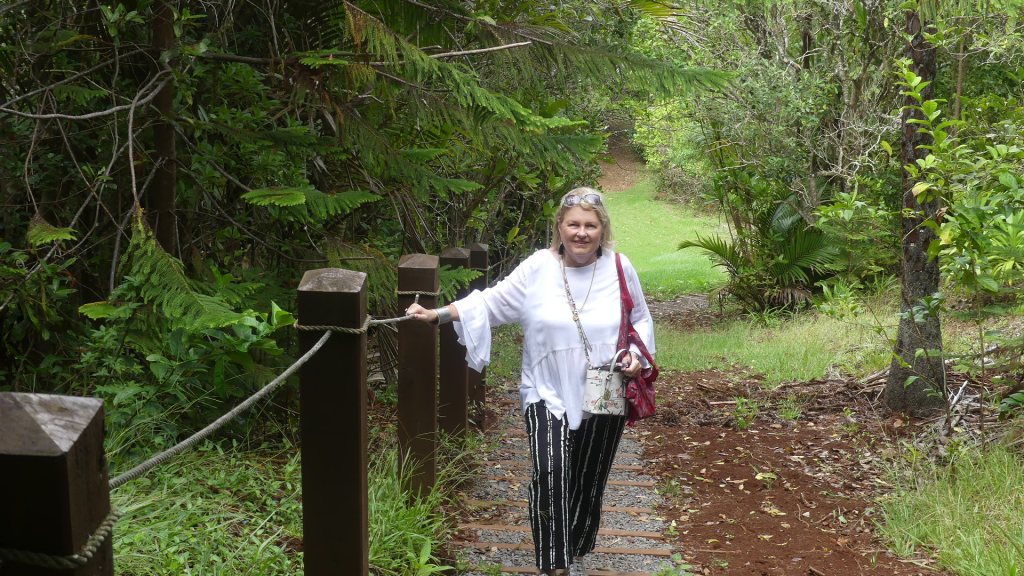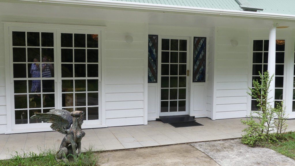 I guess by Norfolk Island standards the house may be a glamourous house. I found it ordinary from the exterior, eclectic in some of its interior and ostentatious in some rooms. Our guide was the housekeeper who seemed to be bored with showing tourists through her house. There was fine glass ware in the dining room but it remined me of the displays in DJs, there was expensive wall papers and expensive looking Asian furniture, but it did not tell me about the author until we got to her office and library. A plain working office and an extensive library of old research books which we could not enter but only observe from the door. The bookcases lined the walls and then were set up in rows. I doubt there was anything other than books and bookcases in the room. There is a covered patio where ferns in baskets hang from the ceiling annoyingly low amongst which also hung Tiffany stained glass lamp shades. We congregated on the patio seating in the available chairs and basically looked at the ferns, the lamp shades and each other for what must have been 30 mins. Our guide answered random questions with short, clipped responses then suddenly arose and led us from the patio through other rooms. I found it weird.