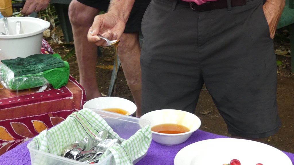 We had booked a tour called “Tastes of Norfolk” where we visit a farm or two and try the local produce. Well there was some excuse about the farms not able to be visited so we were going to the Sunset Bar where we would have a chat eat some food from their kitchen and drink some grog. Actually, that is probably a fairer representation of the locals than of the “Tastes of Norfolk” and its farms. However, we did get to visit the Beehives of a local beekeeper. All aboard the bus and up the road to the Hundred Acre Reserve and just beside the reserve is the home of the bus driver who took us to Colleen McCullough’s house, and he has a few hives and he gives us a talk about beekeeping, his fruit trees his ducks – you get the feeling this tour business is a home industry.