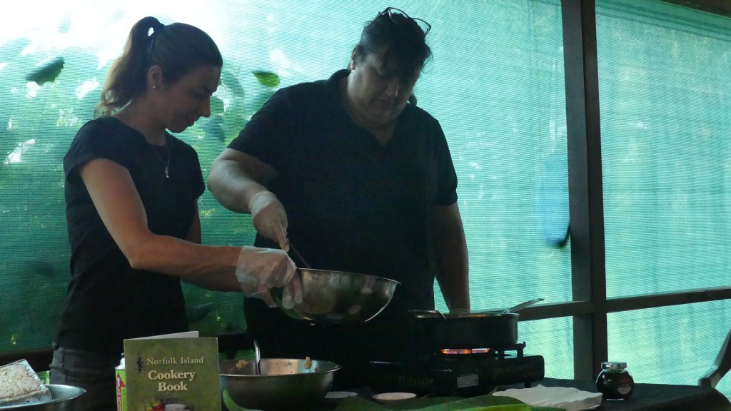 The final leg of the tour is the green banana cooking. Back on the bus we drive to another home and there on the verandah is a propane burner and some green bananas a young lass clearly of Tahitian extraction and the local Norfolk Is cookbook of all the secret recipes. So we learned that you grate the green bananas make a batter and mix spoonsful in the batter and drop them into the propane heated boiling oil and voila green banana fritters. After this we return to Baunti base and head for home exhausted from so much activity. We will have to prepare ourselves for the famous Fish Fry tonight.