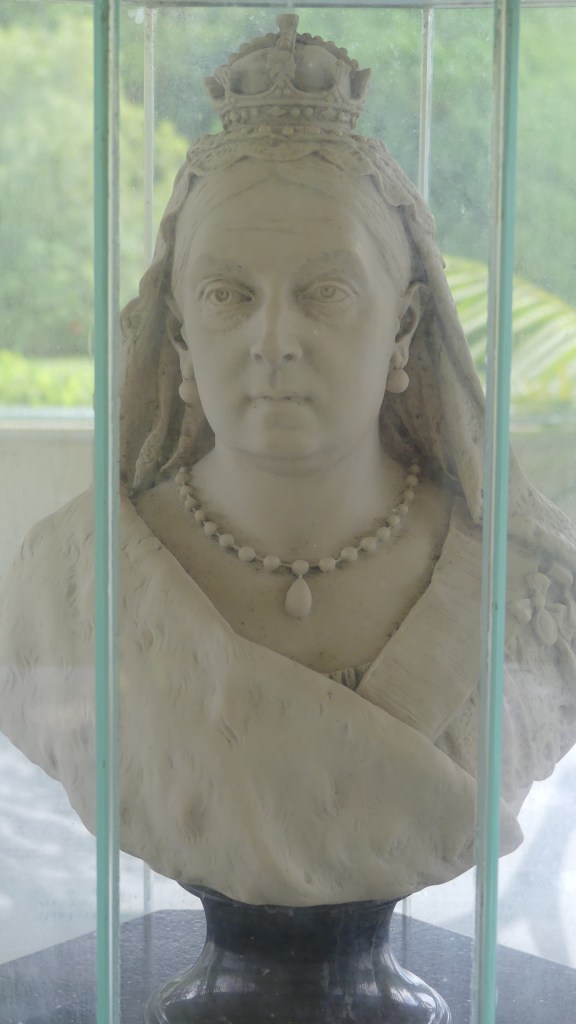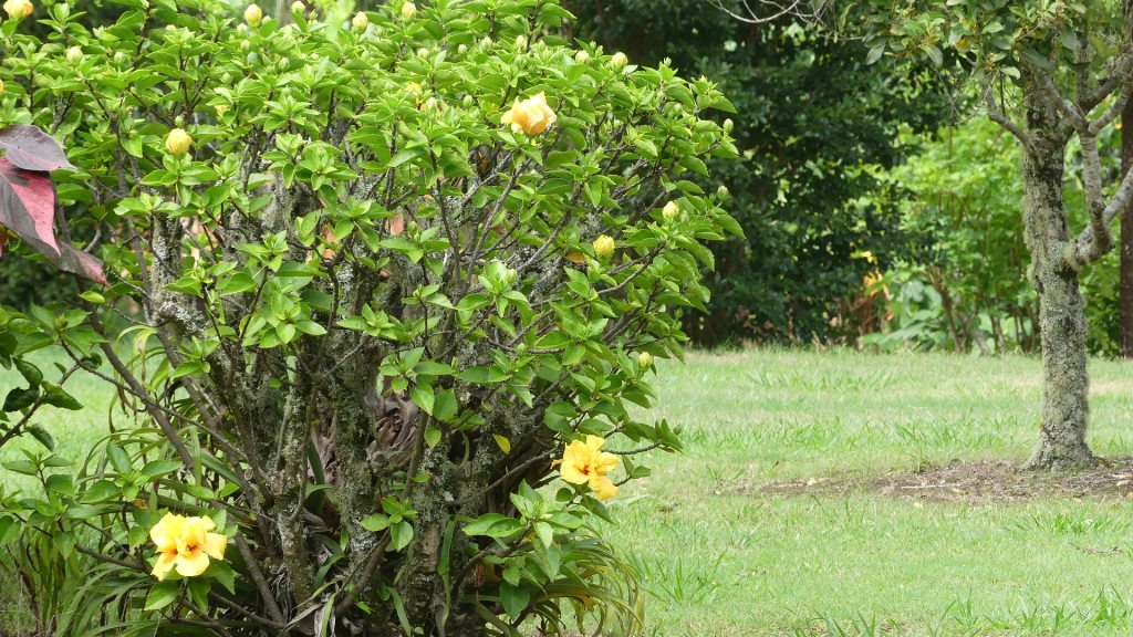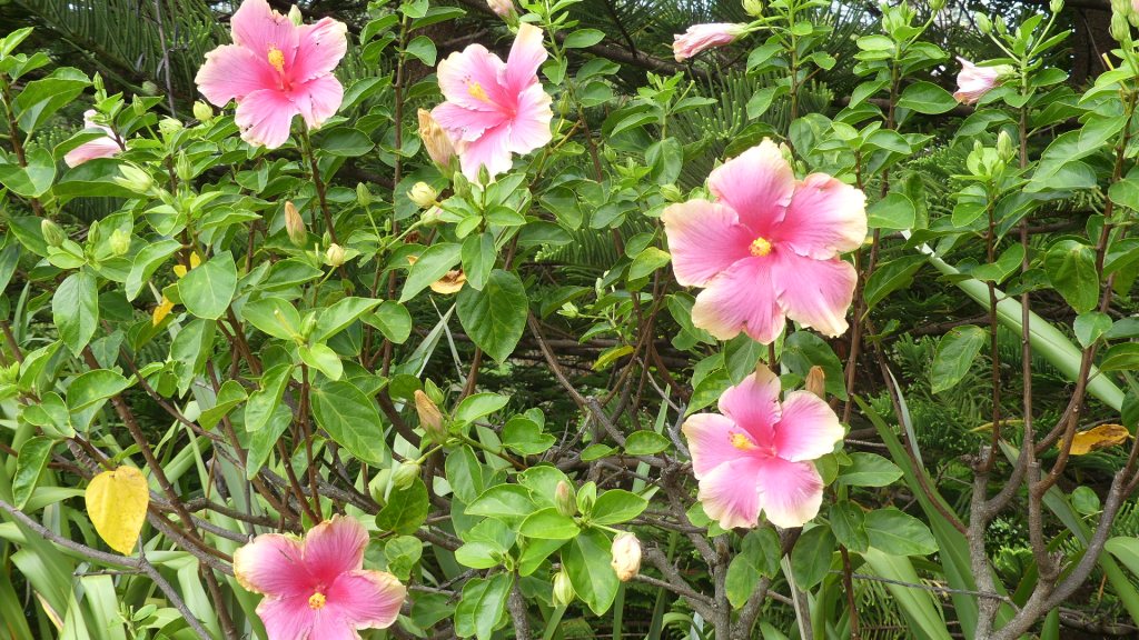We drive around to the Pitcairn Islander Historic Village principally to see if we can get lunch at this restaurant that never seemed to be open and when it did, we could not get a table. It was not open, so we walked through Queen Victoria’s Gardens adjoining the restaurant and then to the Village which was also closed but we were taken by the colourful and large hibiscus bushes.