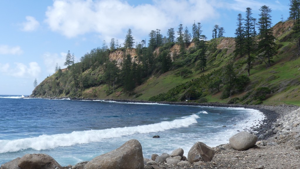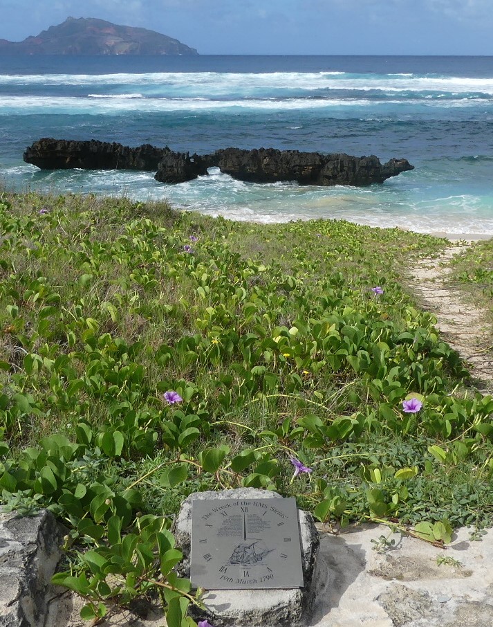 Beside the beach the headland reaches out to Nepean Island and beyond Phillip Island both uninhabited. On this headland is a lone pine tree and hence the name nothing to do with the Dardanelles and the WW1 campaign at Gallipoli. On the other side of Emily Bay is Slaughter Bay and the Sirius monument. HMS Sirius was the flagship of the First Fleet, which set out from Portsmouth, England, in 1787 to establish the first European colony in New South Wales. In 1790, the ship was wrecked on the reef, south east of Kingston Pier, in Slaughter Bay, Norfolk Island and this monument identifies the spot.