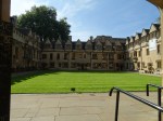 We walk down Blue Boar St and into Oriel St and the front door of Oriel College, where again we see inside the door but entry is not allowed. Again some misadventure had taken place here in one of the series but the best was yet to come. Into Merton St and we arrive at Corpus Christi College. Our guide has a quiet word with the porter (all the gate keepers are called porters) and we are in despite the “No entry to Public” signs. I think there may have been some graft and corruption here as most colleges will for the right fee allow entry and I think our guide has a deal which she has been unable to swing with the other colleges.