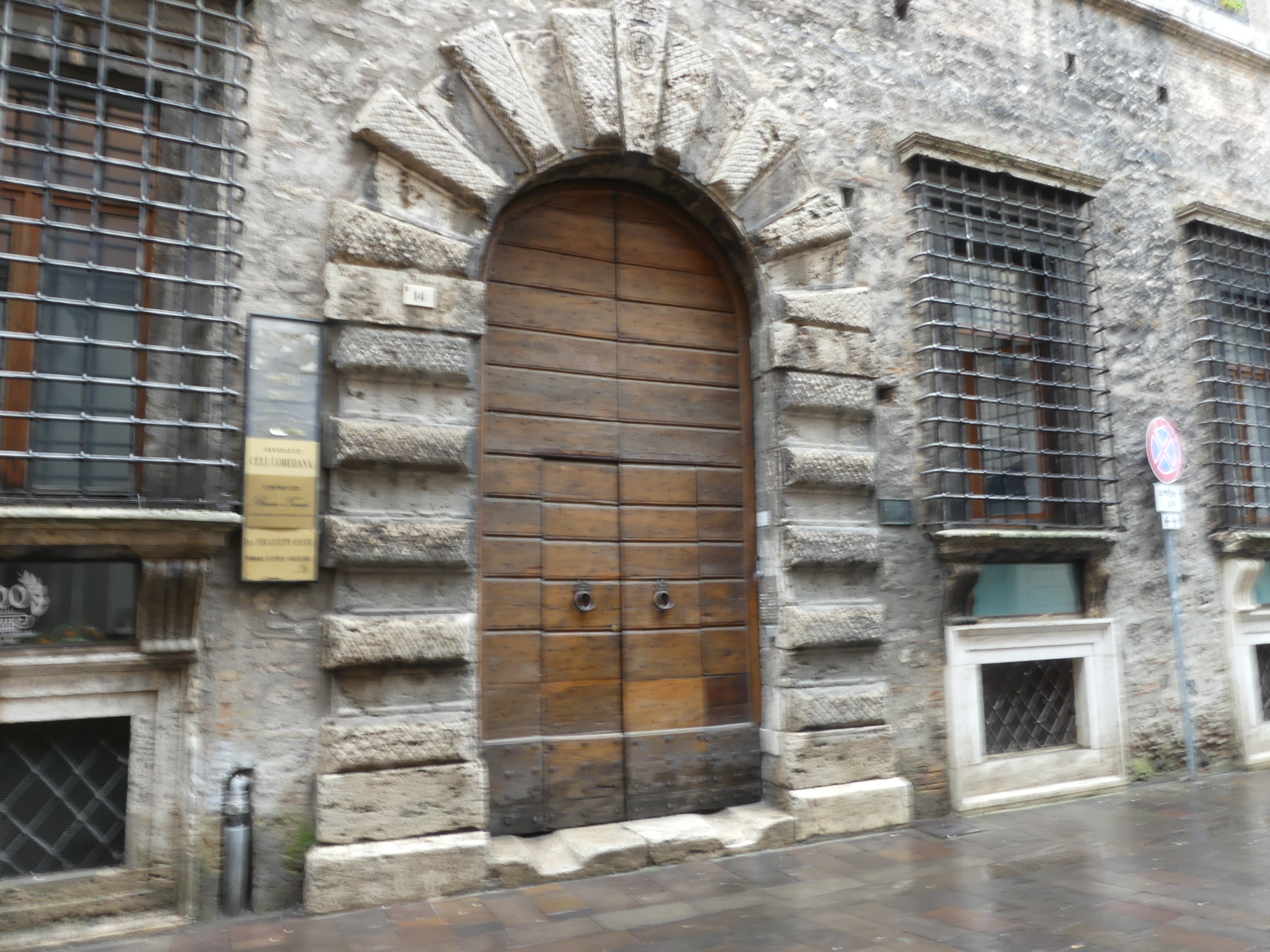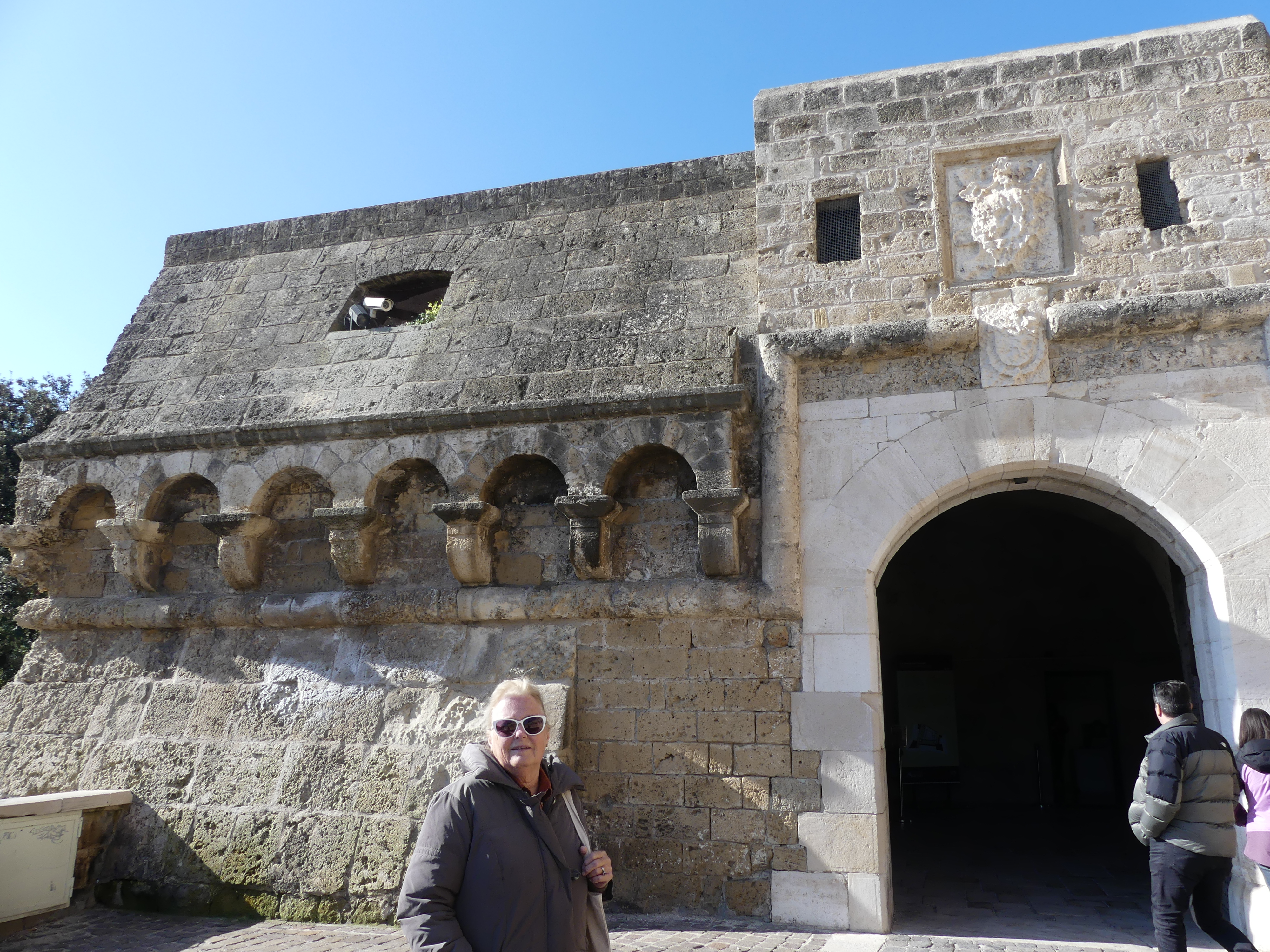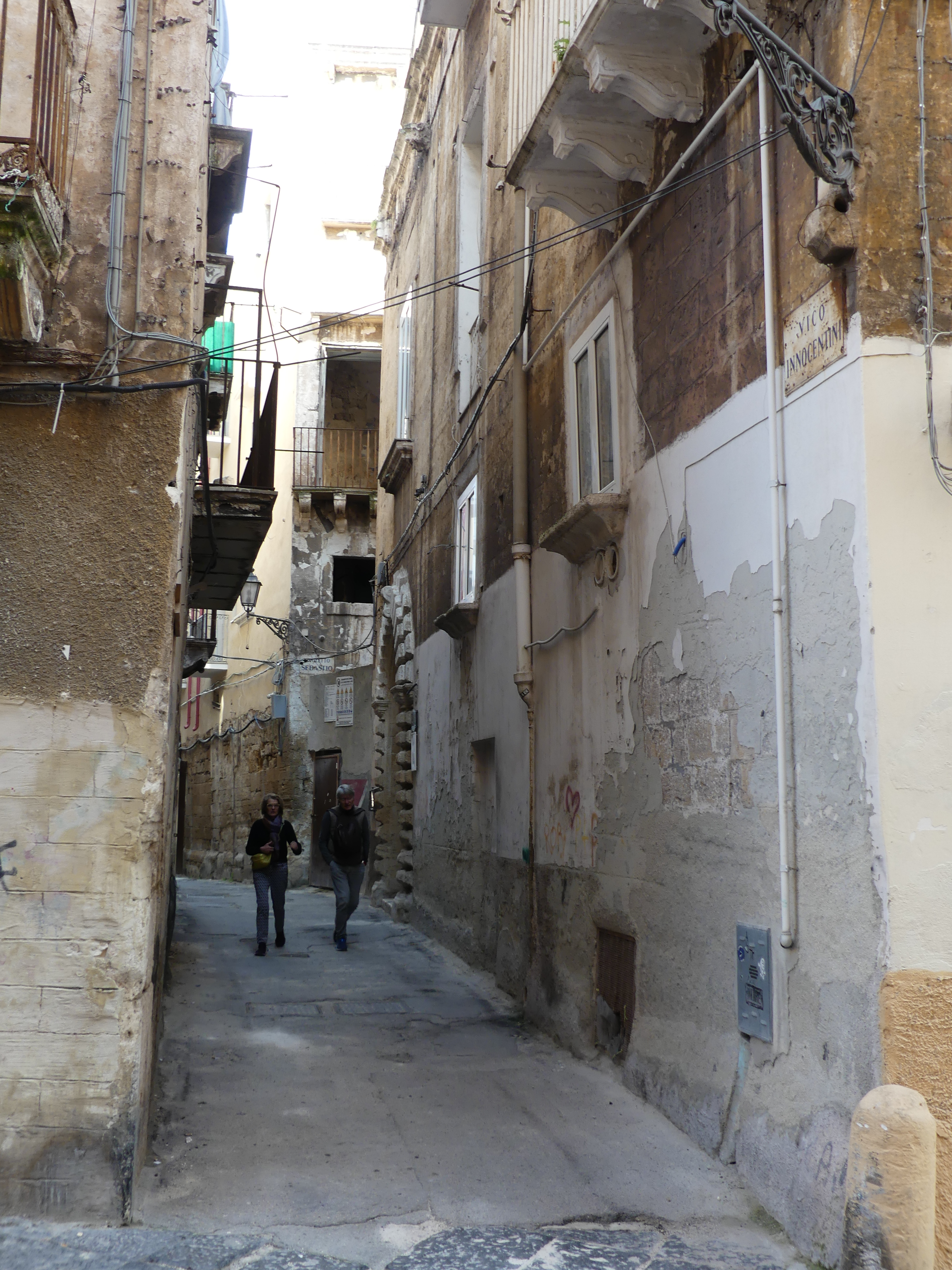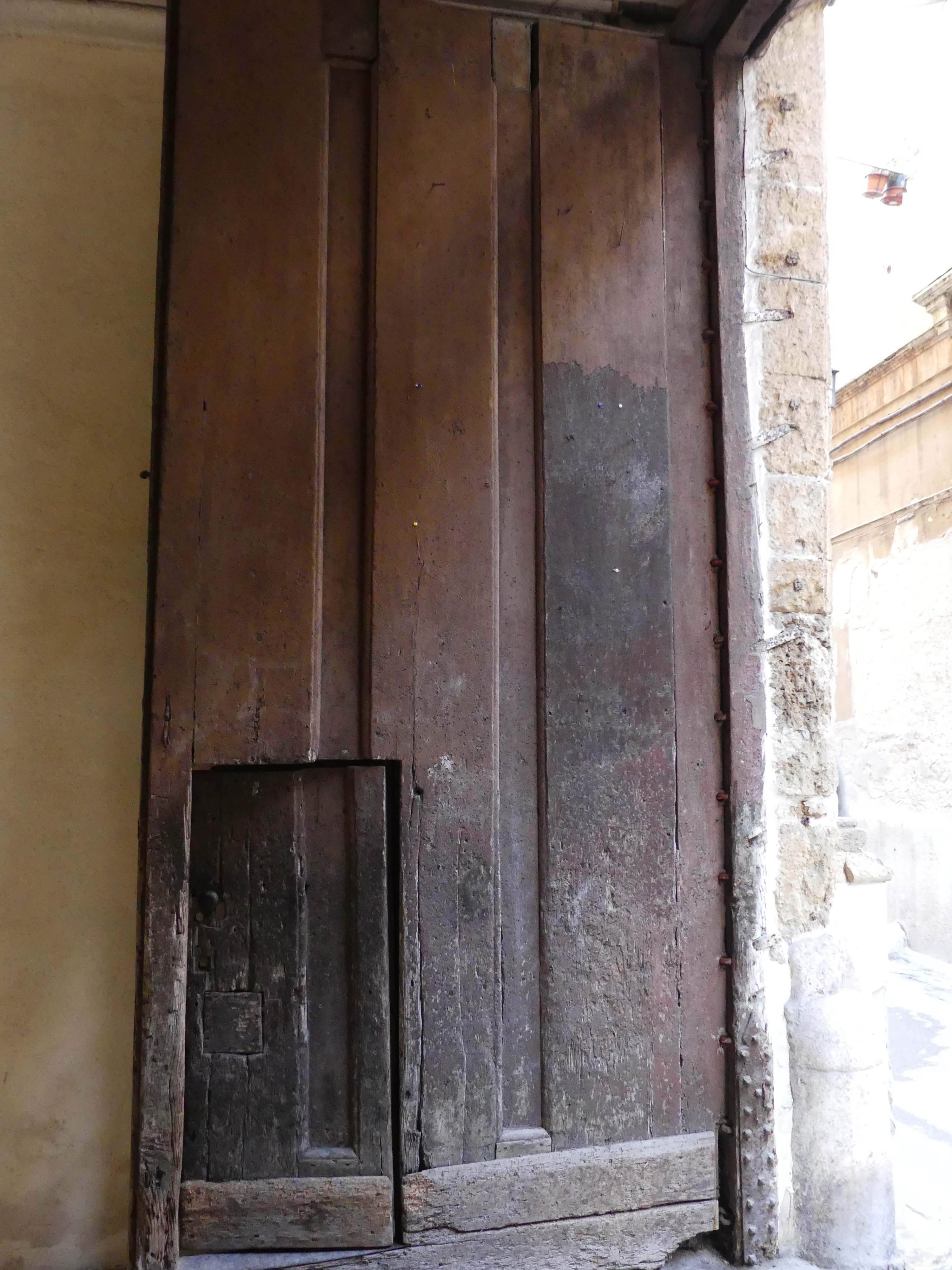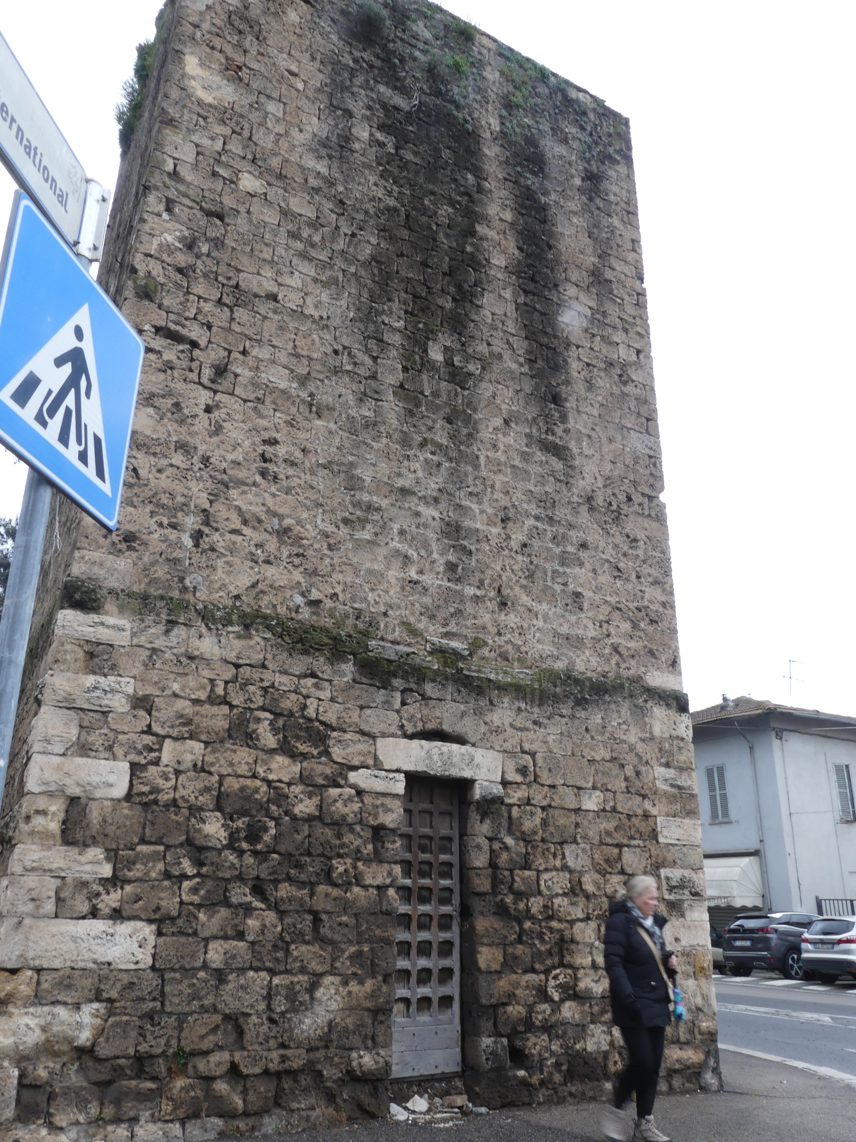 As commented about some walls being “decorated” with “street art” – we came across this portrait of a bishop – very impressive. The church however seemed to have walls collapsing into the chapel. As we made our way back to Hotel Vergilius Billia we took a different route came across an ancient gate of the city and disjointed buildings with openings and windows in odd places but still in use. Here are some photos of a narrow but long building and an ancient gate surrounded by merchants.