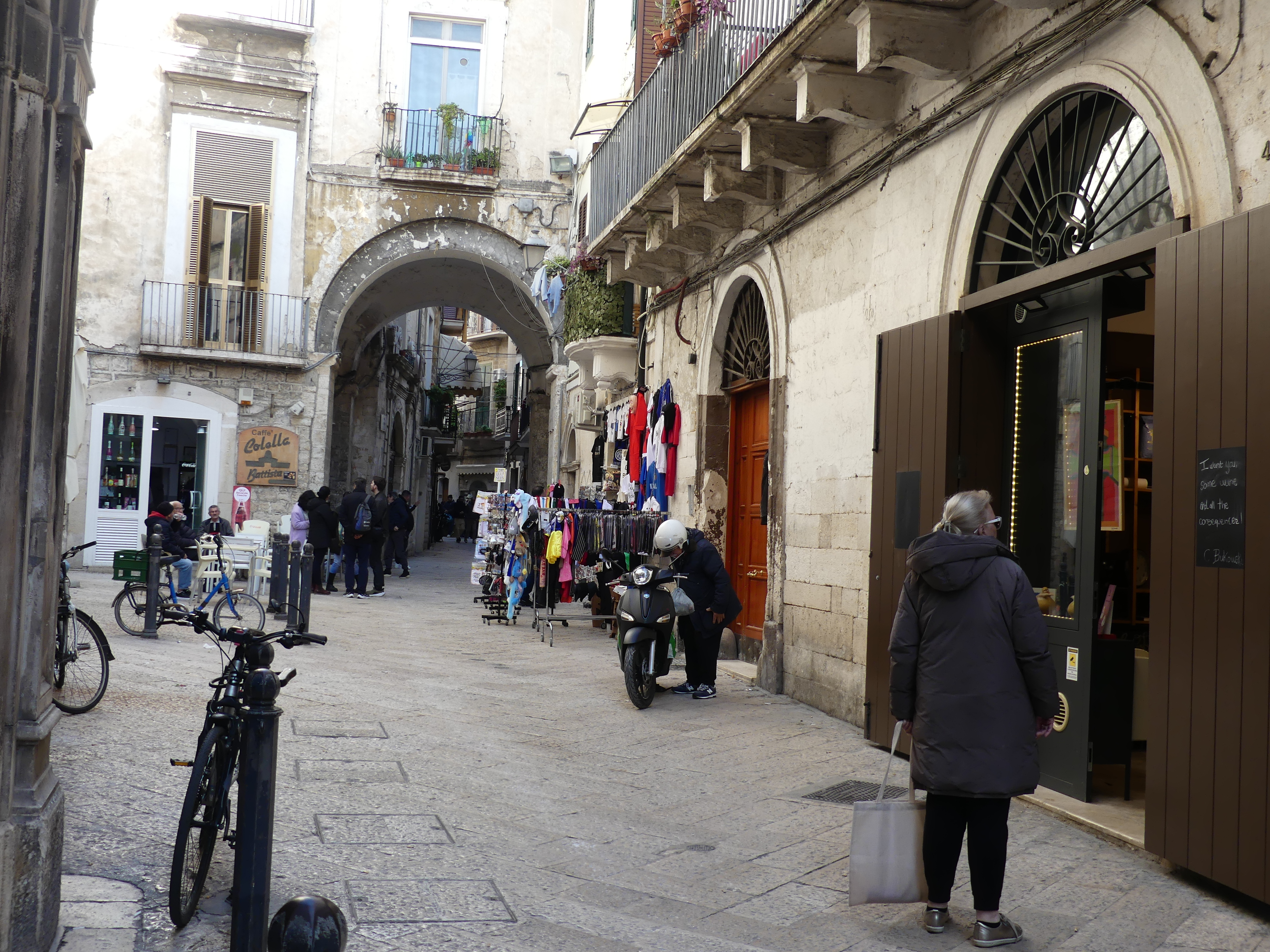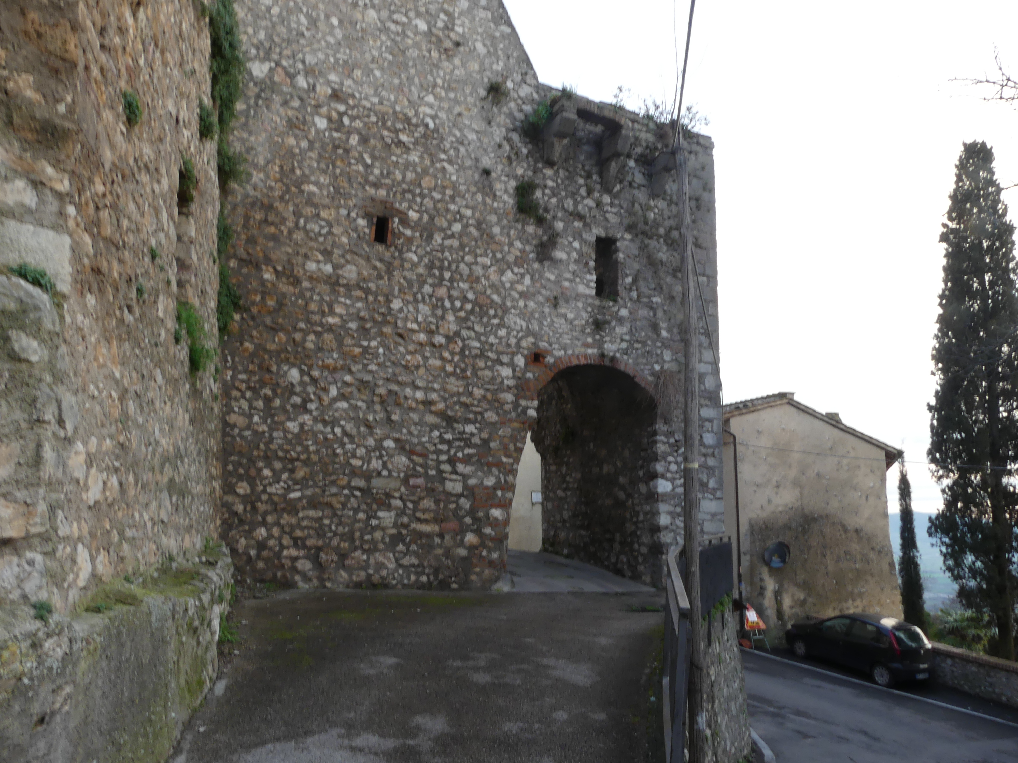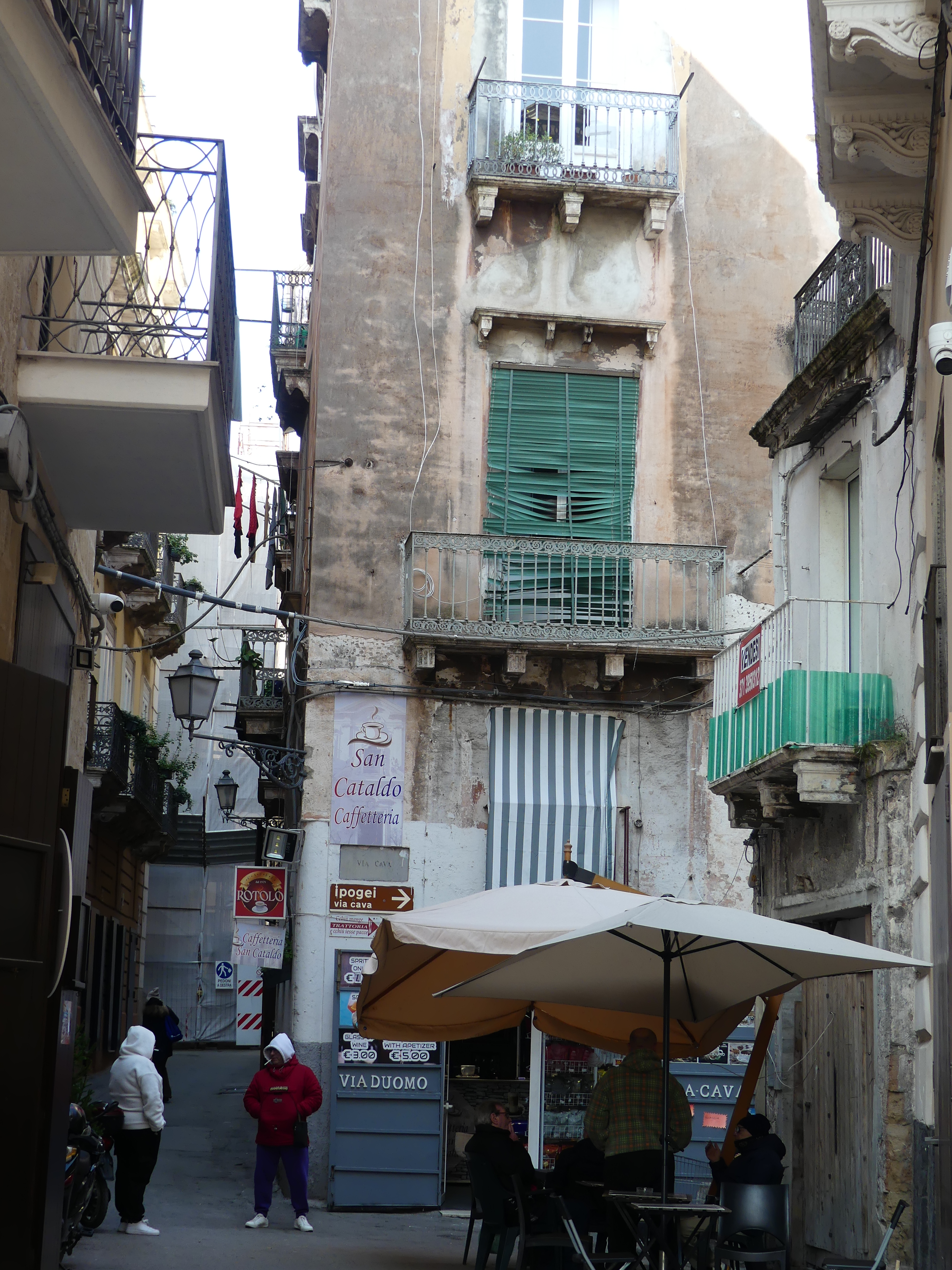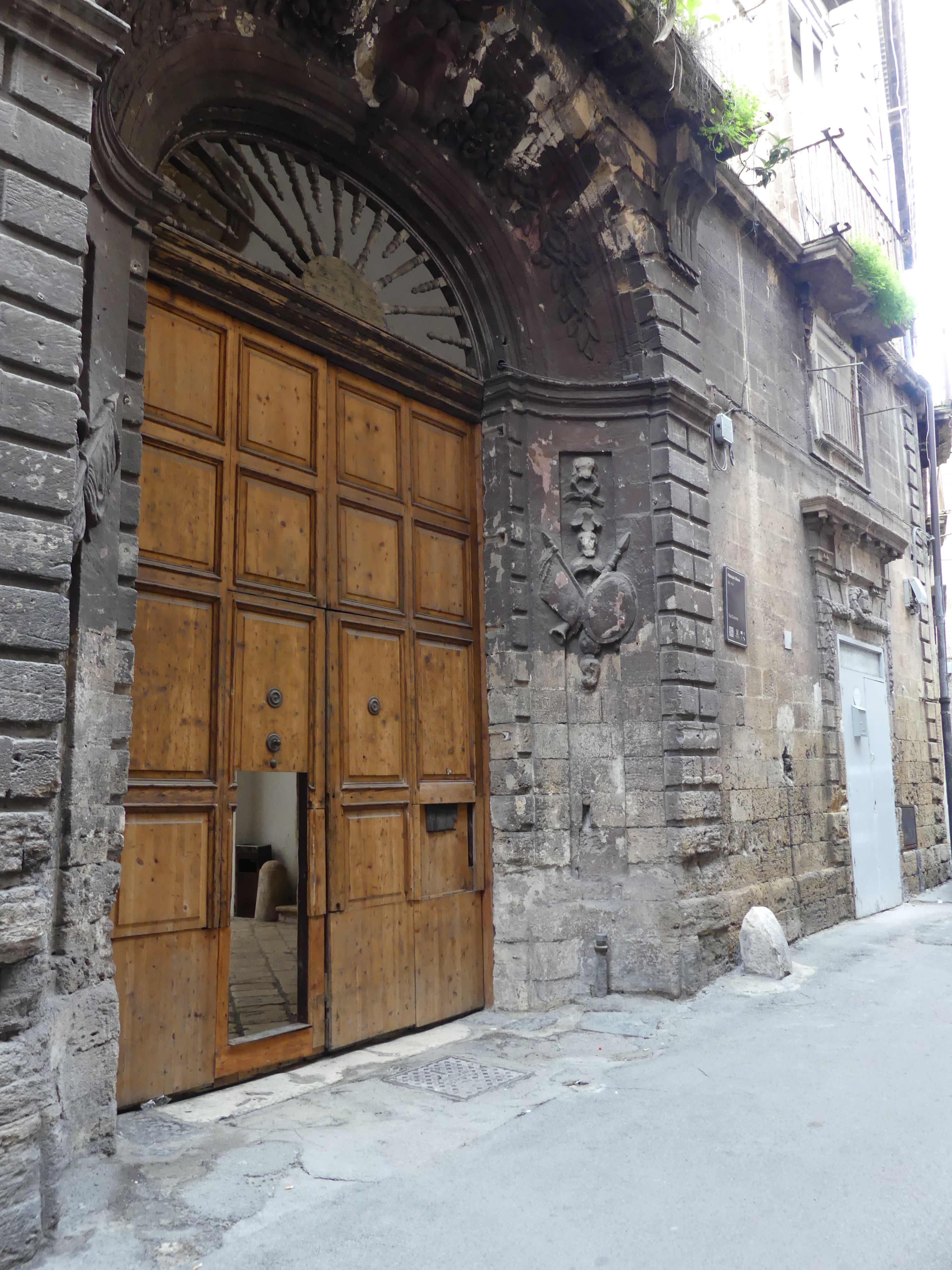 As commented about some walls being “decorated” with “street art” – we came across this portrait of a bishop – very impressive. The church however seemed to have walls collapsing into the chapel. As we made our way back to Hotel Vergilius Billia we took a different route came across an ancient gate of the city and disjointed buildings with openings and windows in odd places but still in use. Here are some photos of a narrow but long building and an ancient gate surrounded by merchants.