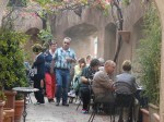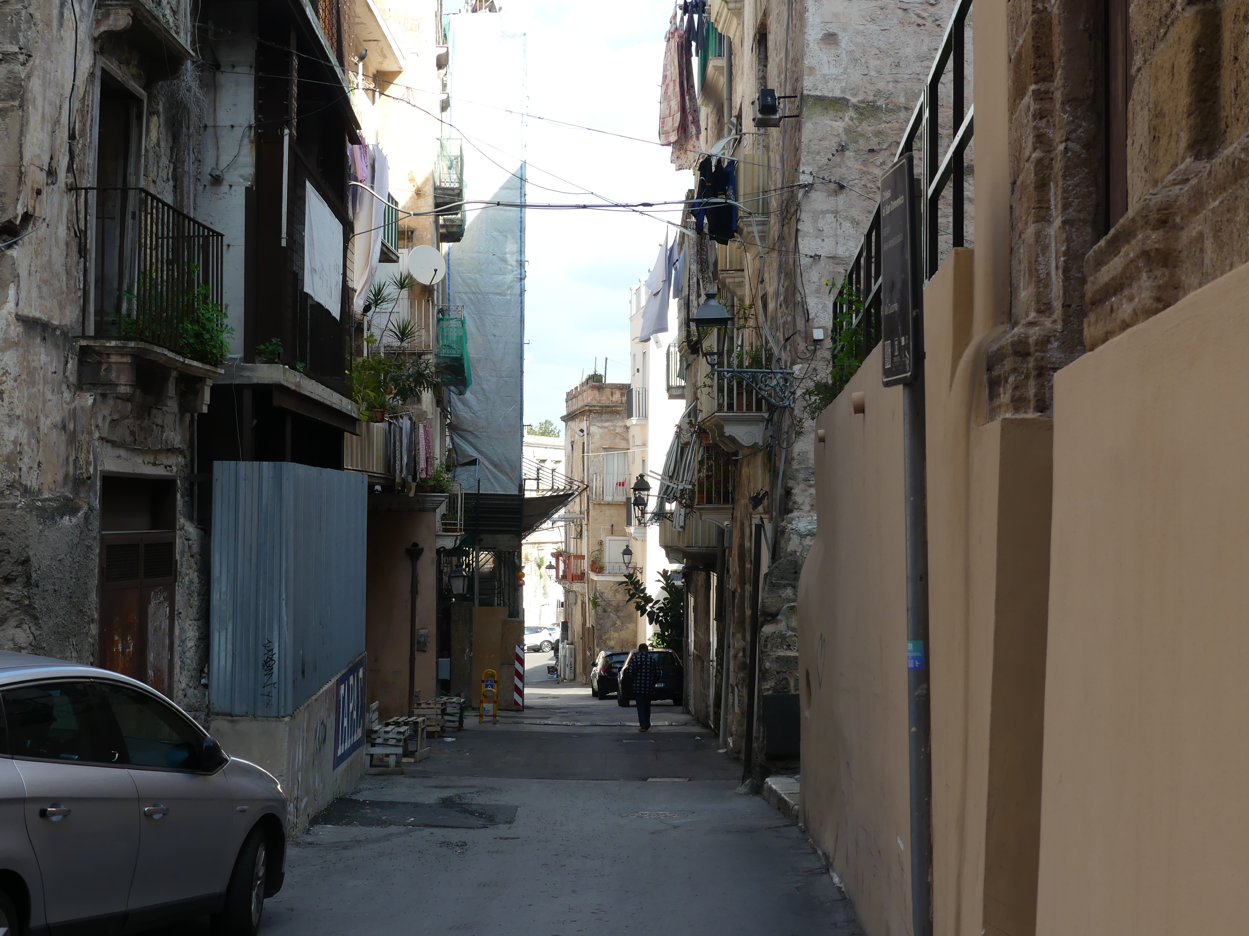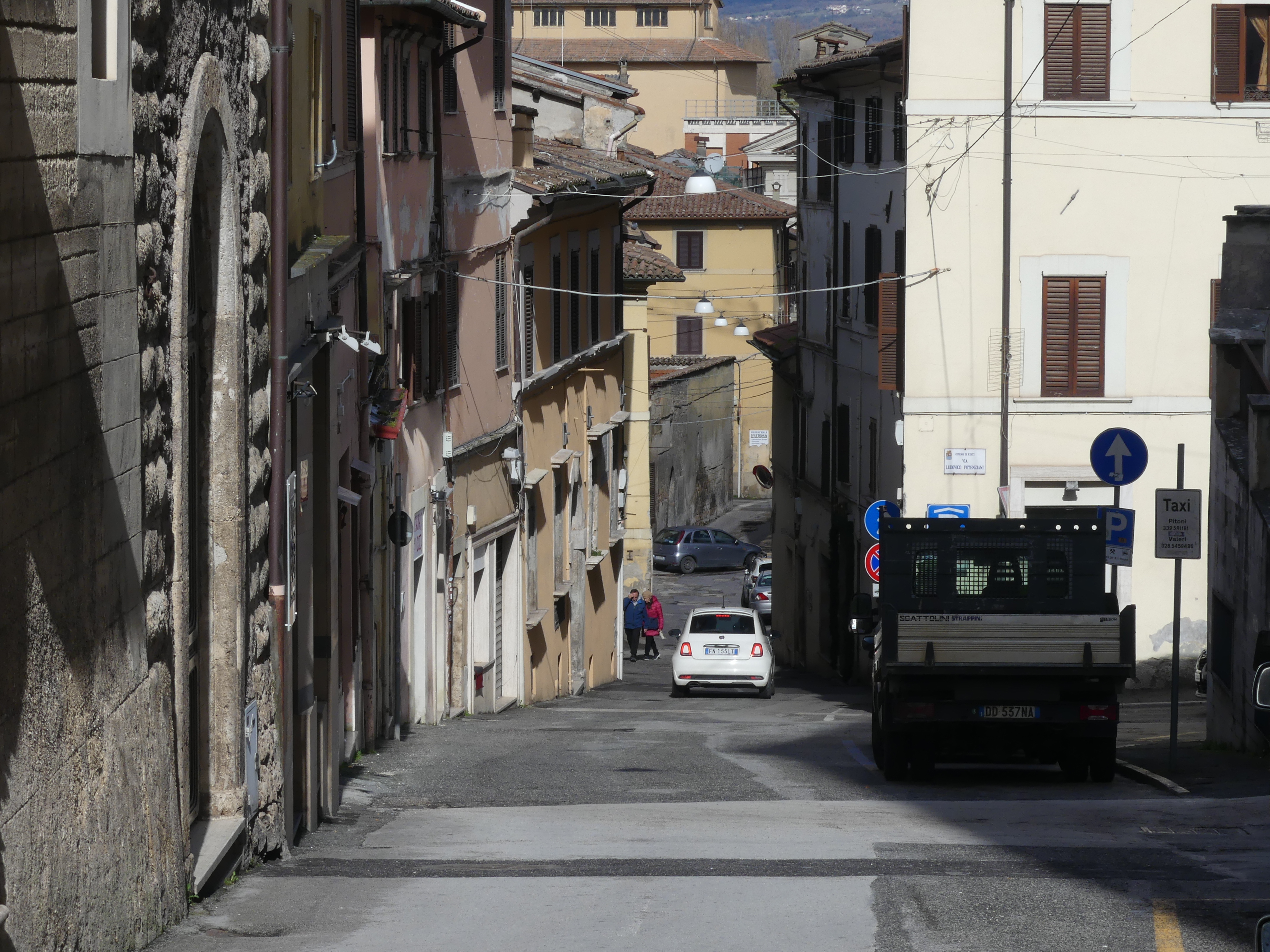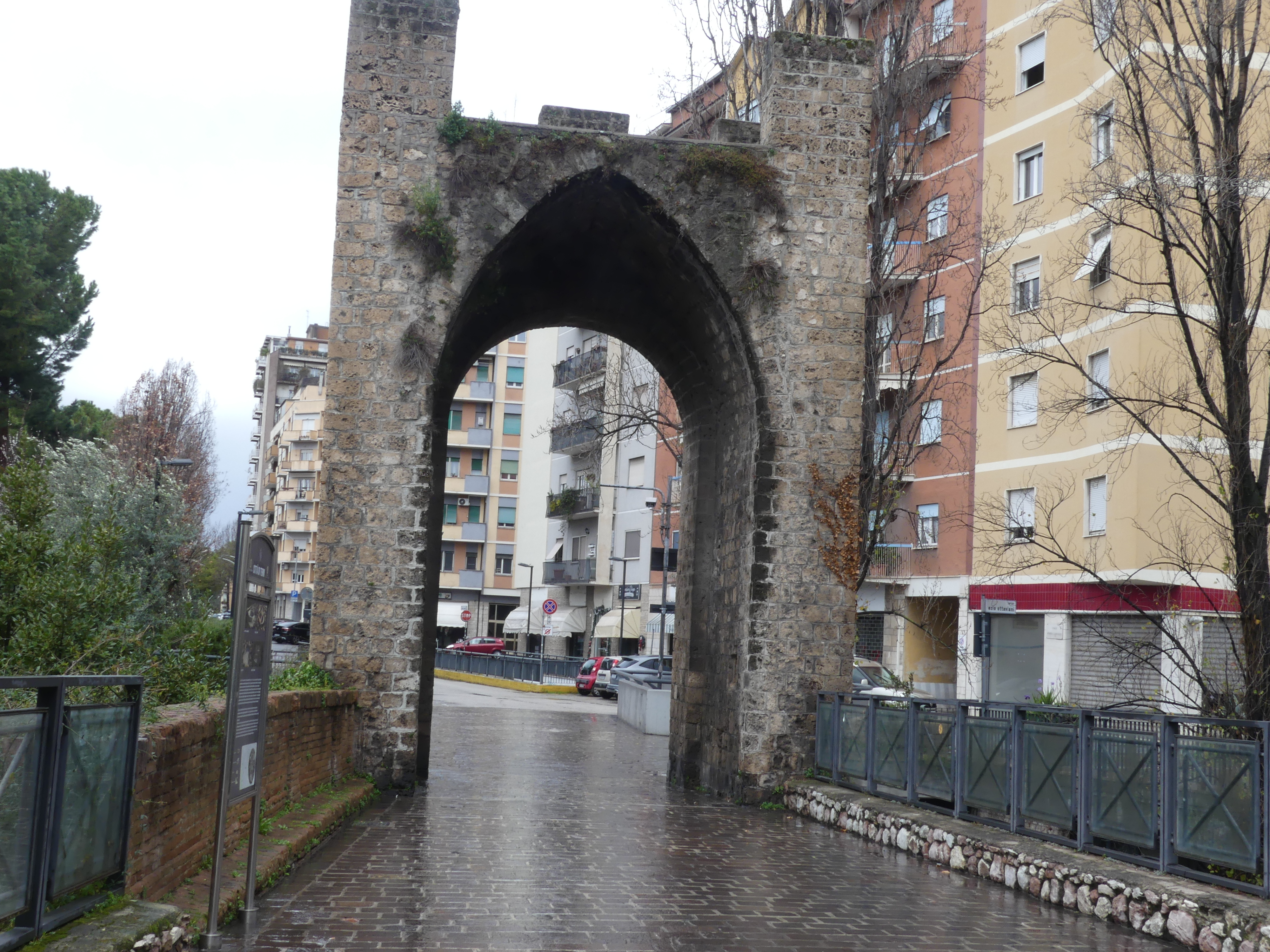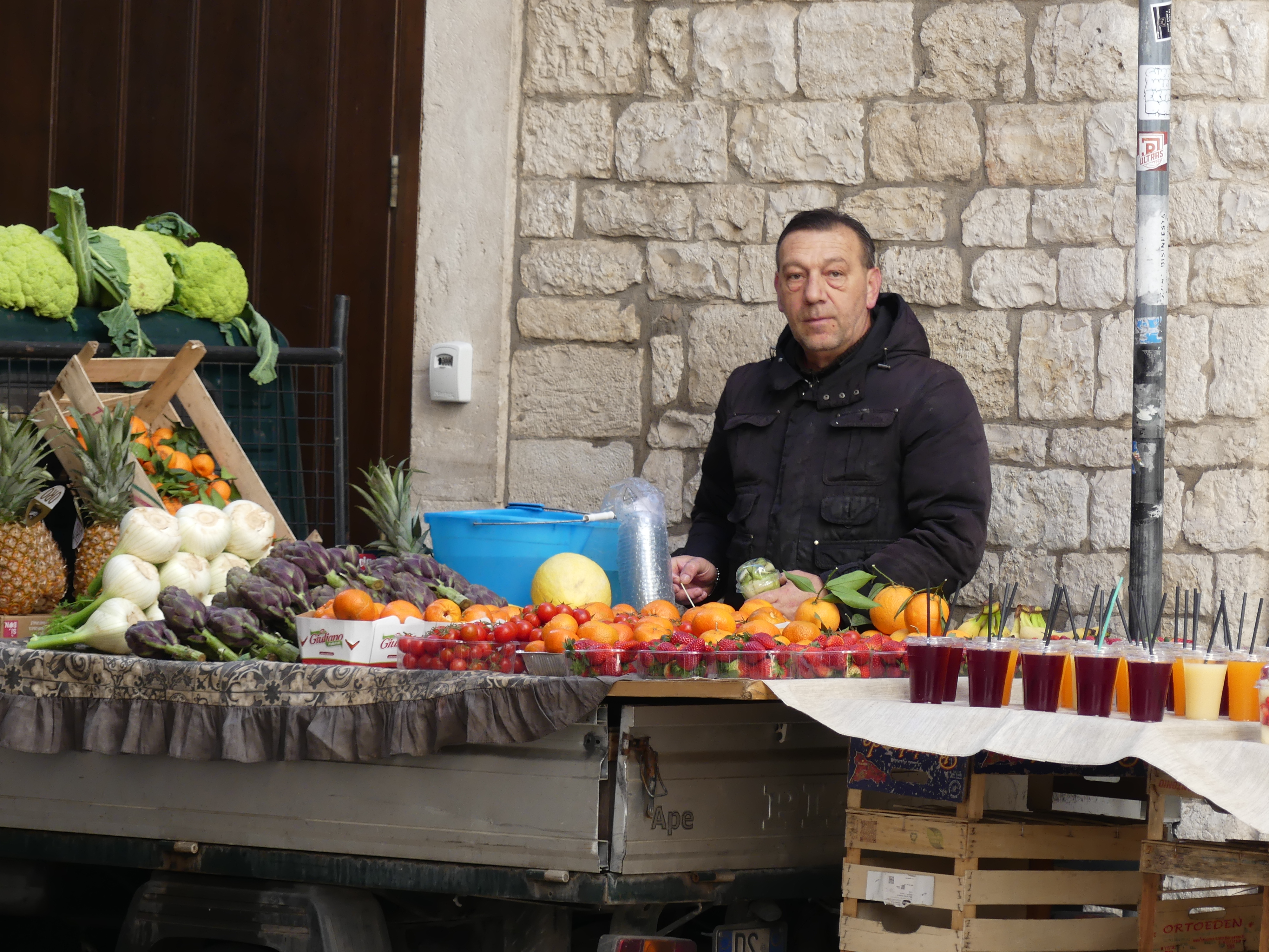 As commented about some walls being “decorated” with “street art” – we came across this portrait of a bishop – very impressive. The church however seemed to have walls collapsing into the chapel. As we made our way back to Hotel Vergilius Billia we took a different route came across an ancient gate of the city and disjointed buildings with openings and windows in odd places but still in use. Here are some photos of a narrow but long building and an ancient gate surrounded by merchants.