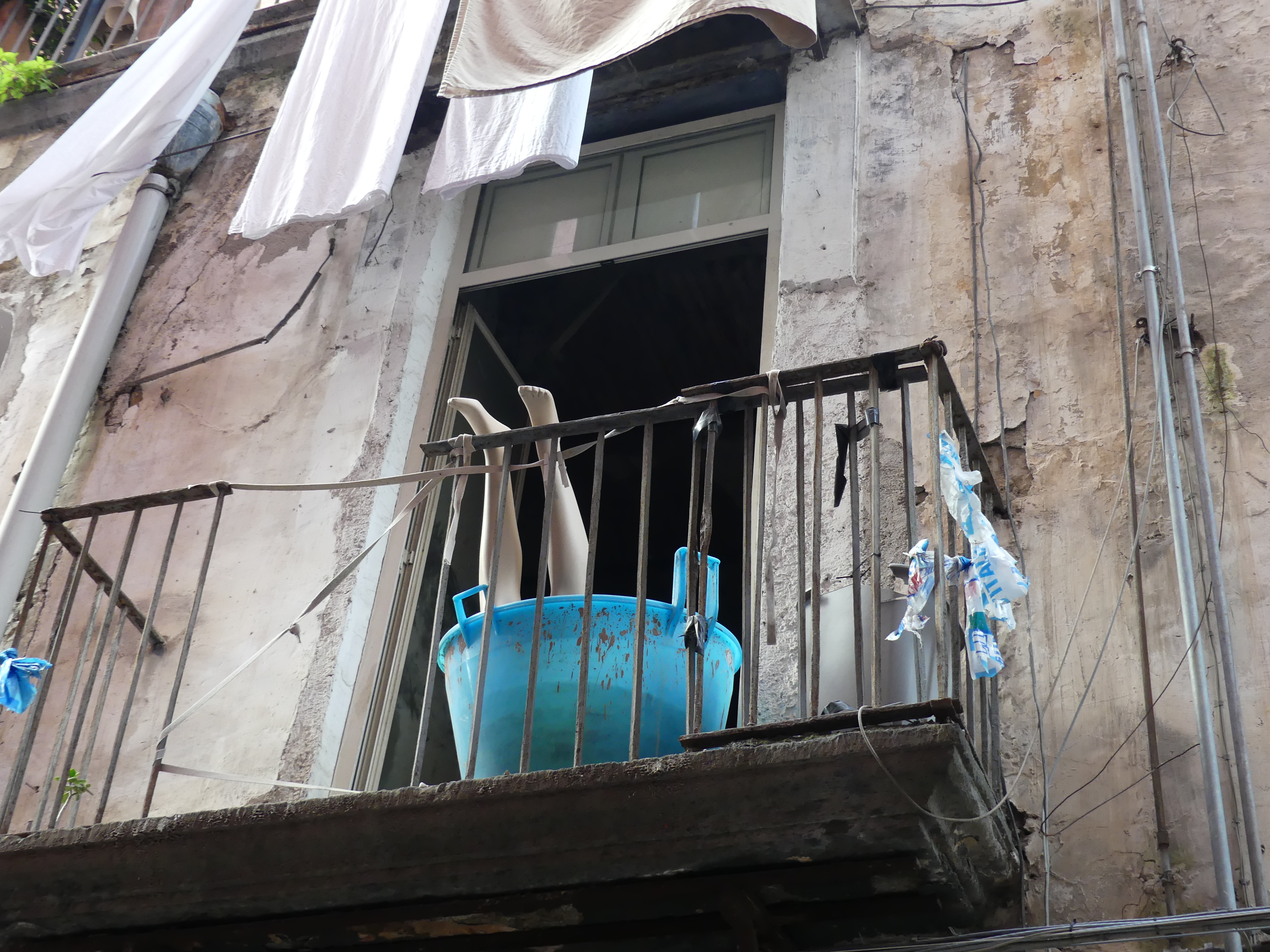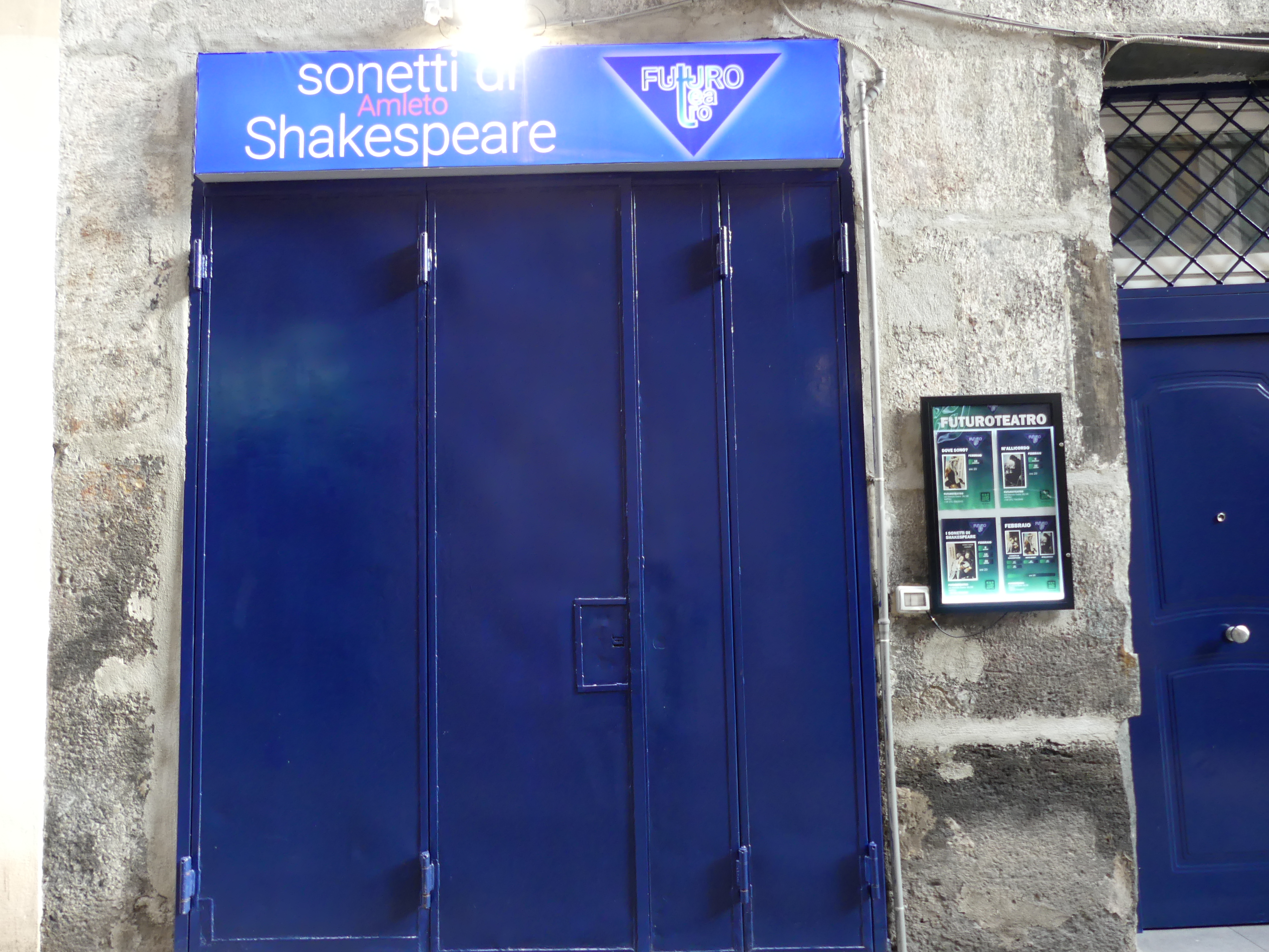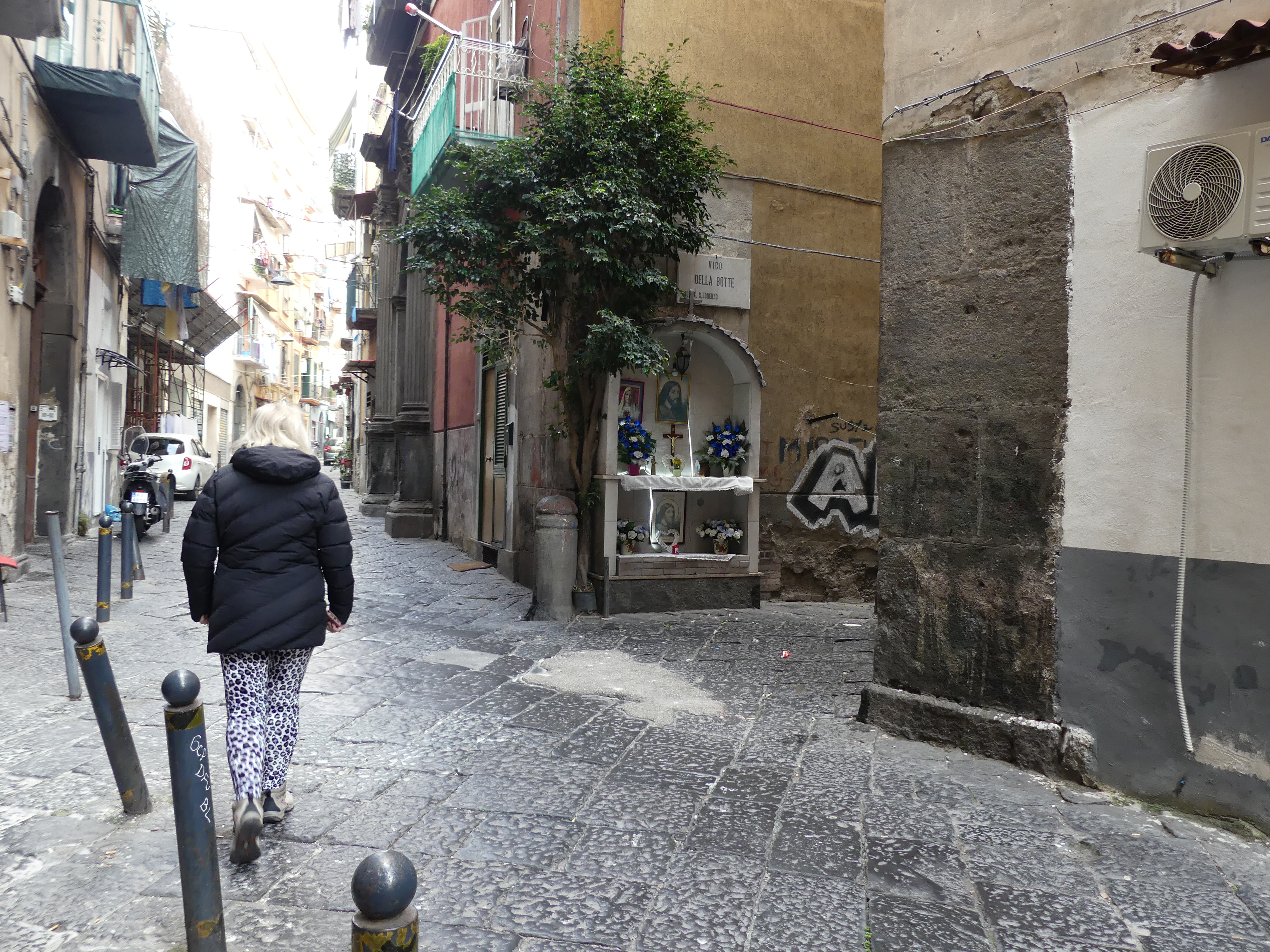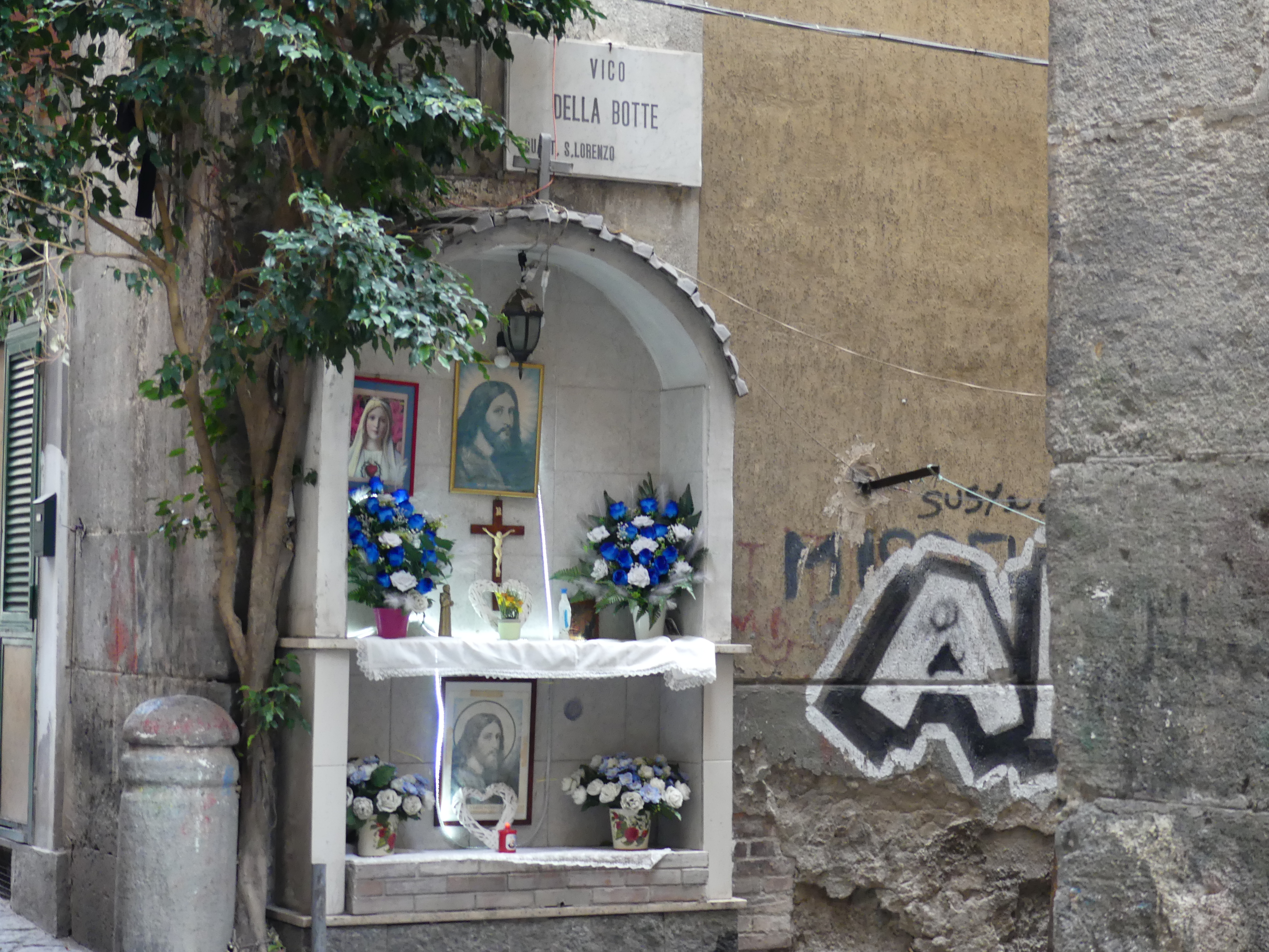 The following morning it was breakfast first before our big day in the old town. One of the first shops we encountered was the Italian Bunnings hardware store. A further surprise awaited us when we passed a theatre presenting Sonetti de Amleto (Sonnets of Hamlet). Shakespeare in Naples. The streets were narrow and the buildings dirty and tired sometimes decorated with street art or a chapel for worship.