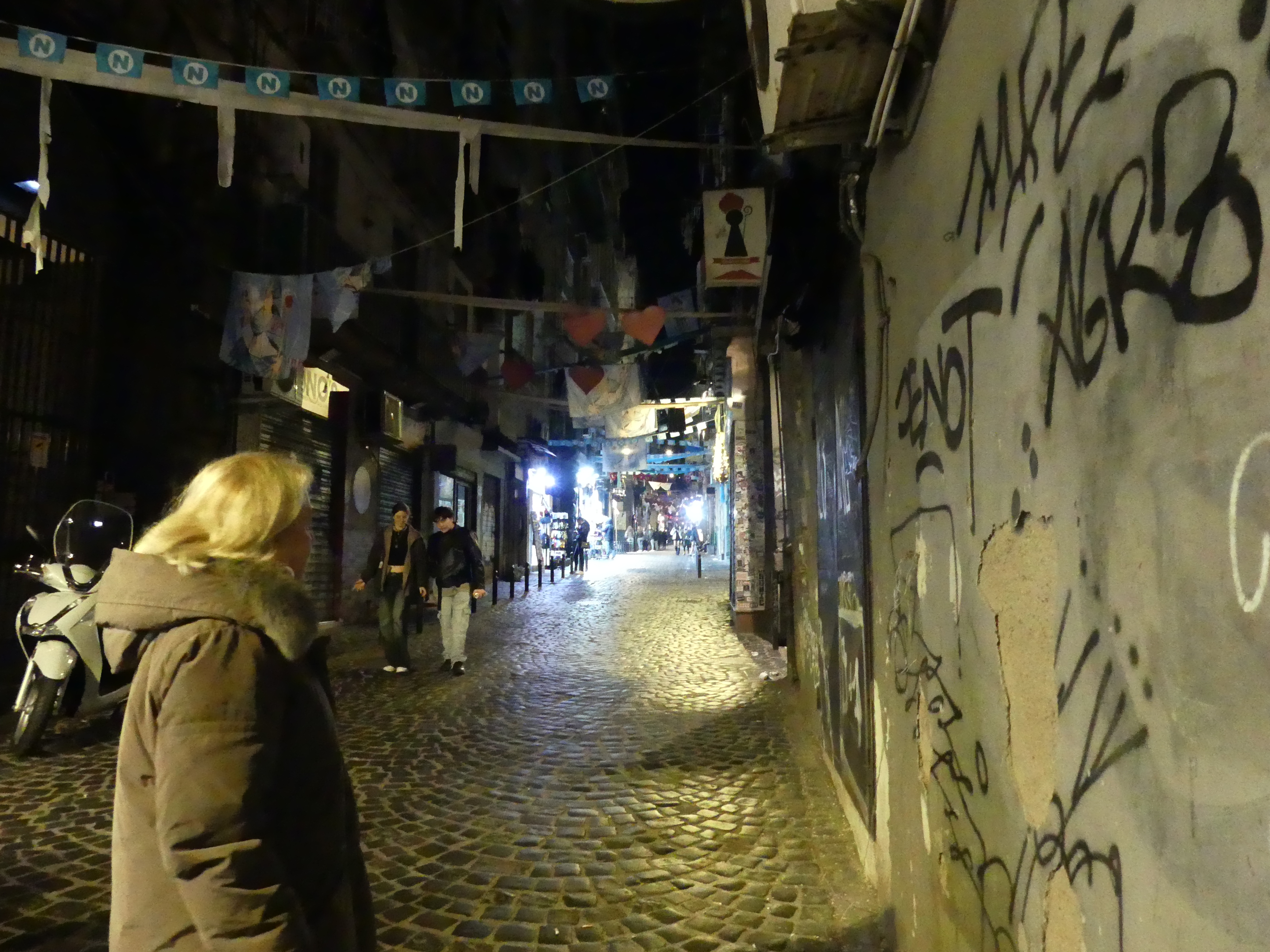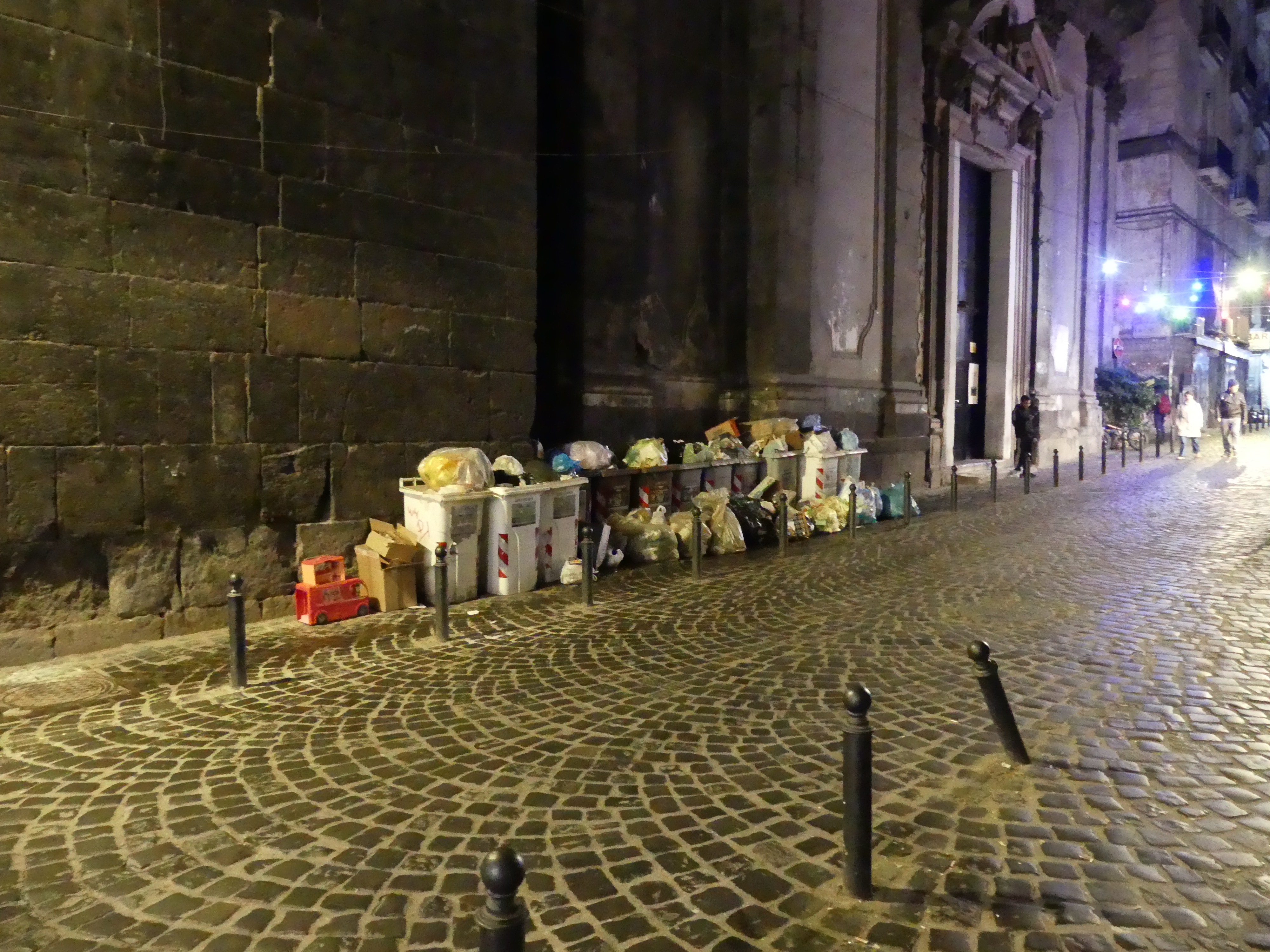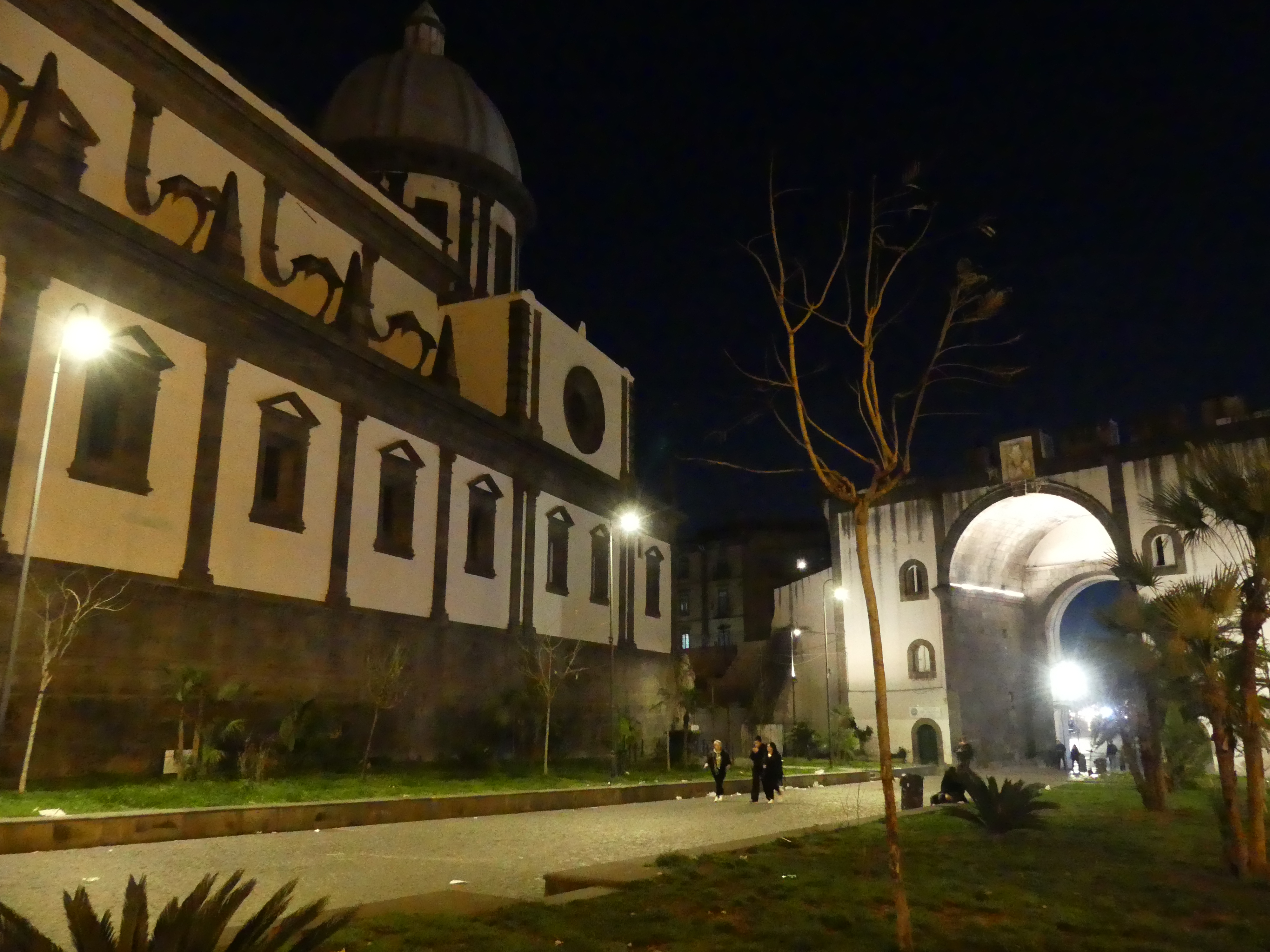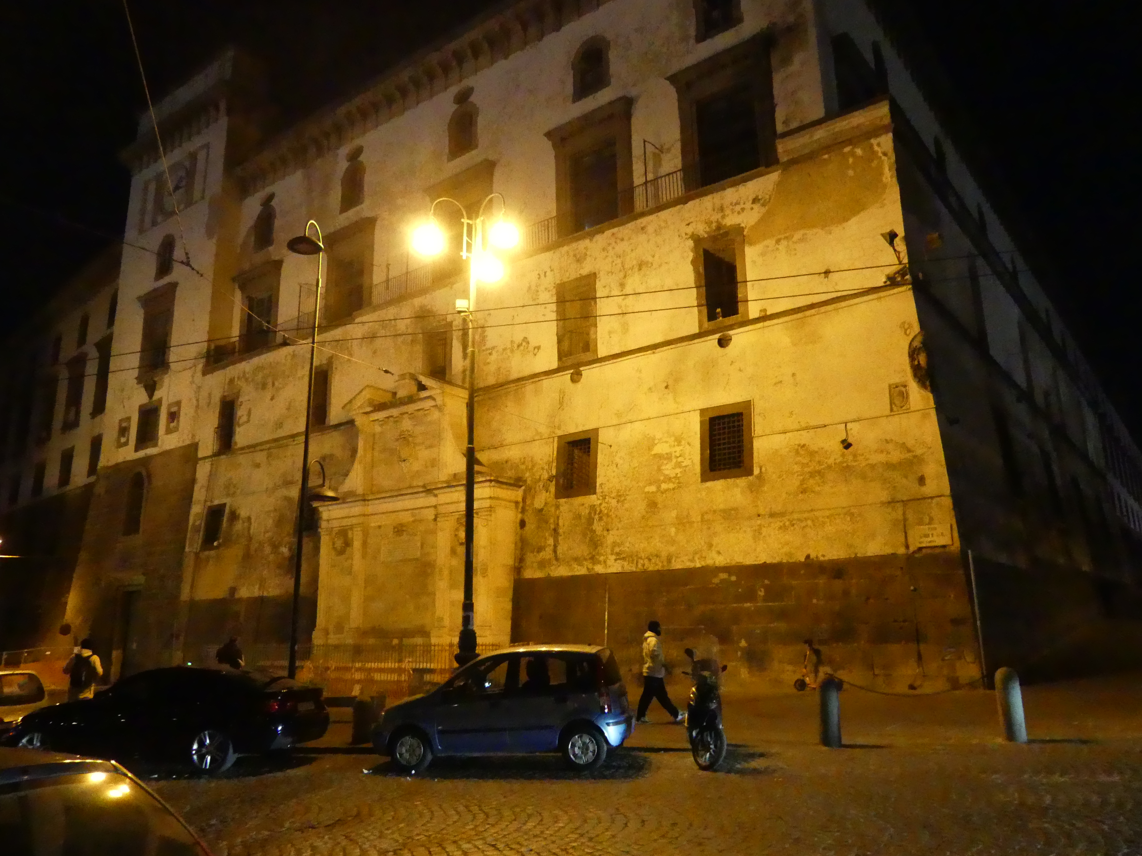 Our plan here was to visit the old city and particularly visit the underground tunnels and cisterns built by the Greeks and Romans. After booking into our hotel, we visited the old town by night particularly the historic centre of the city in Via dei Tribunali. We crossed the piazza past a church and attached monastery past the walls of a castle and into Via dei Tribunali. The first thing we noticed was how dirty it is and how alive it is with people, scooters and cars down this narrow alley. In a doorway we found the tell-tale sign of a recent birth – a boy. Here is a selection of photos going to the old town and in the old town itself.