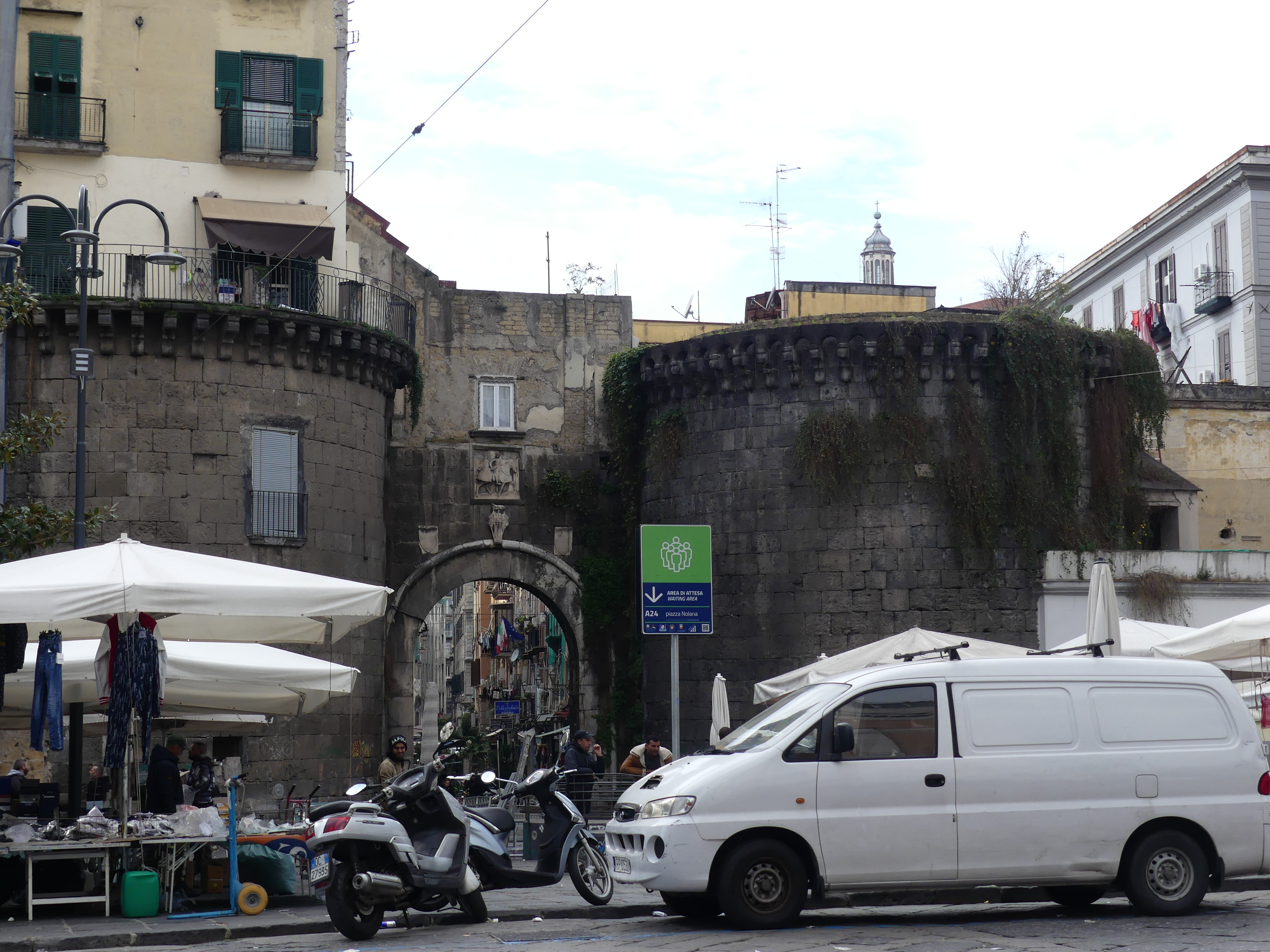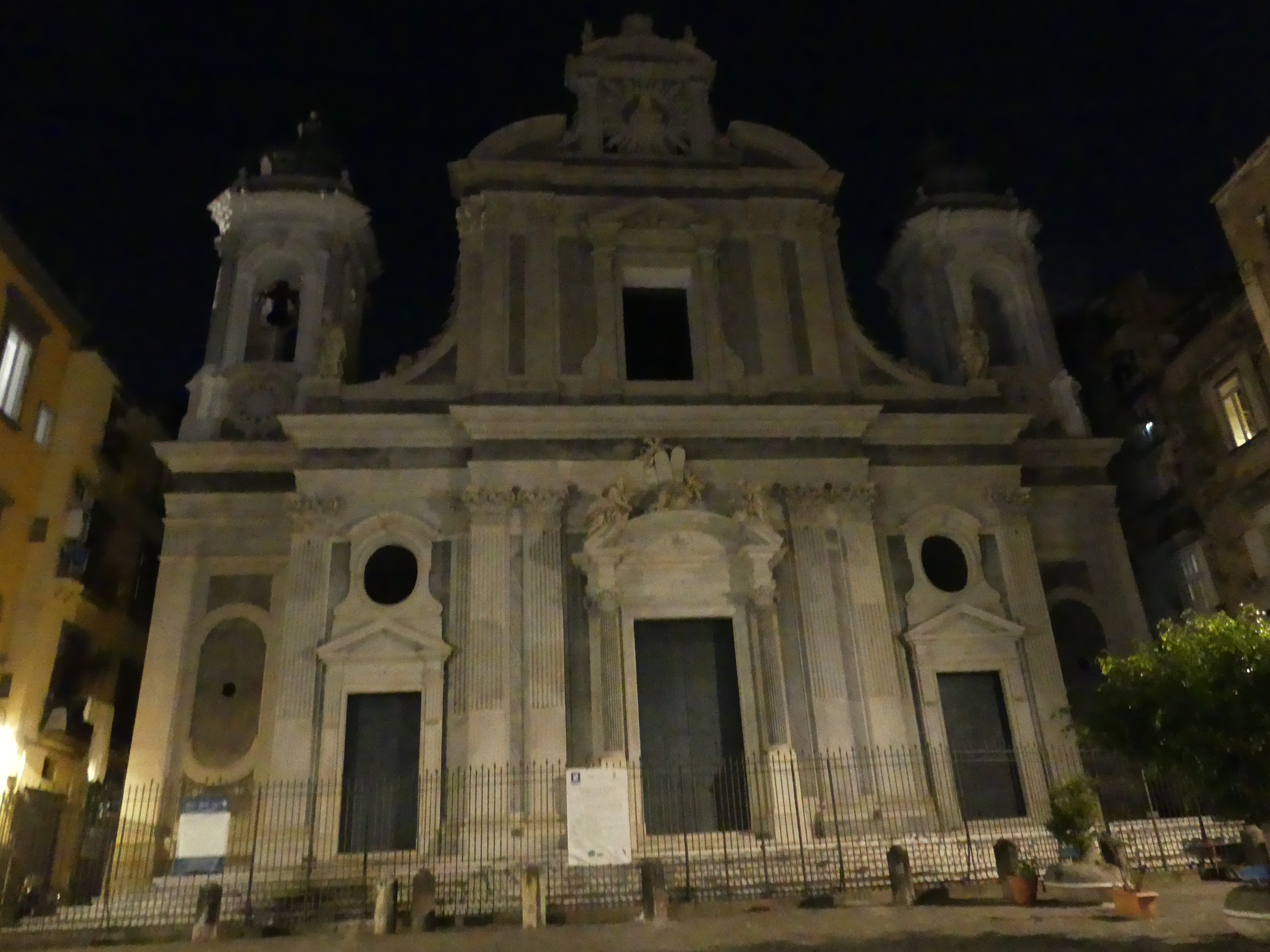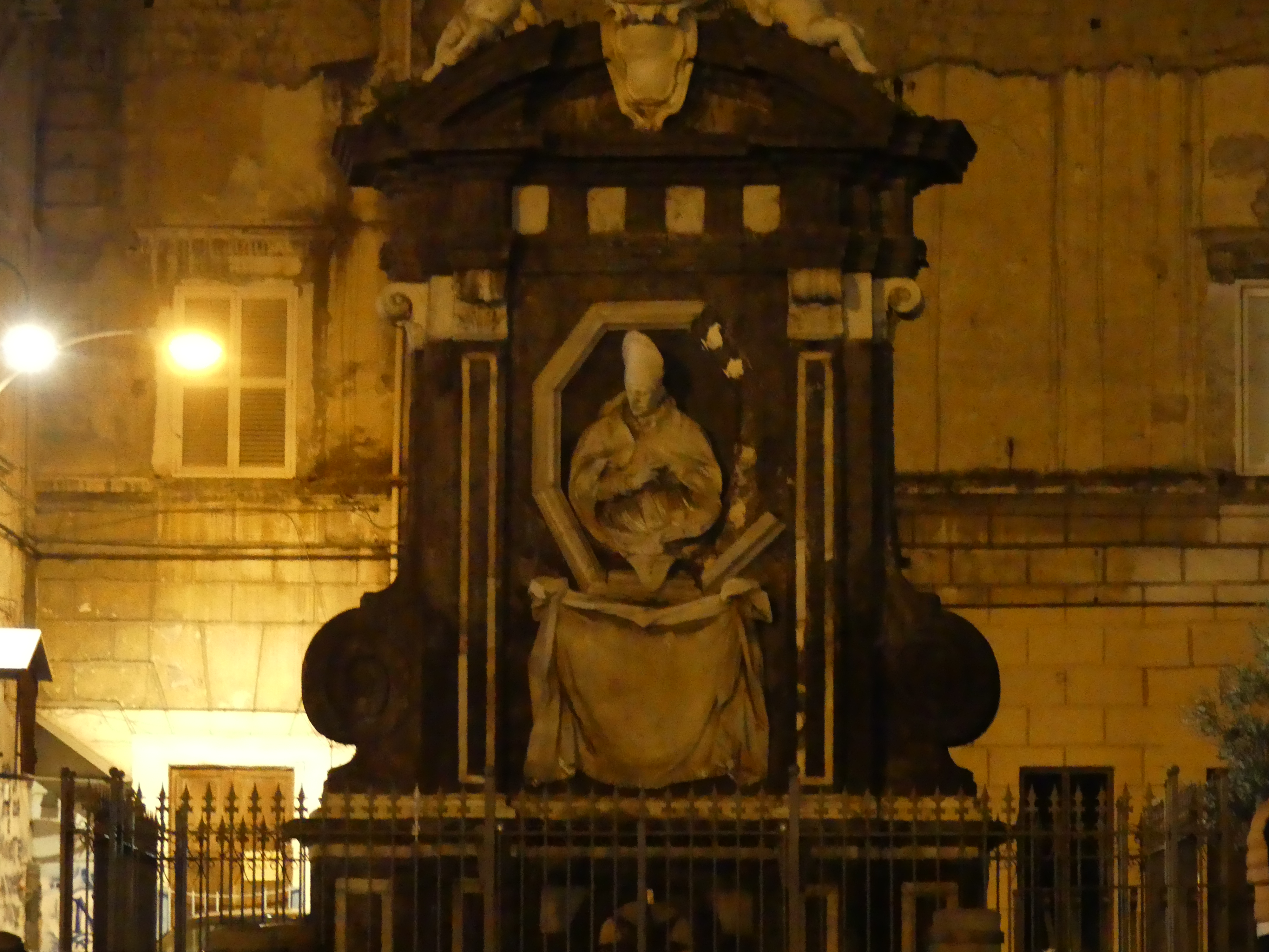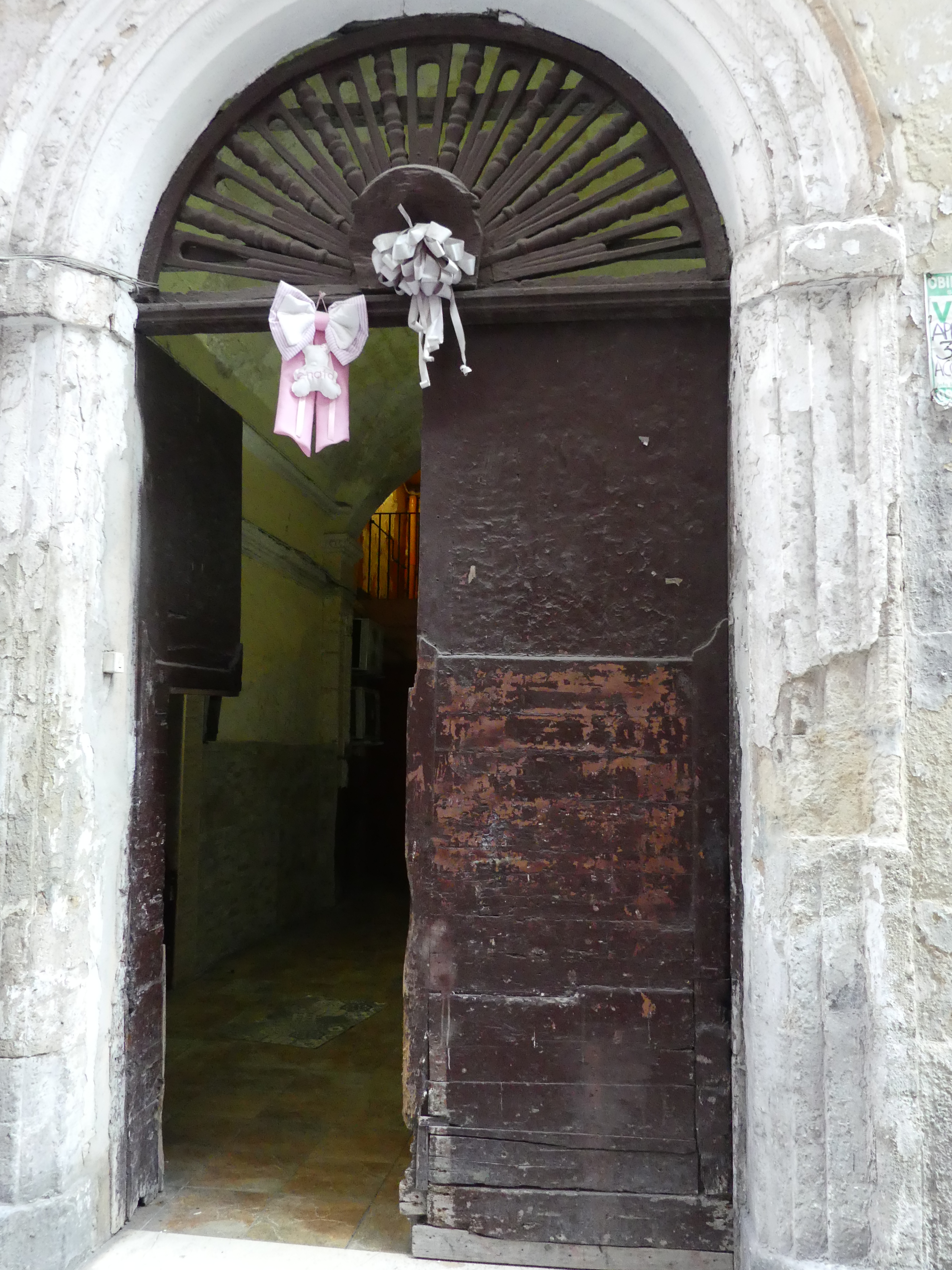 Our plan here was to visit the old city and particularly visit the underground tunnels and cisterns built by the Greeks and Romans. After booking into our hotel, we visited the old town by night particularly the historic centre of the city in Via dei Tribunali. We crossed the piazza past a church and attached monastery past the walls of a castle and into Via dei Tribunali. The first thing we noticed was how dirty it is and how alive it is with people, scooters and cars down this narrow alley. In a doorway we found the tell-tale sign of a recent birth – a boy. Here is a selection of photos going to the old town and in the old town itself.