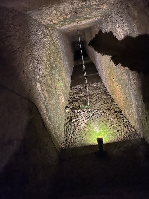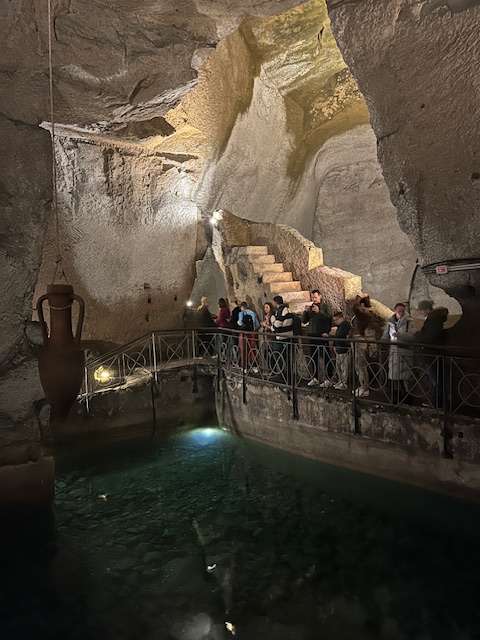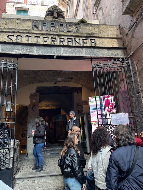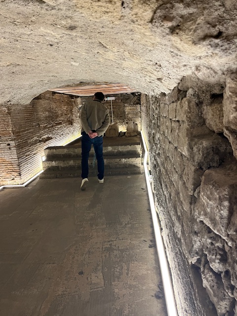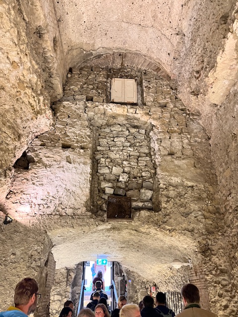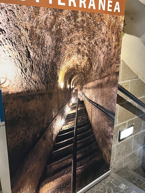 Underneath Naples are several ancient Greco-Roman reservoirs dug out from the soft tufo stone on which, and from which, much of the city is built. Approximately one kilometre (0.62 miles) of the many kilometres of tunnels under the city can be visited from the Napoli Sotteranea, this system of tunnels and cisterns underlies most of the city and lies approximately 30 metres (98 ft) below ground level. During World War II, these tunnels were used as air-raid shelters, and there are inscriptions on the walls depicting the suffering endured by the refugees of that era. We were here to visit those tunnels. My photographs show us entering and following the stairs underground for a long way. God only know how they got a tank down here or why they would keep unexploded munitions down here. The pictures of the narrow tunnels are in fact passageways for water and very easy to get lost as I almost did. At the end of the tour, we exited to visit the remains of Nero’s lost theatre rediscovered after restoration of the reservoirs.