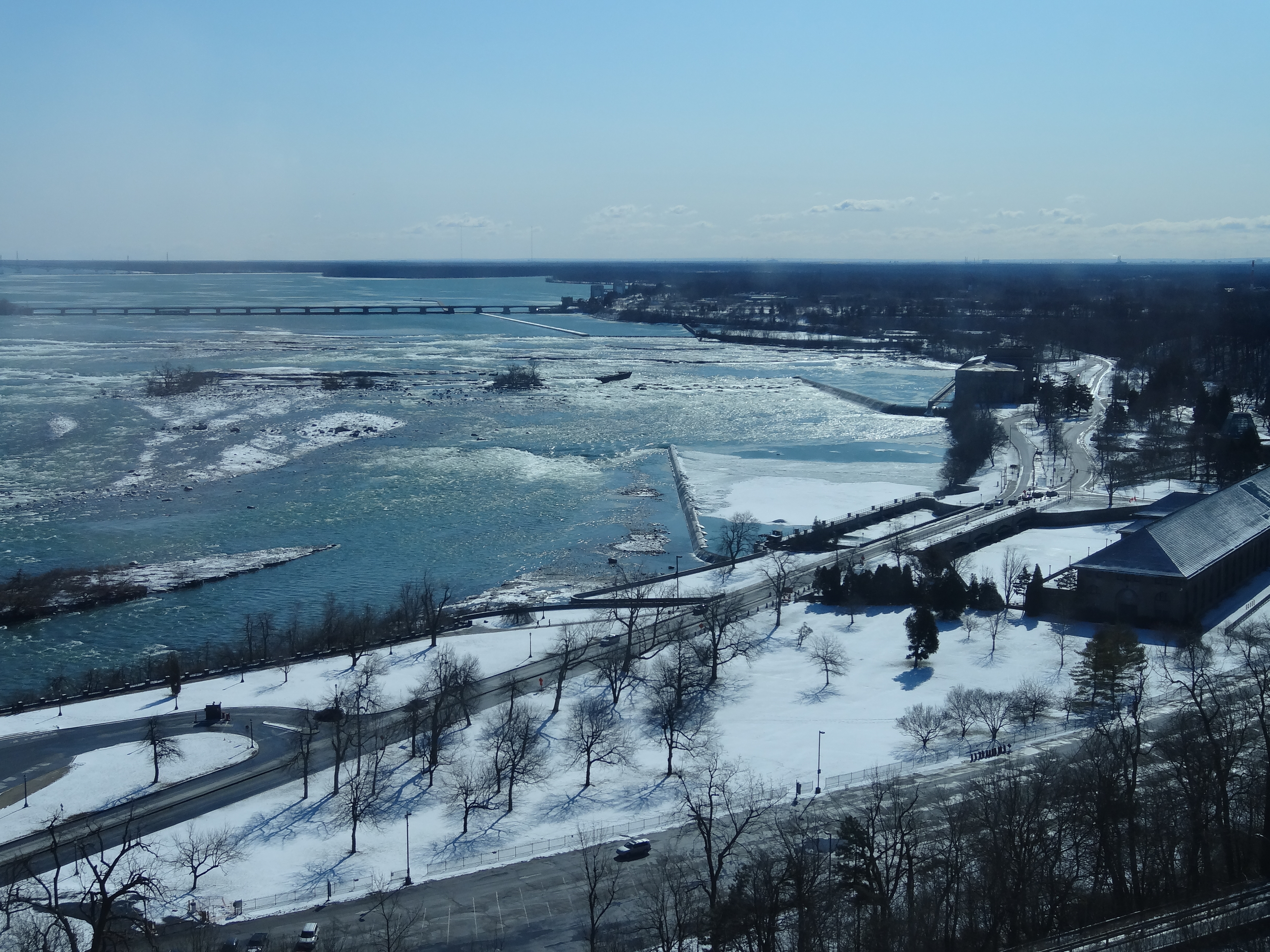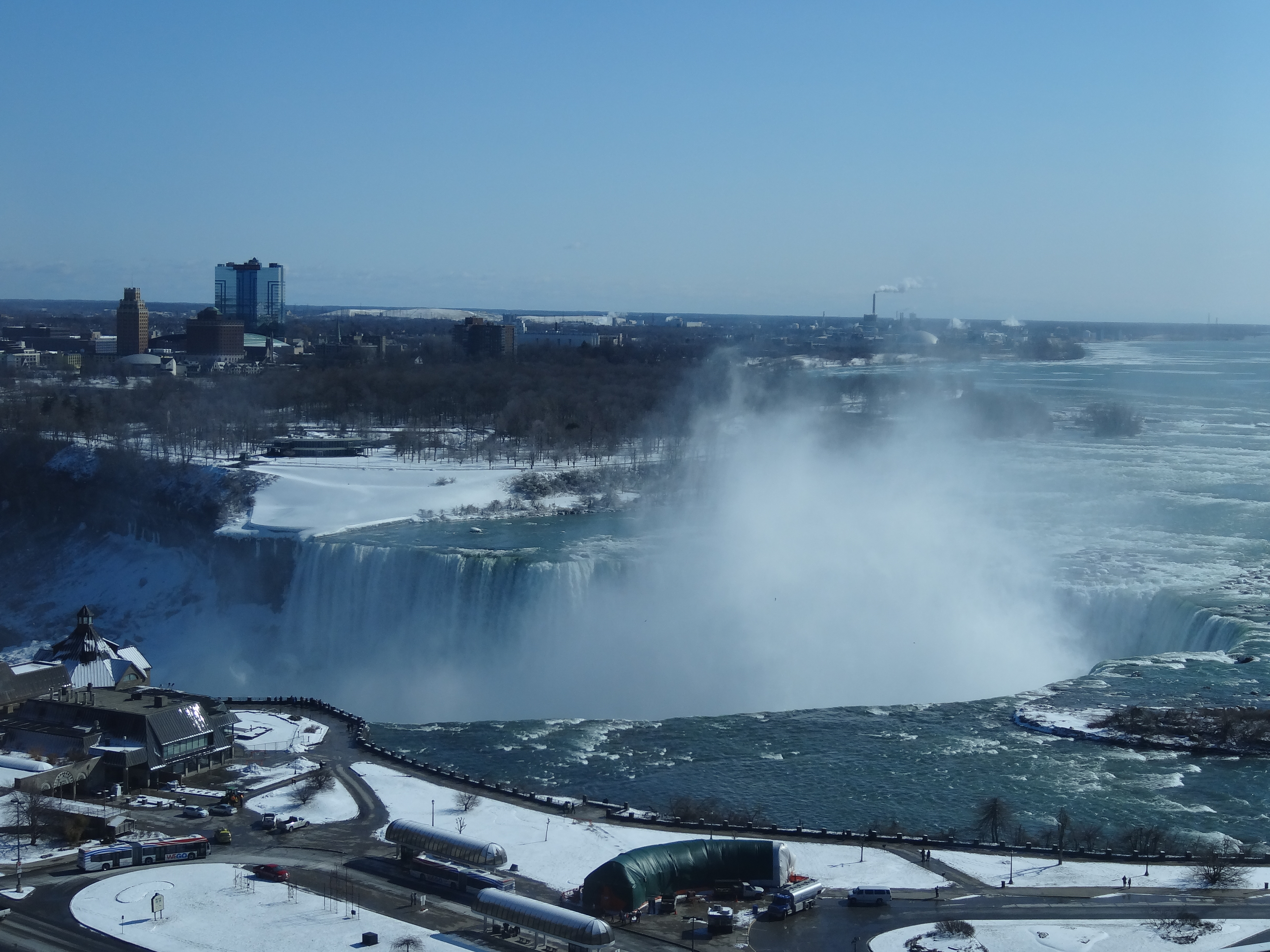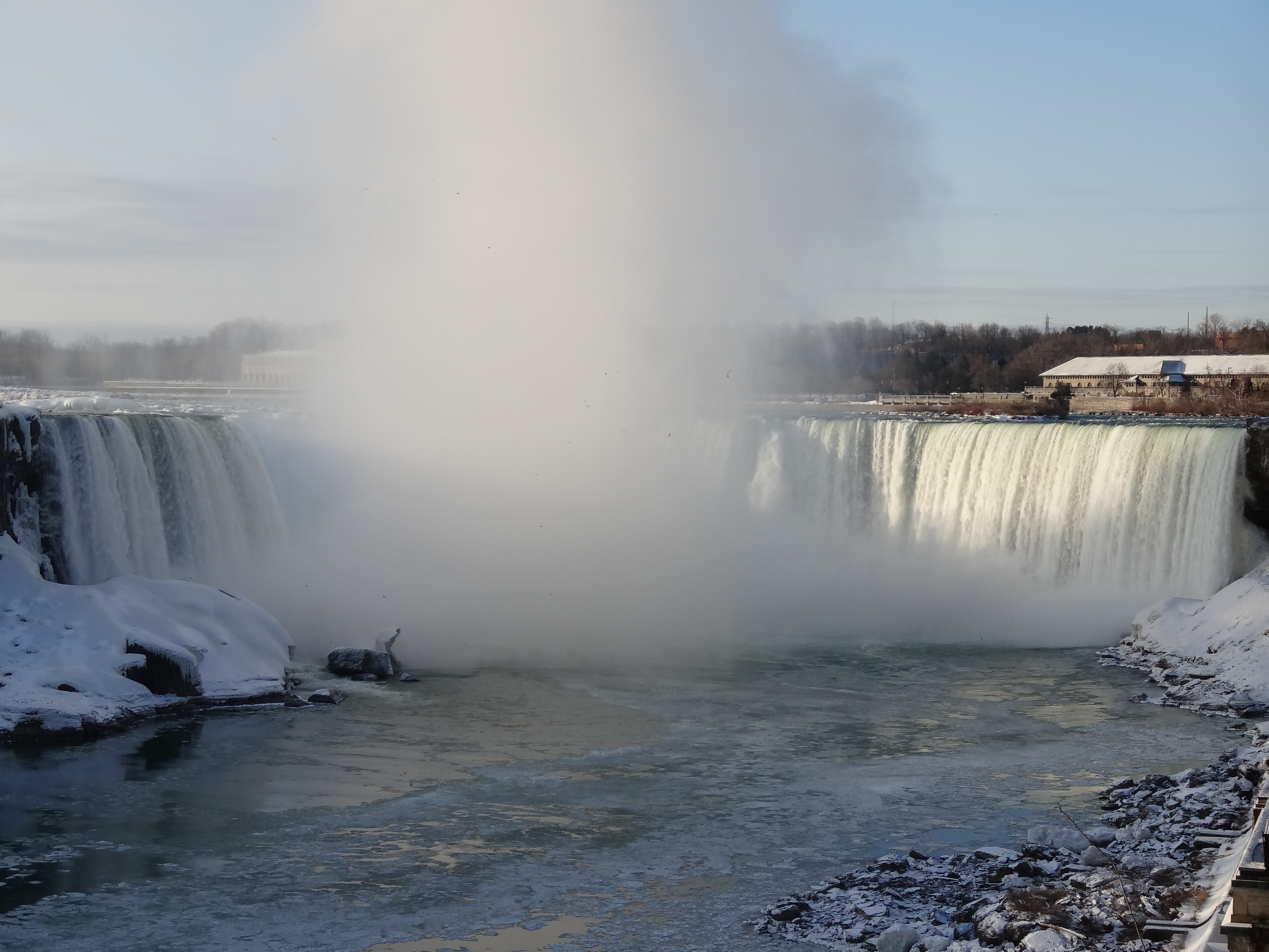 Up early next morning to see the Falls – mist and more mist. But there are two! The semi circular falls on the Canadian side and the USA falls and we could not see either clearly. Determined to see the Falls we set off on foot with brief directions from the staff. We discovered an alternate route (all usual routes being closed for winter!) through the Casino (YES a Casino). Even so it was a 20 minute walk to the edge of the Niagara River and our first view of the USA Falls and the Canadian Falls in the distance. But the camera died apparently I had to recharge the battery. So a further frosty walk up to the Canadian Falls (the weather was cold Kerry was Frosty) and what a sight to behold. Then a brain storm – we would walk back to the hotel and recharge the camera and come back by cab to the Falls on the way to the station.