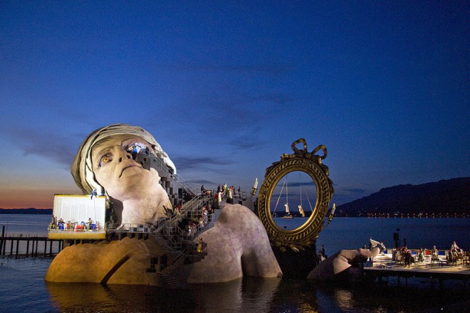 Our purpose in coming to Bregenz was to witness an opera perform on the Lake stage and Saturday evening was the date. We had difficulty finding the opening time and were impatient and anxious to get there. So, on the basis that the show would commence at 7.00pm we caught the bus into the city and walked to the theatre. Too early! We had arrived about 5.30pm and we learned the show started after sunset at 9.00pm, so we found seats and settled down at the Sunset Bar (a Rotunda on the end of a short pier in the lake) with a drink to wait for the show to commence at 9.00pm – yes I certainly got that wrong. We had a big lunch at that restaurant we found so we weren’t hungry, but it was going to be a long wait and as the wind picked up a cool evening. We even went and sat in our seats to wait for the show but that did not last long through boredom. Finally, about 8.30pm there was some movement to get the show on the road with the arrival of passengers from the cruise boats. We had purchased a souvenir blanket to keep out the cold wind that was rising and lined up to take our seats. There must have been over 1,000 people who finally took their seats and the show started at 9.00pm.