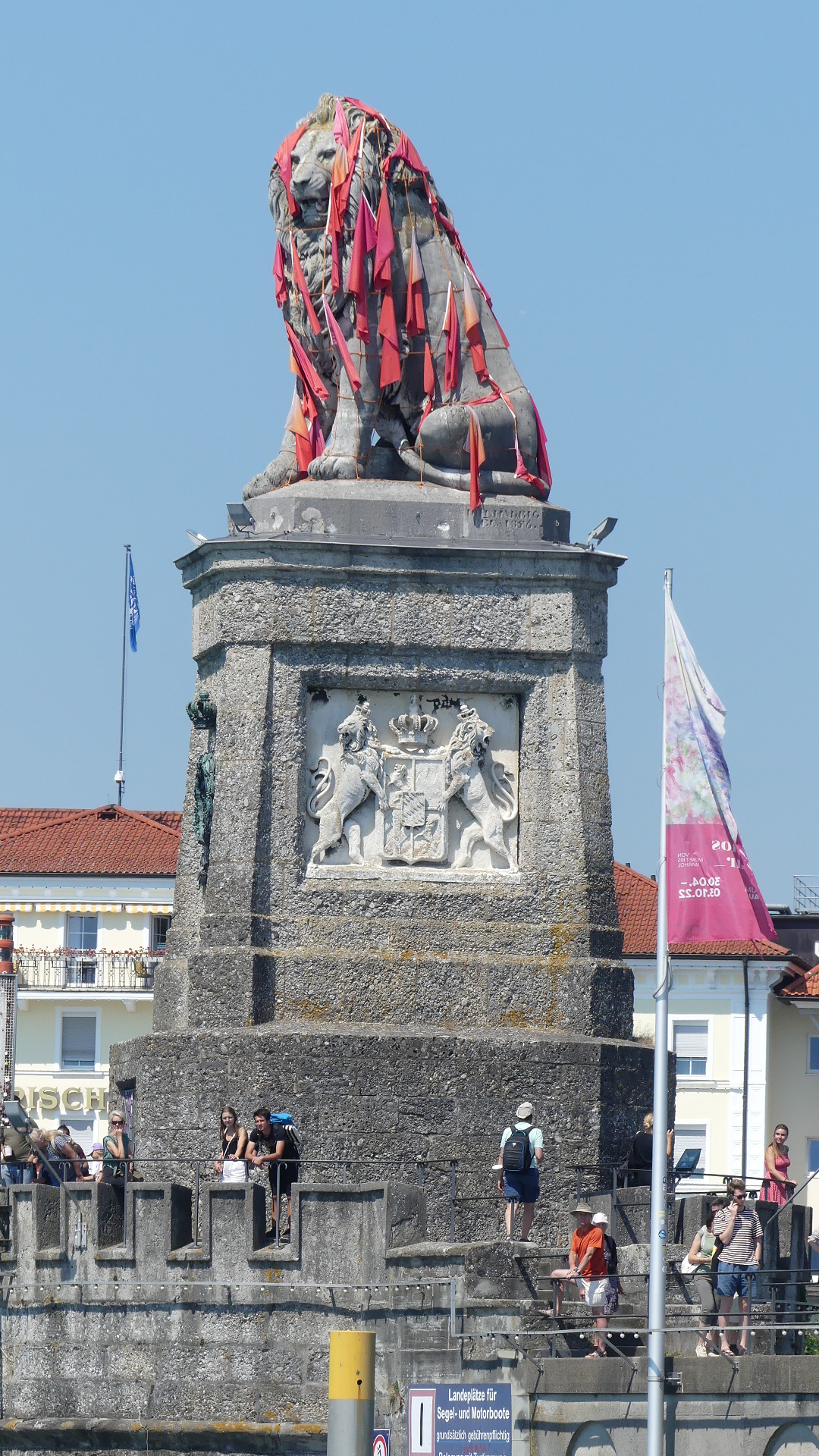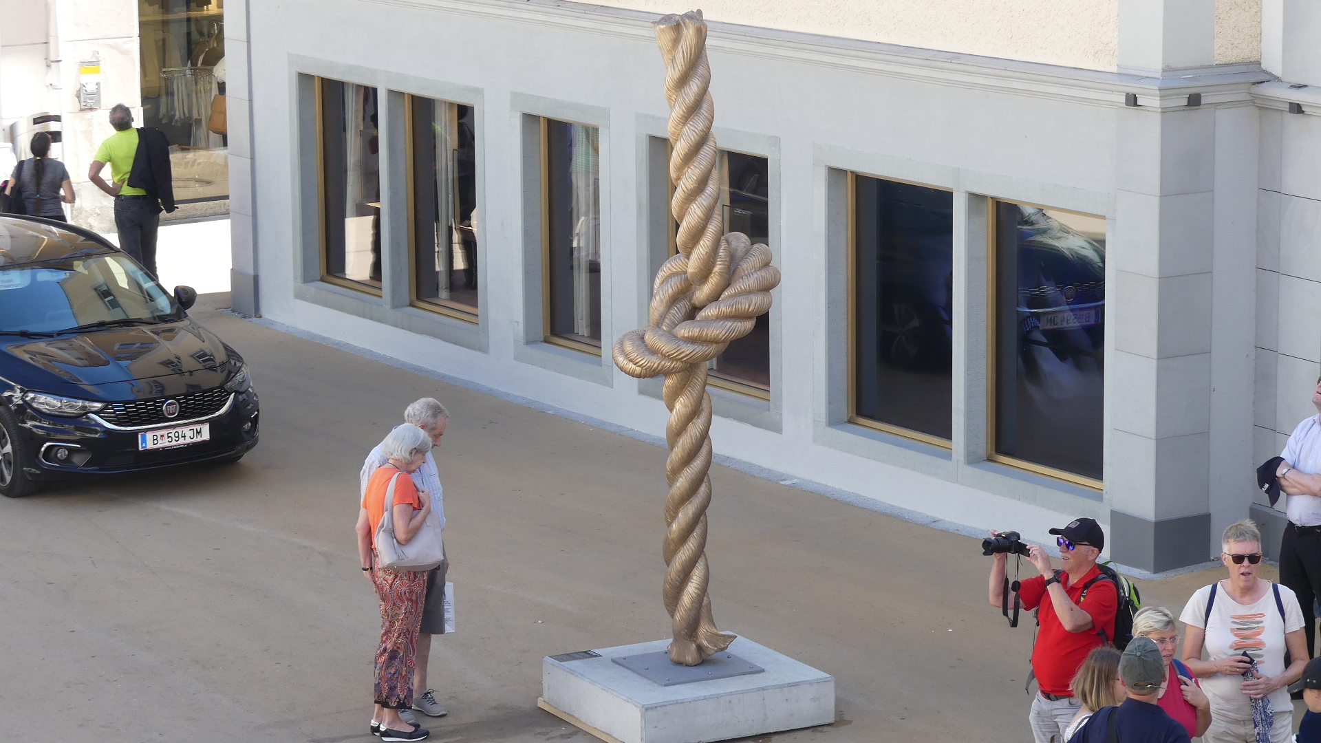 Several of the old town buildings are decorated with art works some portraying the first use of the building. In the main square stands the local parish church constructed with the eastern Christian church “onion” dome. Bregenz Summer Festival is on, so the streets are decorated with flags declaring that to be the case. In the case of these photos, they were taken when we had coffee at a restaurant above the square in one of the modern buildings which looks abhorrent and out of place. Like the monument to Indian Snake Charmers – the knotted rope statuary. No photo of the abhorrent building.