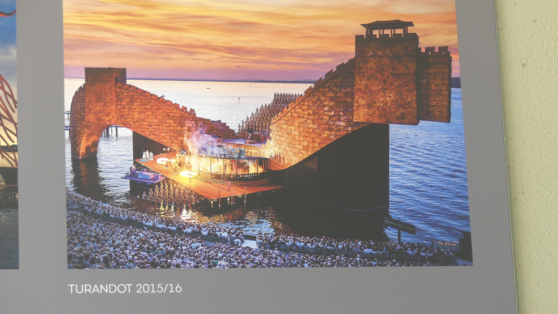 We are here for our wedding anniversary. Kerry promised herself to return and see a show at the Bregenz Theatre in the Lake after we had stumbled across it in 2015. In 2015 the Opera was “Turandot” and the stage was the Great Wall of China and the Terracotta Army. This year it was Puccini’s opera “Madame Butterfly”. The stage is a deceptively simple white background with hidden stairs doorways and a hole for an enormous flagpole. Under the stage (rows F, G & H) banners advertising the show and pictures of the previous stages hence the photo of the stage which we saw being constructed. This magnificent stage is built at the western end of the lakeside walkway with Bregenz Bahnhof (train station) behind it. There is no orchestra pit but rather the orchestra plays on a sound stage inside the auditorium behind the patrons seating. This outdoor seating is erected leaving space between seating and stage for boats containing parts of the stage scenery to sail past during the performance.
