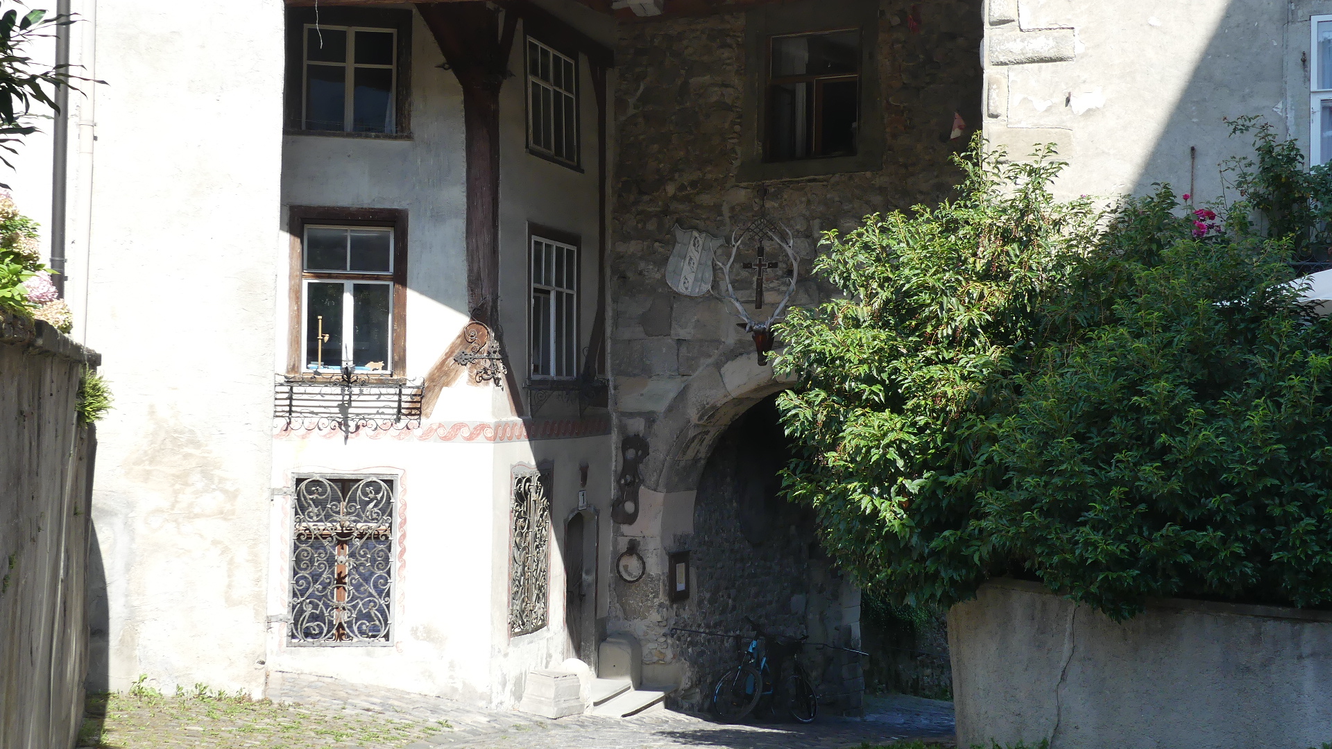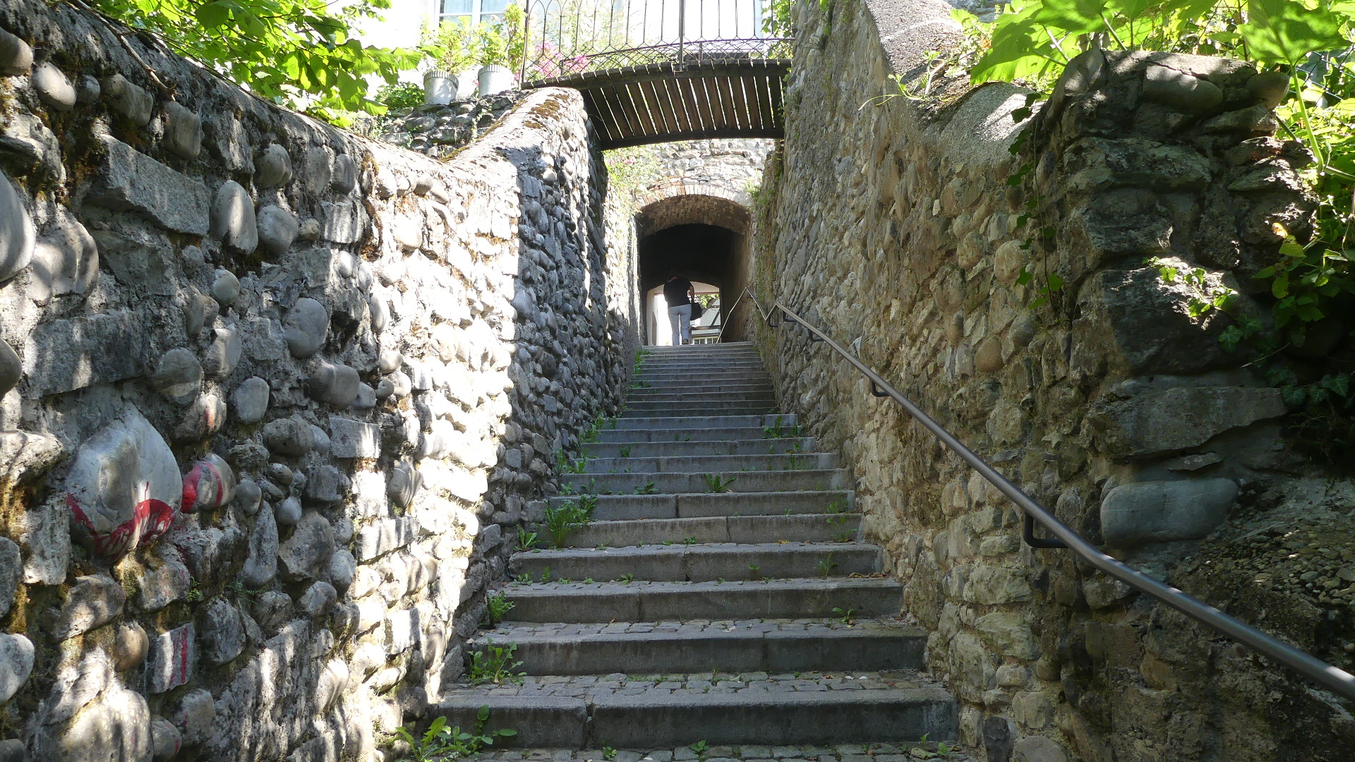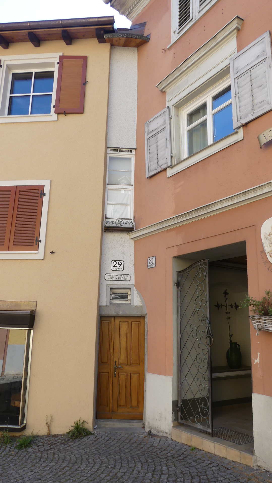 After the excitement of the boat trip, we decided to follow the self-guided tour provided by the Tourist Information Centre. Now the first stop was a shop selling various forms of alcohol. See the first photo below. Here I was persuaded to sample a Swedish single malt whisky (or do you spell it the Irish way “Whiskey”) and purchase 500ml of the brew – many of my friends will be clamouring for this. The next few photos depict some of the older buildings in the narrow streets of the old town. But number 5 is the front door of a residence which is little more than 1 metre wide at its entry – Bregenz’s smallest residence. Next is the adjoining building which appears to have been a type of craftsman’s lodge judging by the figurines displayed on the exterior. By the time we had climbed to the oldest part of the town we came across what might have been a moat around a fortified residence which proved to be a former monastery. The parish church although not connected was on the outside of the former moat but separated from surrounding land by its own moat. Inside was a clean and fresh-looking church and of course it had a confessional (you know whom I am referring to VC). After leaving the church we found a set of stairs which now allows movement between church and monastery which has been separated from the residences constructed where once monks would have toiled. The old castle gate remains with it an open portcullis and the track down to the town. In the town we found this strange feature on one block of residences – it looks like someone was buried but manage to stick their arm out of the coffin.