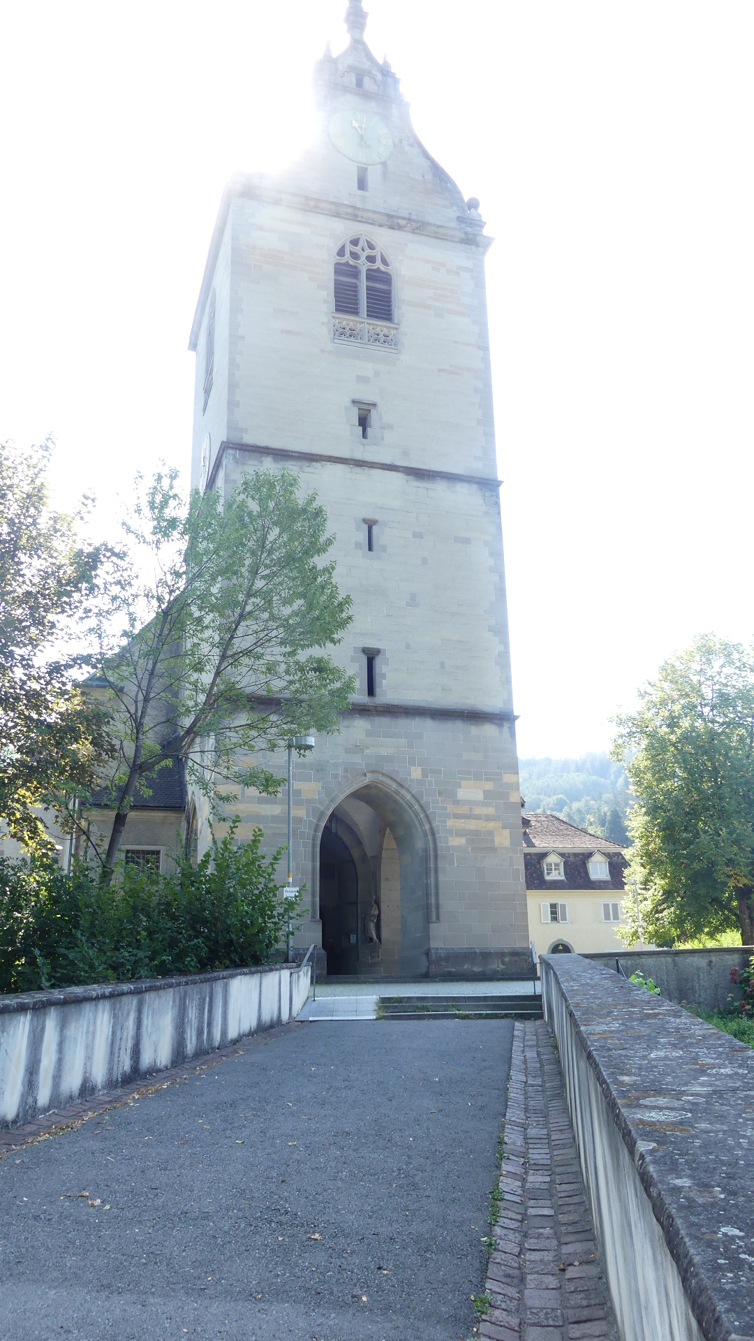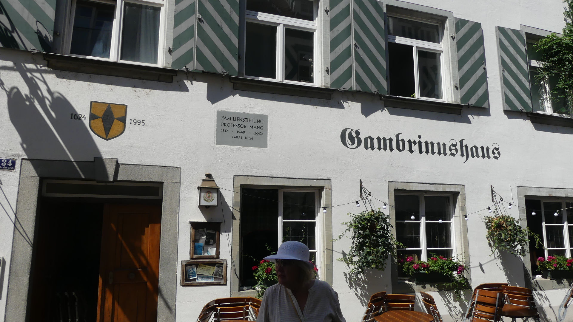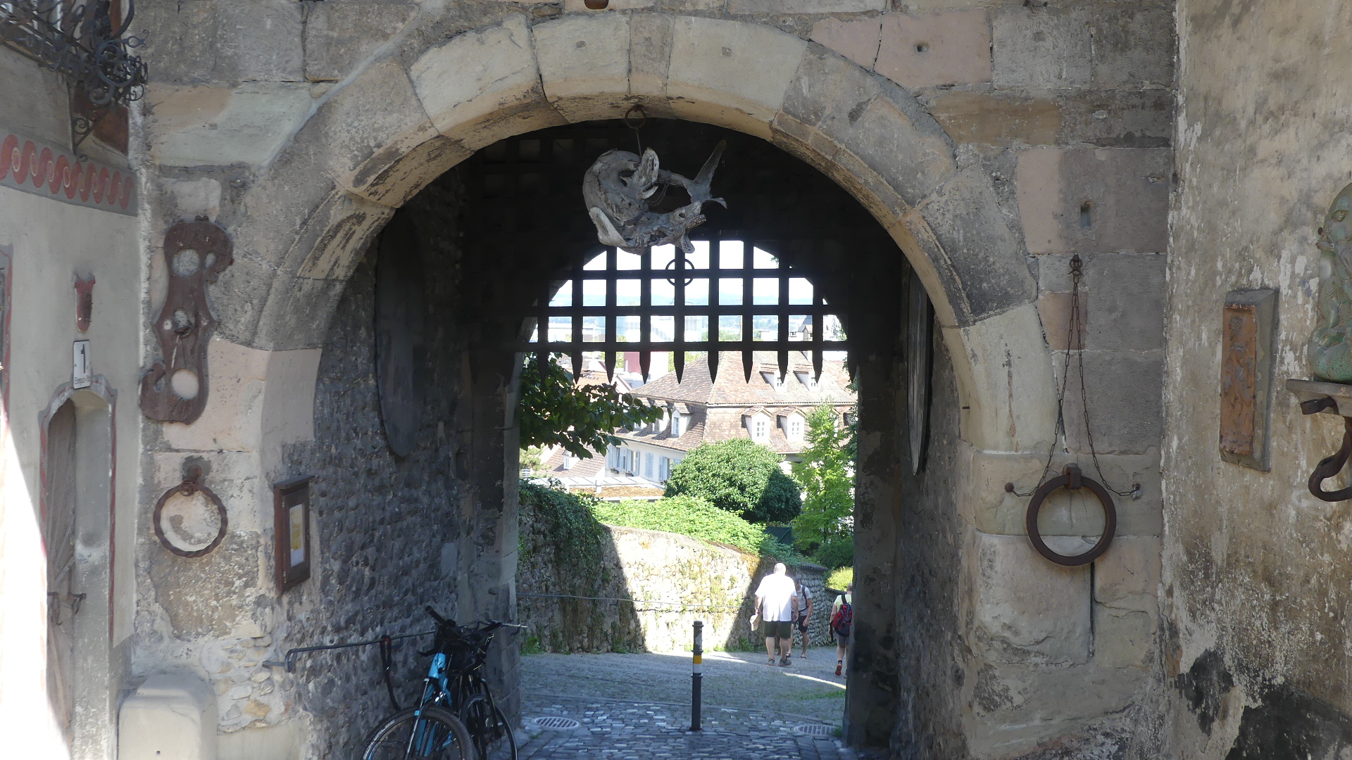 After the excitement of the boat trip, we decided to follow the self-guided tour provided by the Tourist Information Centre. Now the first stop was a shop selling various forms of alcohol. See the first photo below. Here I was persuaded to sample a Swedish single malt whisky (or do you spell it the Irish way “Whiskey”) and purchase 500ml of the brew – many of my friends will be clamouring for this. The next few photos depict some of the older buildings in the narrow streets of the old town. But number 5 is the front door of a residence which is little more than 1 metre wide at its entry – Bregenz’s smallest residence. Next is the adjoining building which appears to have been a type of craftsman’s lodge judging by the figurines displayed on the exterior. By the time we had climbed to the oldest part of the town we came across what might have been a moat around a fortified residence which proved to be a former monastery. The parish church although not connected was on the outside of the former moat but separated from surrounding land by its own moat. Inside was a clean and fresh-looking church and of course it had a confessional (you know whom I am referring to VC). After leaving the church we found a set of stairs which now allows movement between church and monastery which has been separated from the residences constructed where once monks would have toiled. The old castle gate remains with it an open portcullis and the track down to the town. In the town we found this strange feature on one block of residences – it looks like someone was buried but manage to stick their arm out of the coffin.