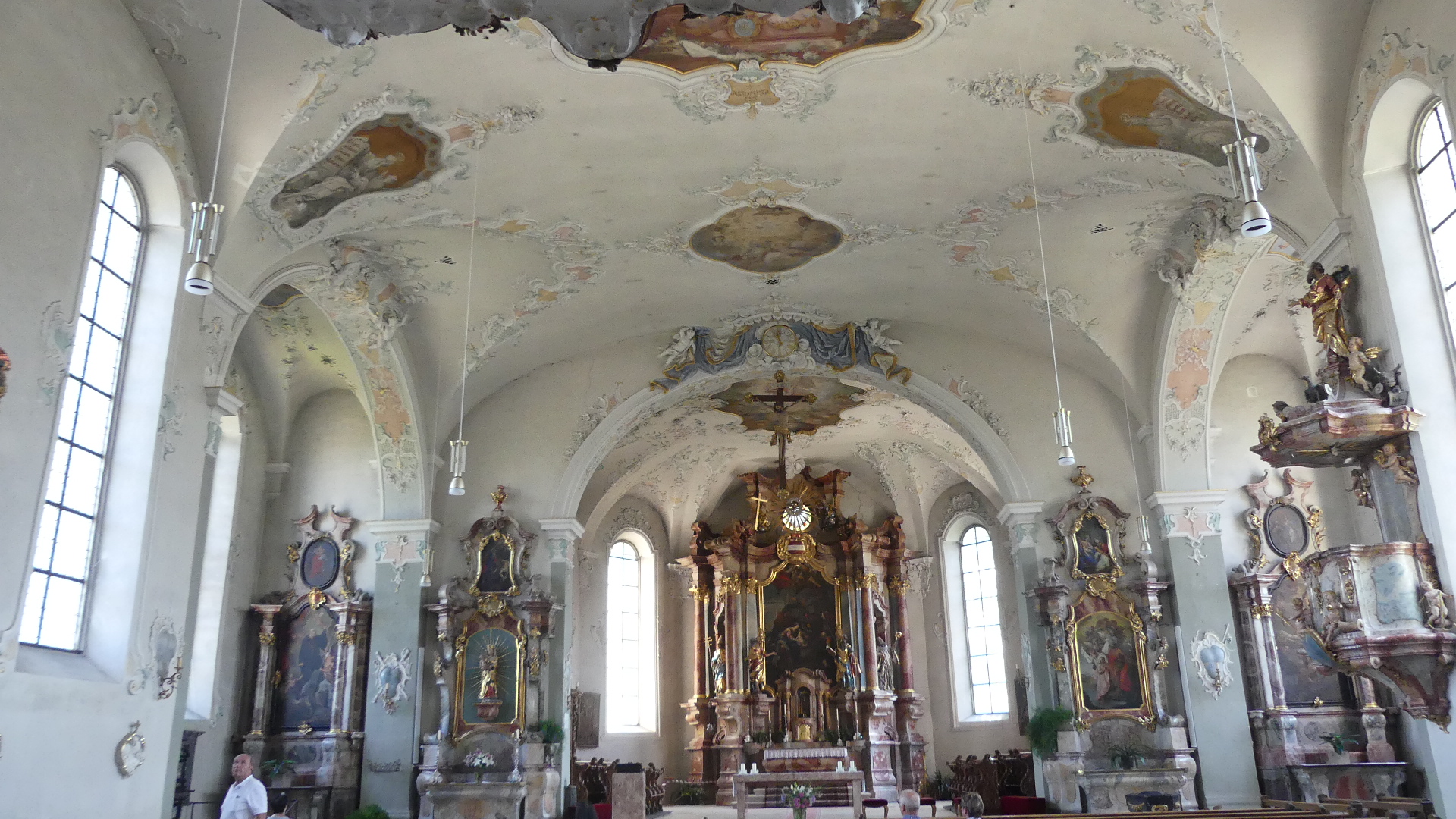 We had not been impressed with the boat tour so the following day we tried direct travel to selected places; Lindau Isel (Lindau Island) and Fredrickschafen in the Bavarian-Swabian part of Germany. By ferry Bregenz to Lindau Isel takes 1 hour and 2 hours to Friedrichshafen and we were to find out only 20 minutes by train to Lindau. We purchased a return journey on the ferry to Lindau and on the trip, we spotted a modern Zepplin (Dirigible balloon). Arriving at Lindau Is. visitors are greeted by a resting lion and lighthouse from the early days of trading between villages. A tower which formed part of the defences of the harbour also remains. The foreshore is hotels and restaurants, and everyone had the same idea as us to visit the island. The pictured building is the Rathaus or Local Government Hall. The other photos are general street scenes. This is an island, and it is connected by a causeway to the mainland. Near that causeway bridge we found the remnants of a church predating the 11th century. The Peterskirche is the oldest sacred building in the city of Lindau. The essentially Romanesque church goes back to the 11th century and is of supraregional importance due to late Gothic wall paintings often attributed to Hans Holbein the Elder. It stands on the western outskirts of the old town and has housed a war memorial in the form of a WW1 German soldier since the 1920s.