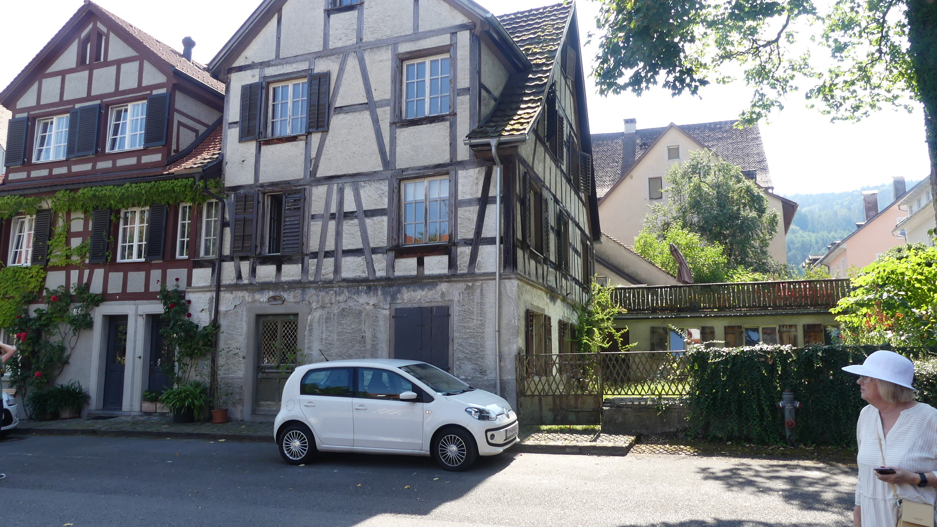After returning to the town level, we walked along one of the streets bounding the old town so there was a mixture of old and new. Amongst the houses we encountered a parked car with a car cover over it clearly been there for years: so long in fact the town has declared it street art and posted a sign about the “artist”. It is all in German with no English note but our enquires lead us to understand that some local “artist” bought himself a new Porsche and was disappointed with it, so he put the cover over it and walked away. This was in 1947. His studio is beside it and an eclectic bunch of stuff sits in the yard of the studio.