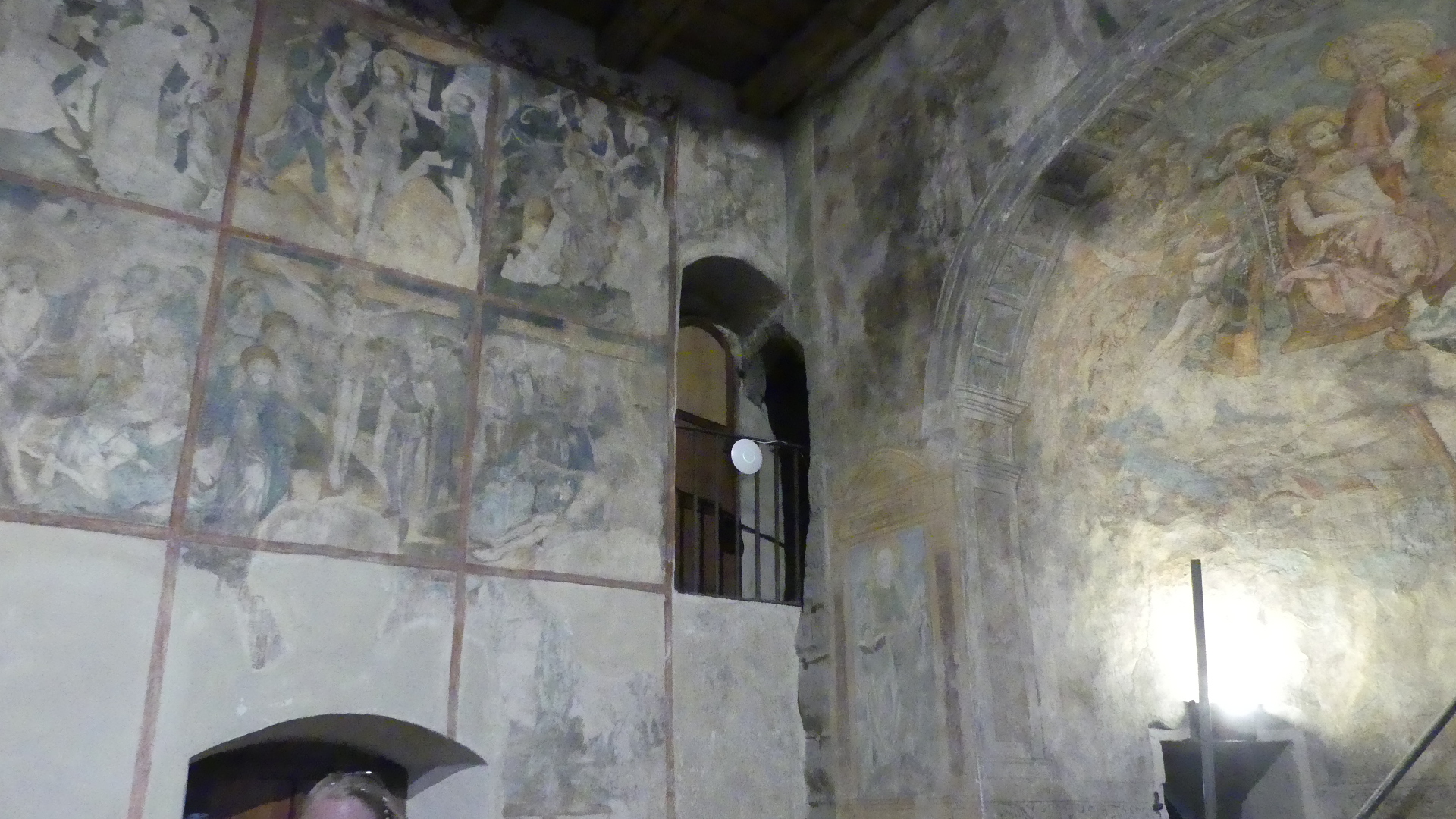 We had sought Robert’s local knowledge on places to go in drafting our itinerary but Robert saw our itinerary as fluid. So our next trip was not on our itinerary. We took a train to L’Aquila. We caught the train through a valley bordered by high snow capped mountains in an old two carriage rail motor containing first class and second class (of course we rode in “first class”). We arrived and stumbled off into a pretty, and well organised and clean square with an old church with a relatively unadorned interior, but some old frescoes had been exposed to show its age. The design of all these old villages is that it sits atop a hill, and we found the hill.