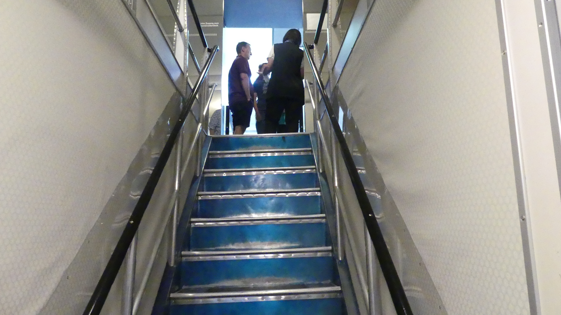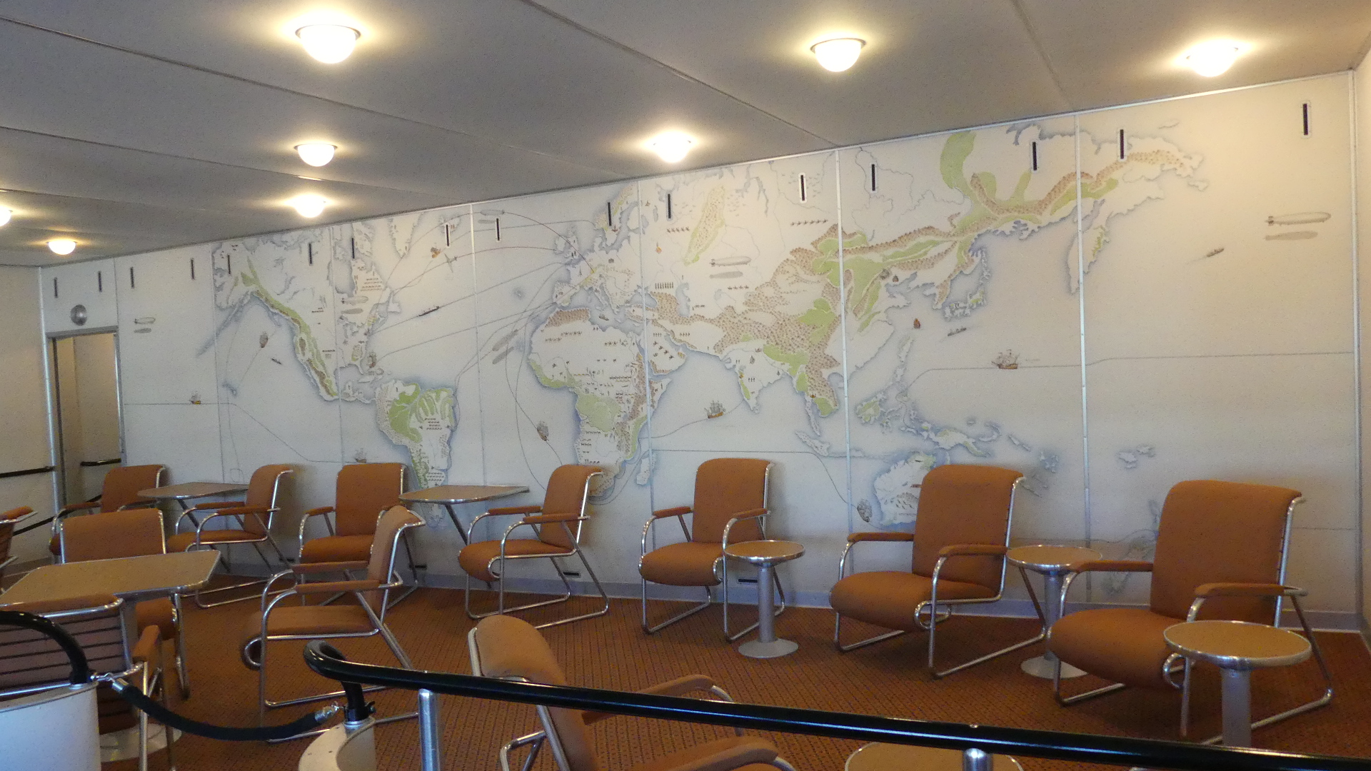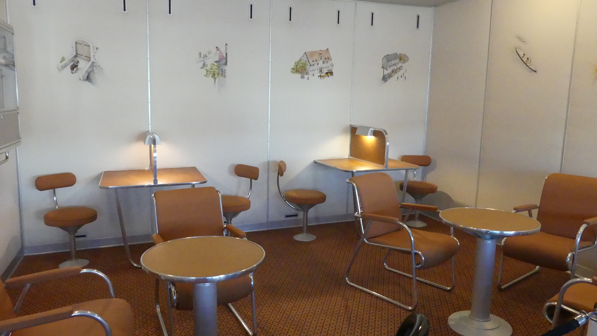 After the impressive overview of the partial model from the outside, the folded-down retractable aluminium stepladder invites visitors to go on board. It leads into the lower deck, the B-deck, which has a bar, a smokers’ lounge, and toilets. The passenger cabins are arranged on two decks, stacked one on top of the other. In the cabins, visitors can experience the special inside ambience of a 1930s airship and get to know the technical aspects of this aircraft. The beds inside the cabins are made of aluminium. Every cabin has a wall-hung wash basin (with running hot and cold water from a tap), a curtained wardrobe niche, a folding table, a stool, and a ladder for climbing into the upper bunk. The cabins also have electrical lighting and are ventilated and heated.